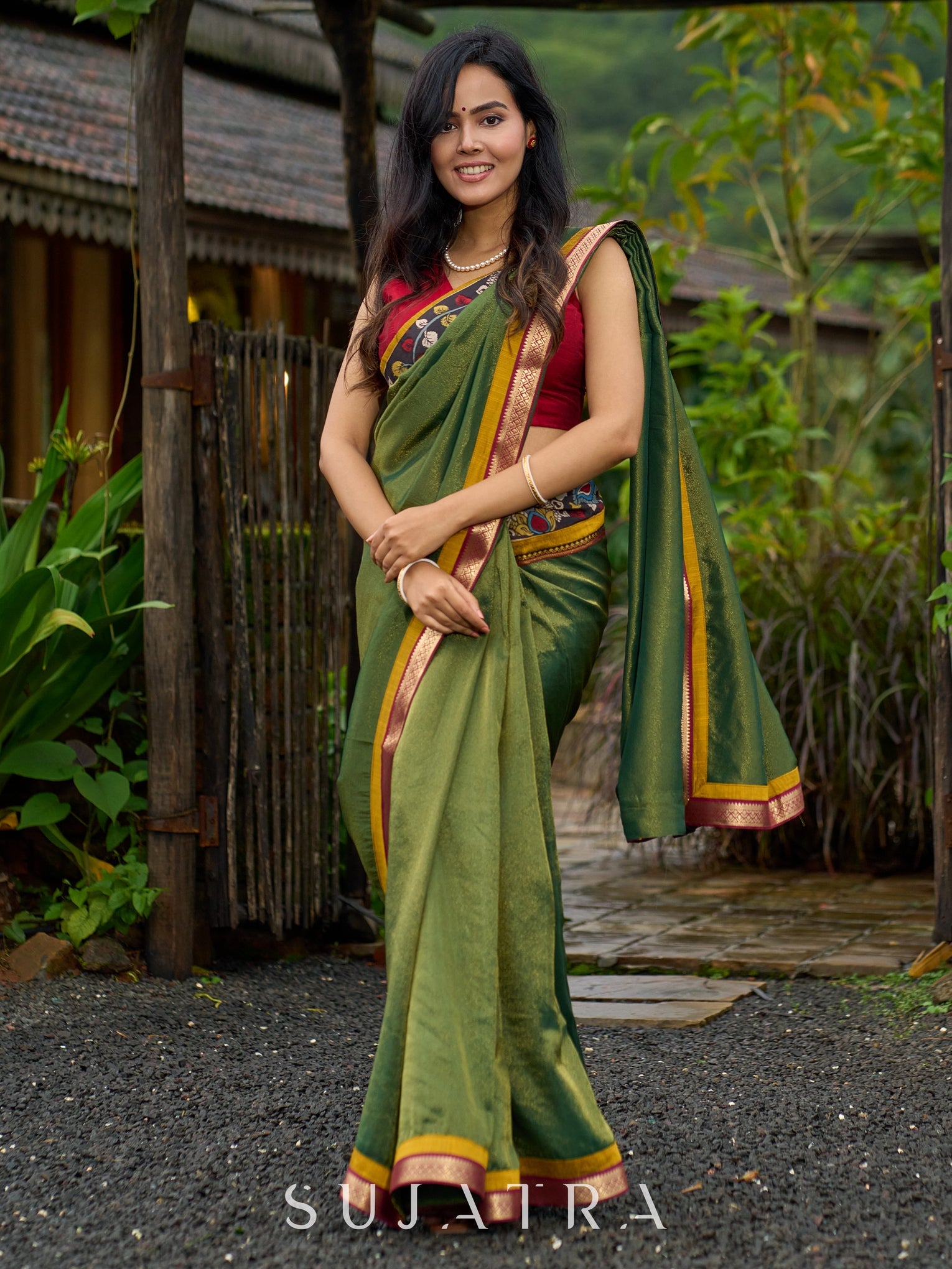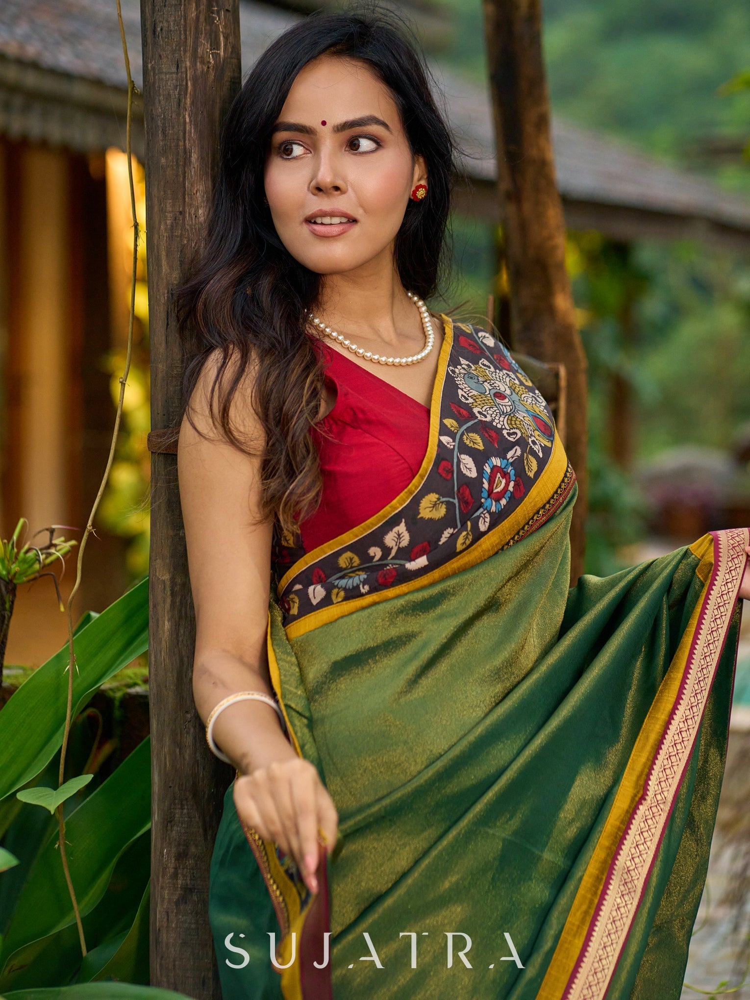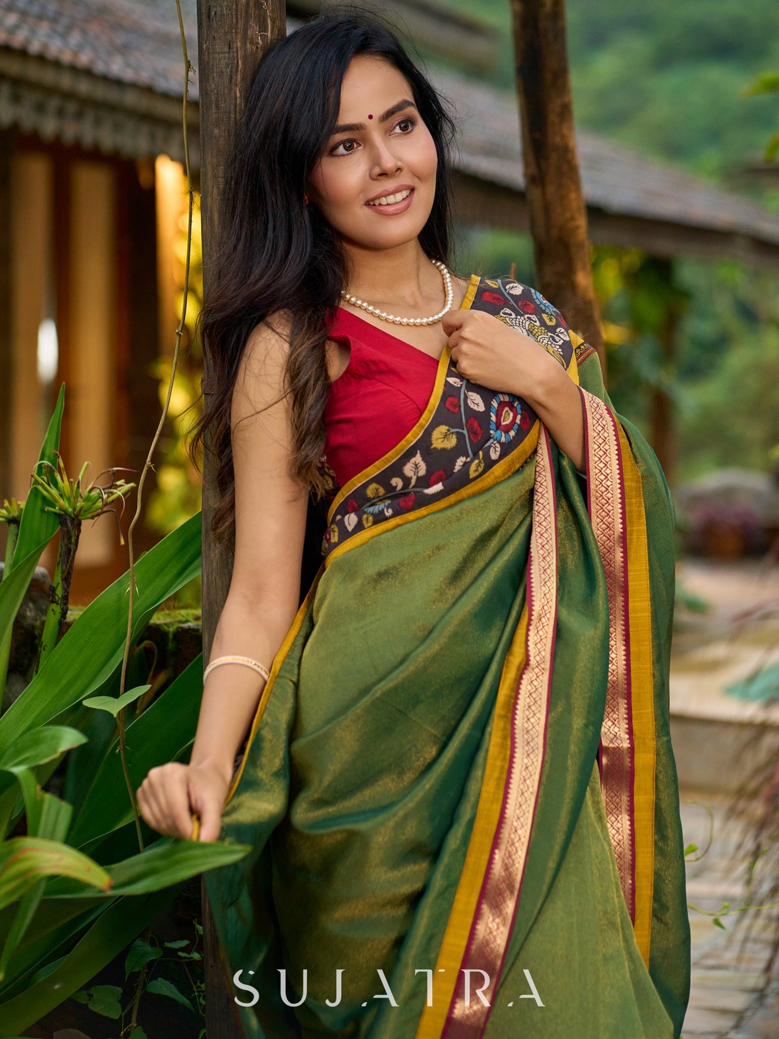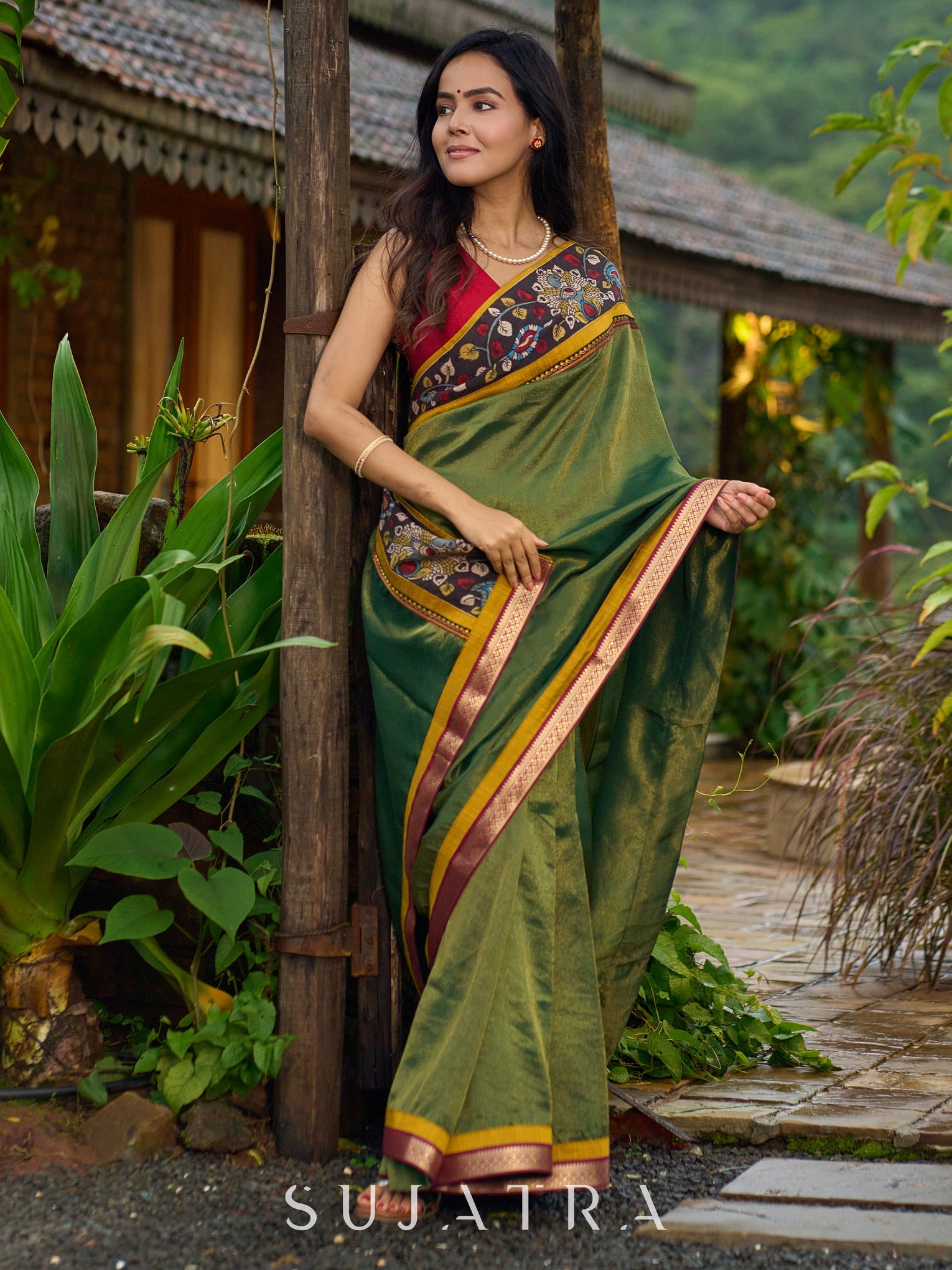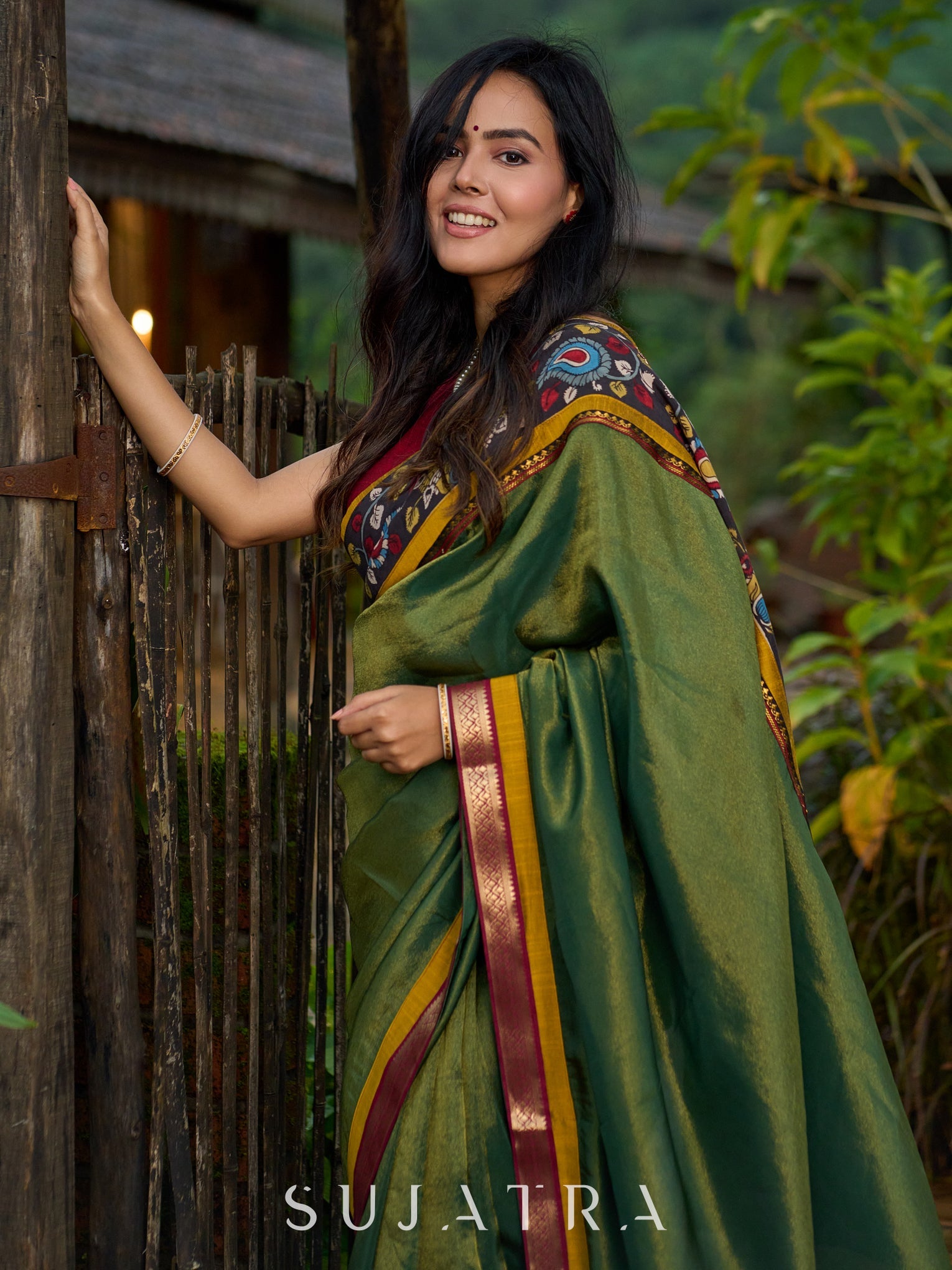 Exclusive green tissue saree with hand painted kalamkari borders & maharashtrian khun border