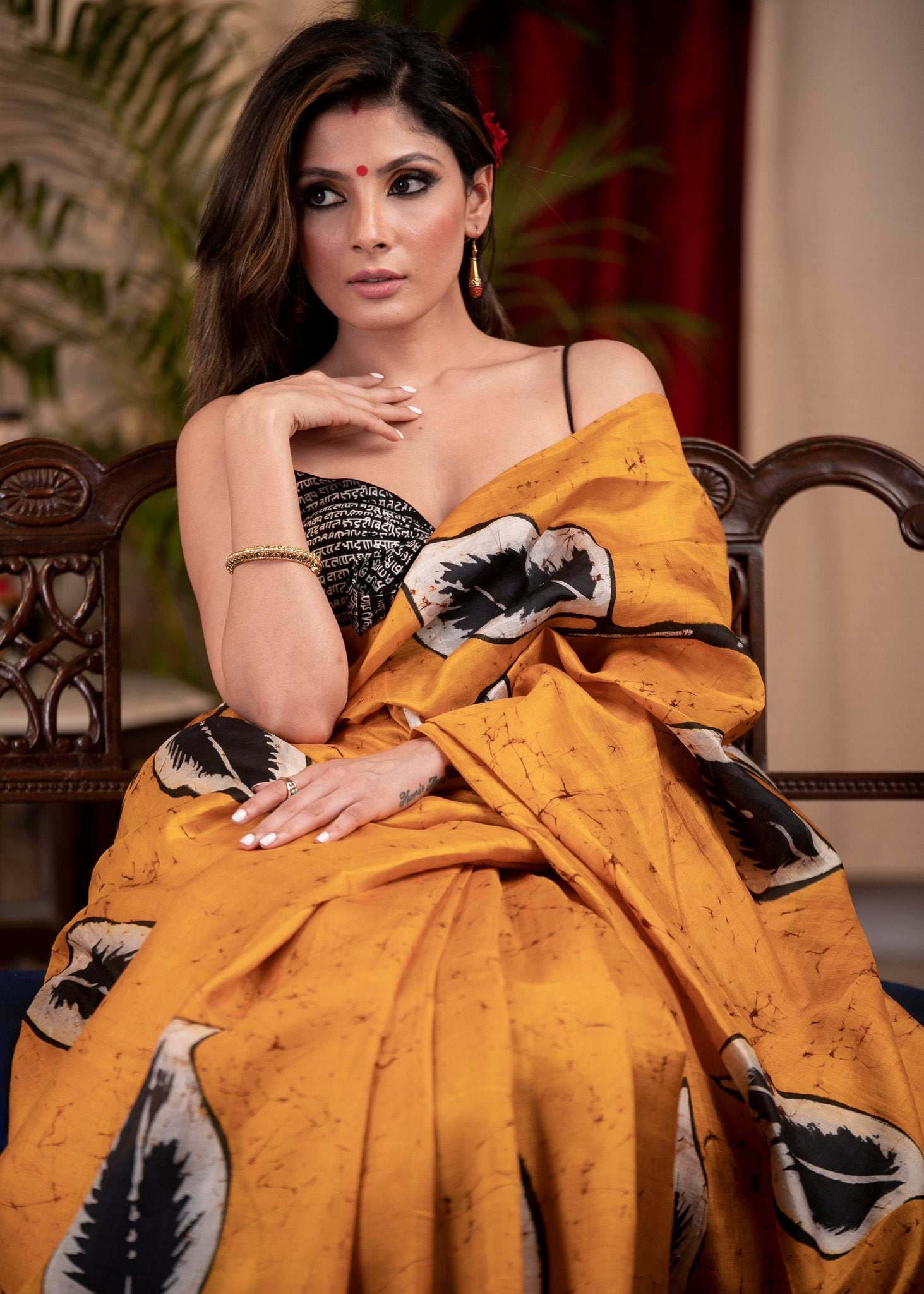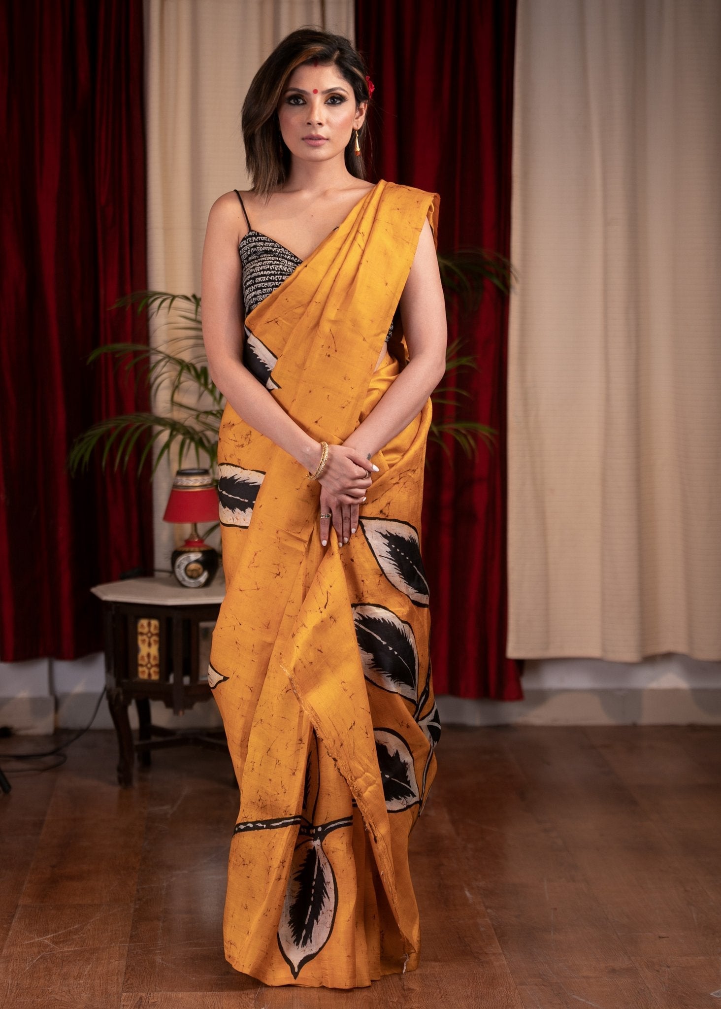 Exclusive hand batik pure silk mustard saree with abstract leaf motifs