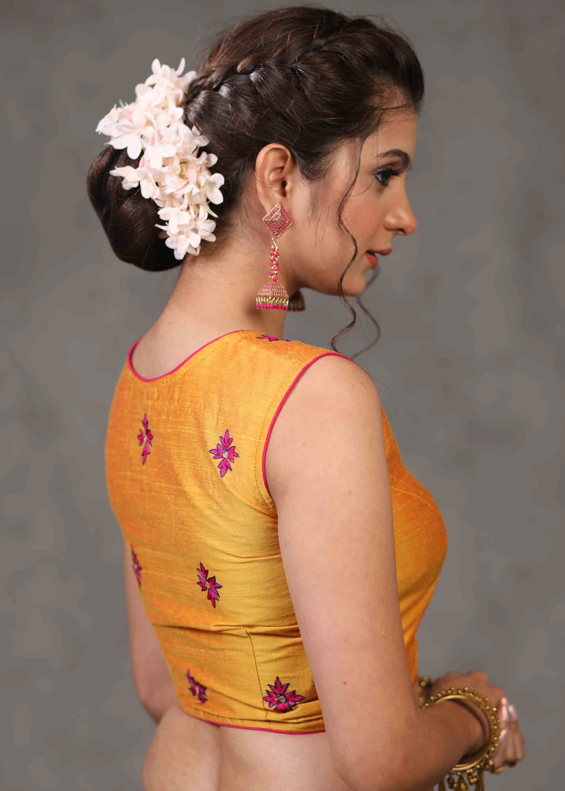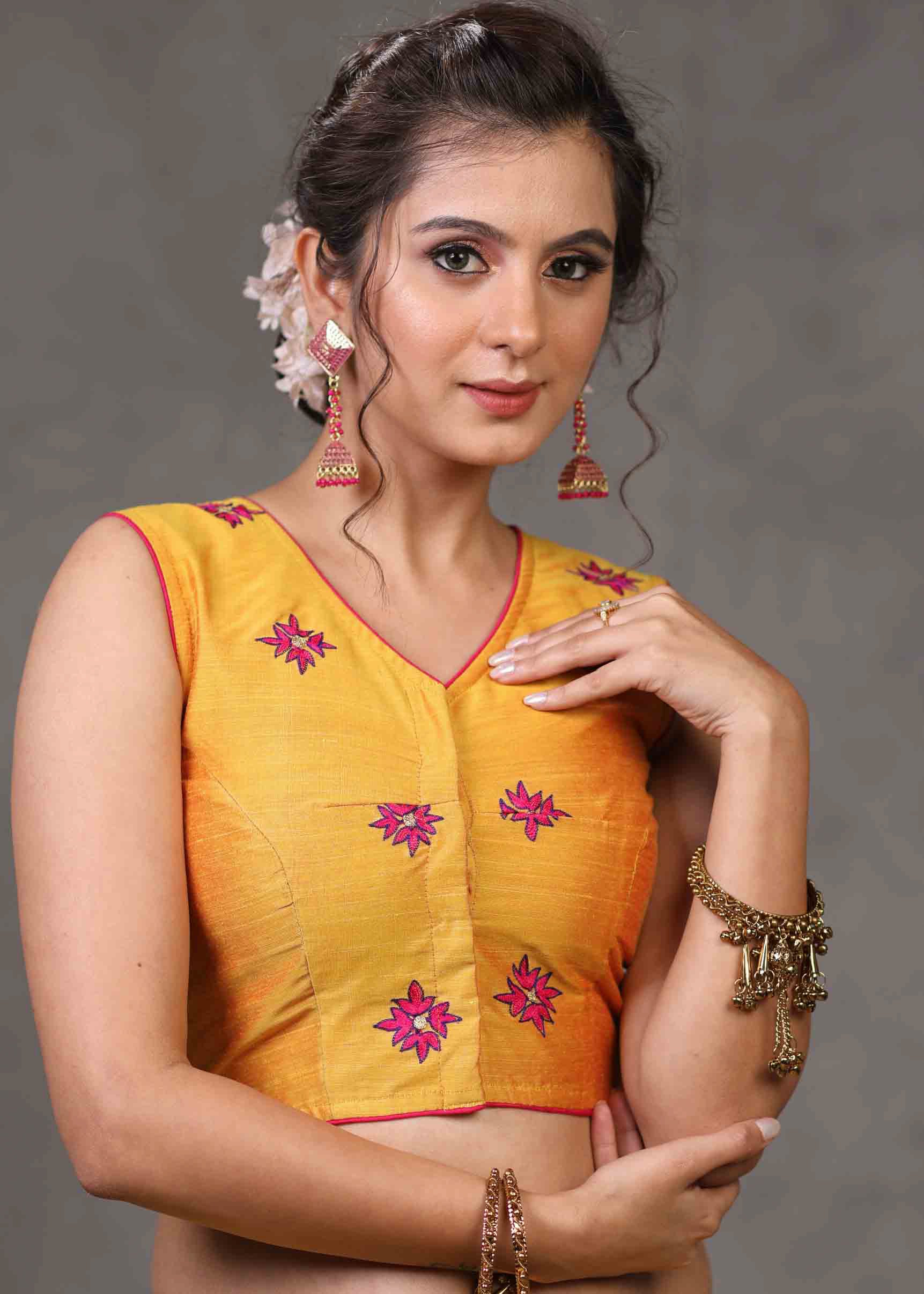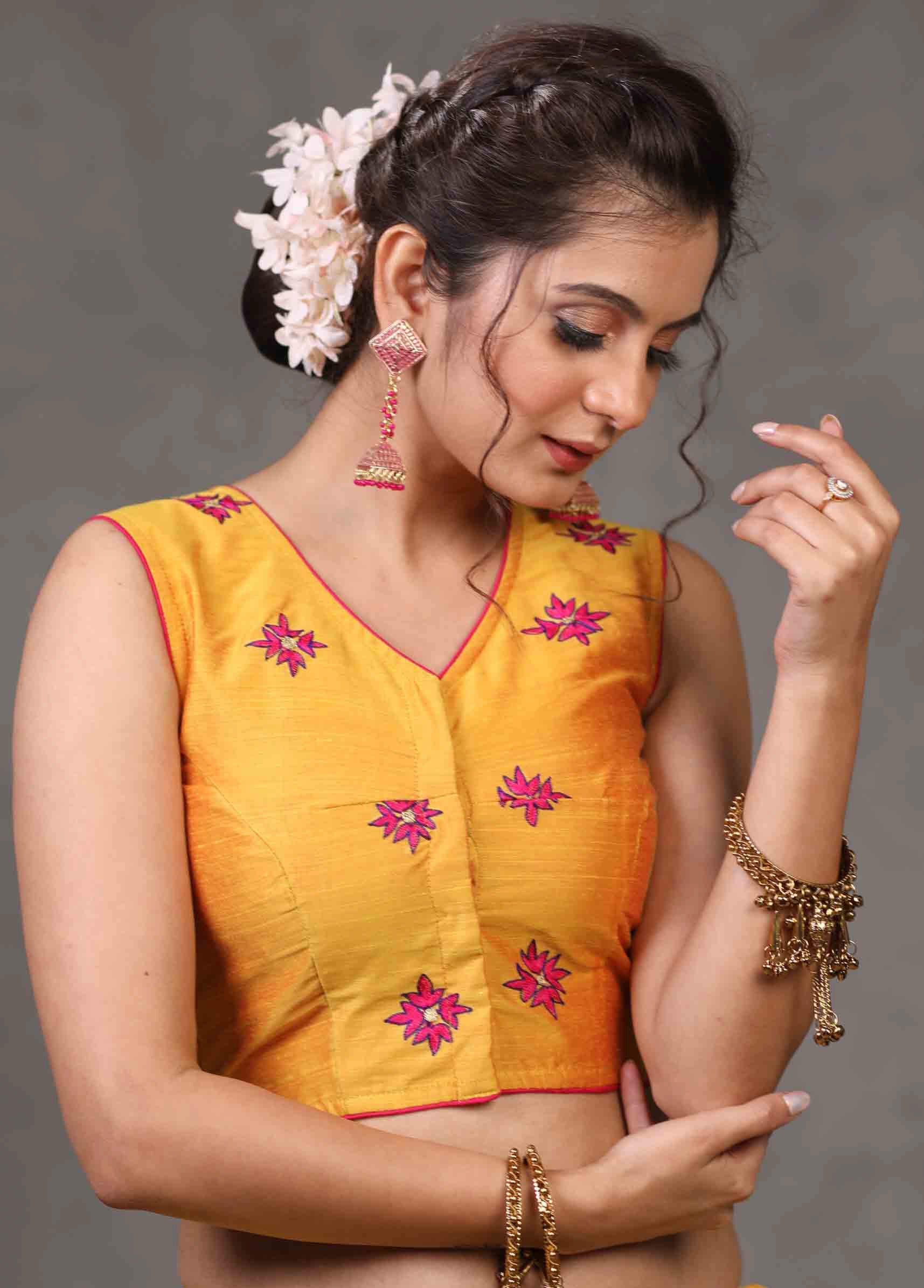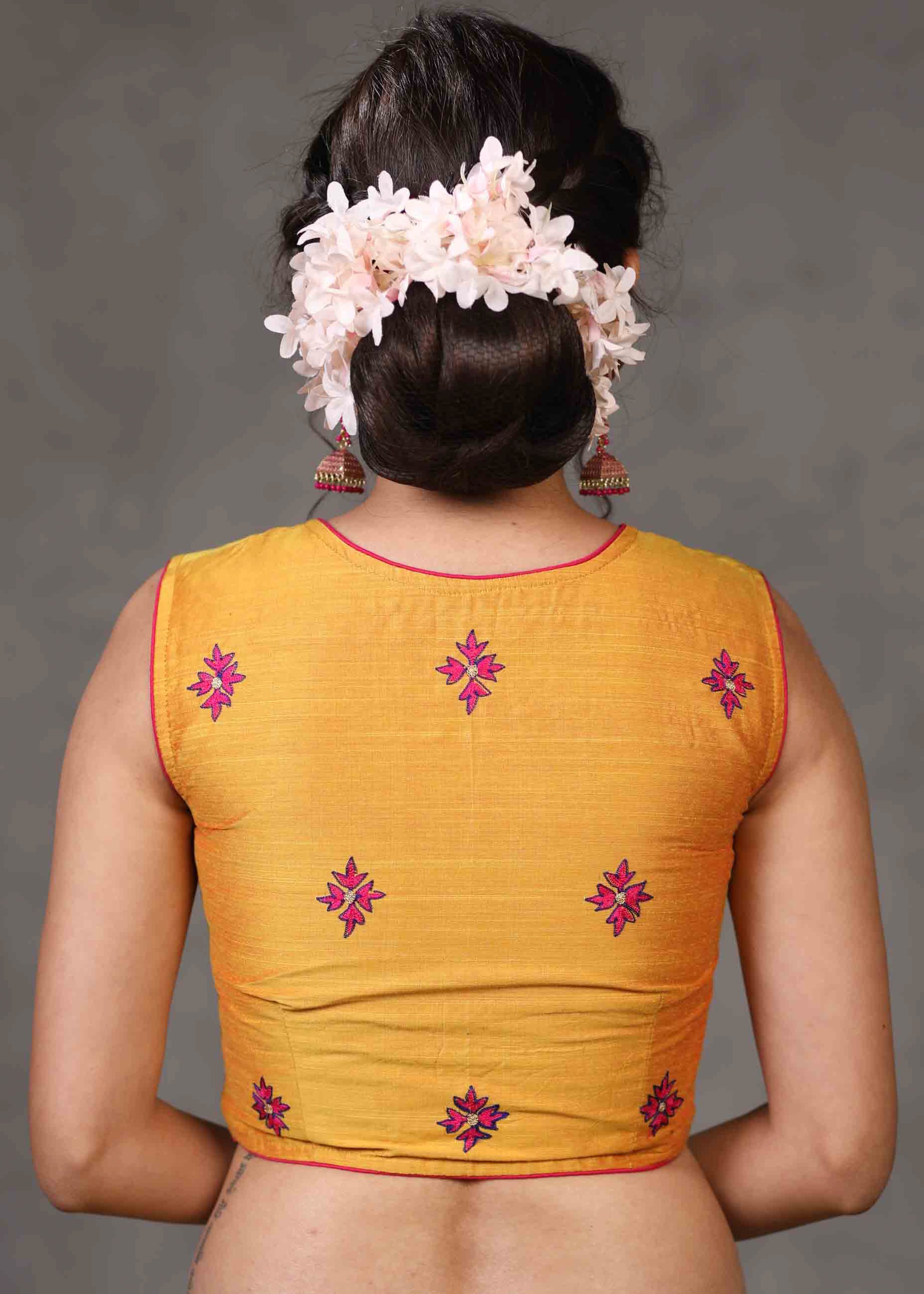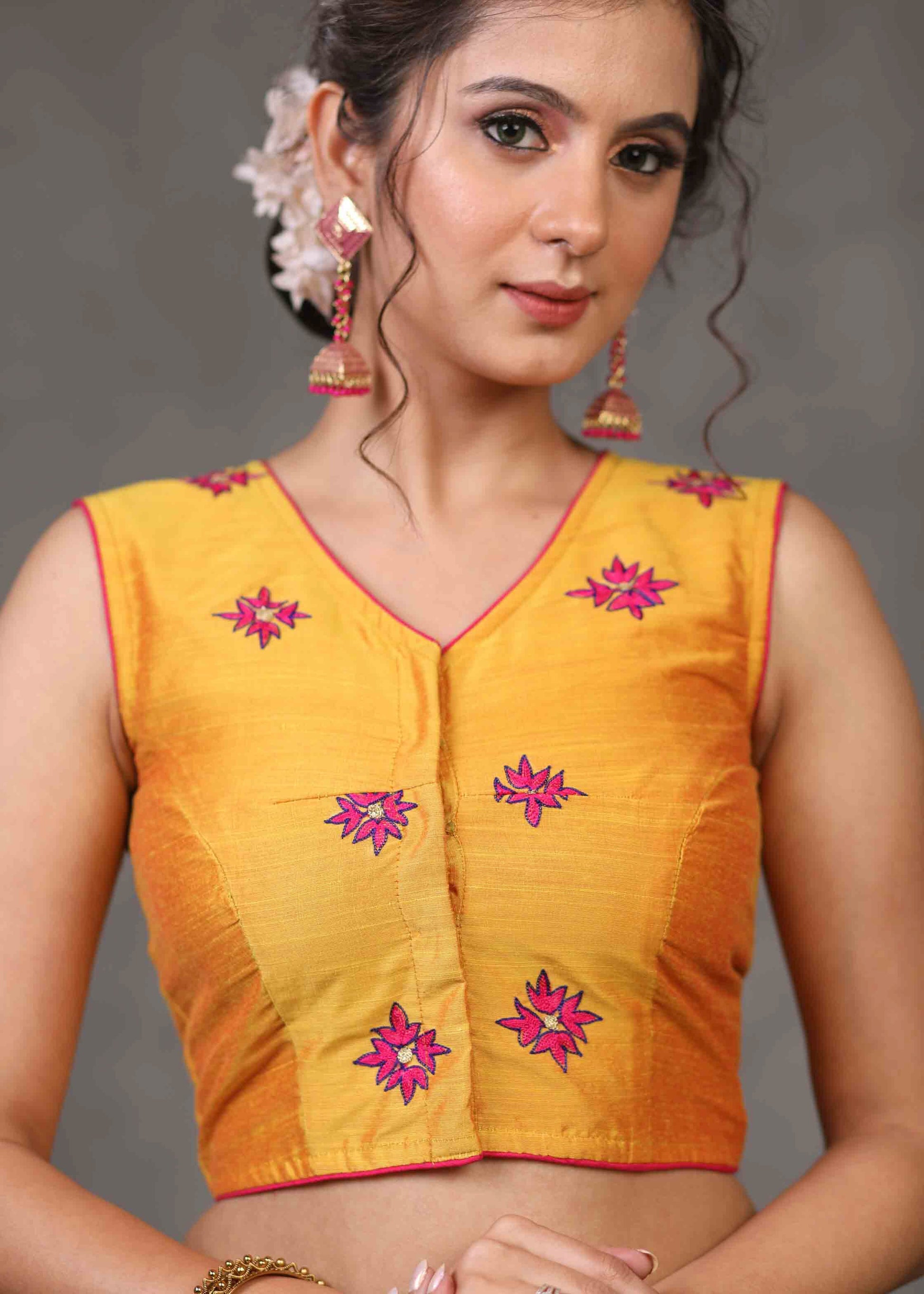 This exclusive sleeveless blouse combines the natural comfort of cotton silk with intricate floral embroidery, creating a refined and elegant look. Its vibrant yellow hue enhances the detailed overall floral patterns, making it a standout piece for sophisticated occasions. Designed for both style and breathability, this blouse offers a perfect balance of traditional craftsmanship and contemporary fashion.
