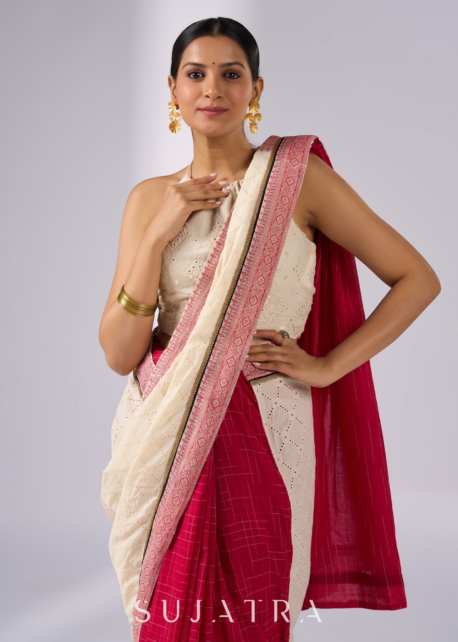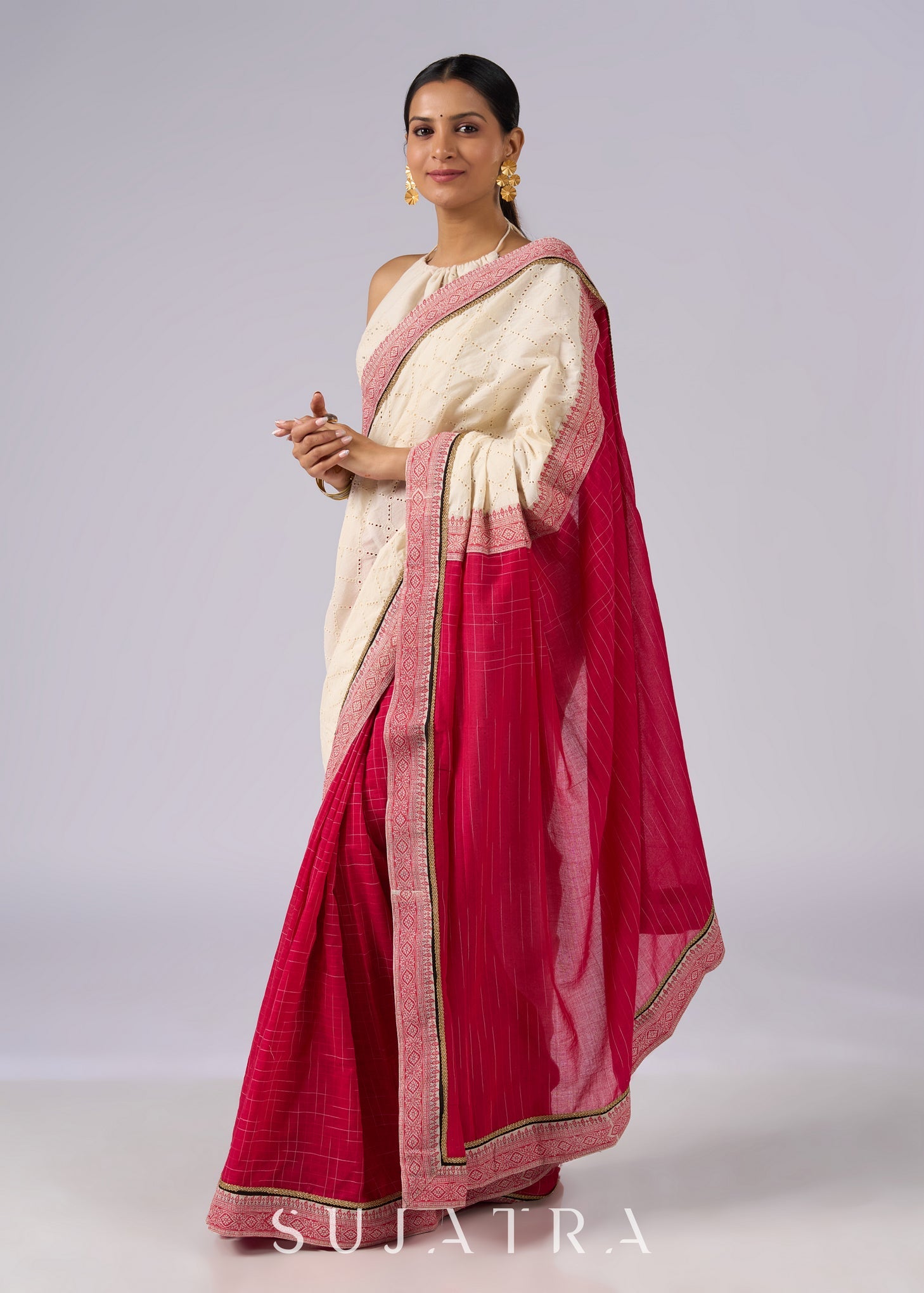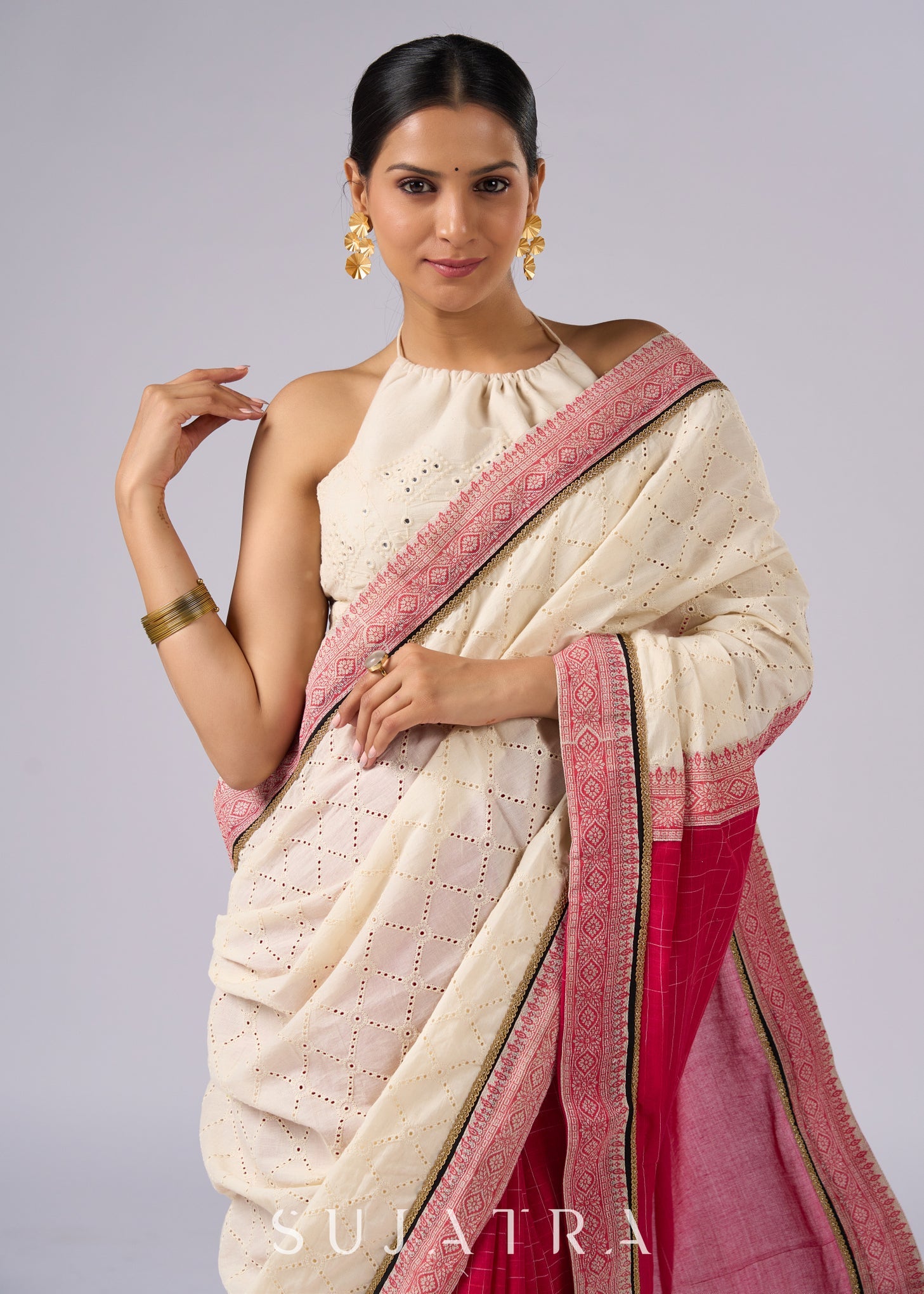 This festive saree features a beautiful off white color with intricate haakoba cotton detailing. The bright chequered pink combination adds a pop of color to the traditional design. Made of high-quality cotton, this saree is perfect for any special occasion.