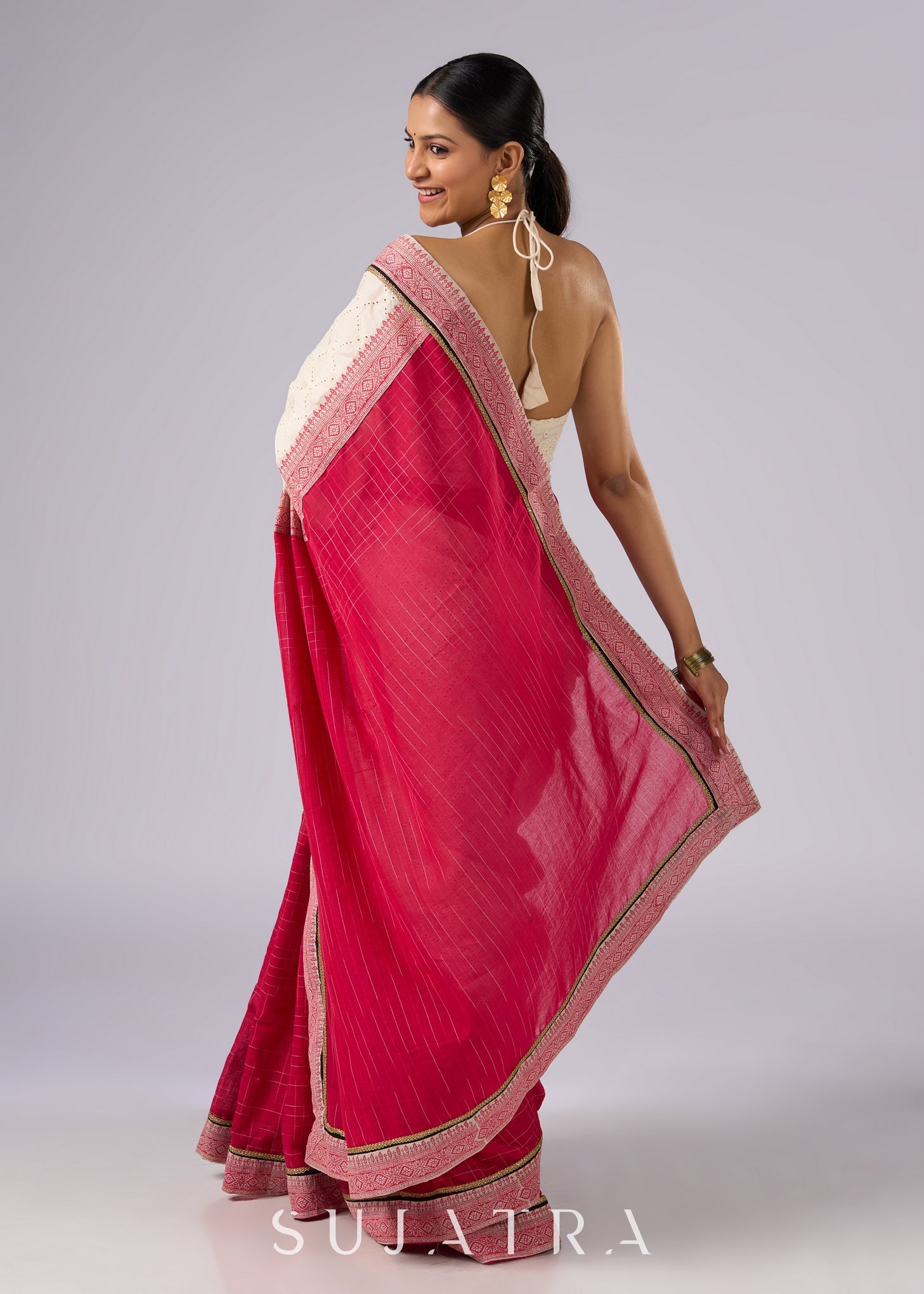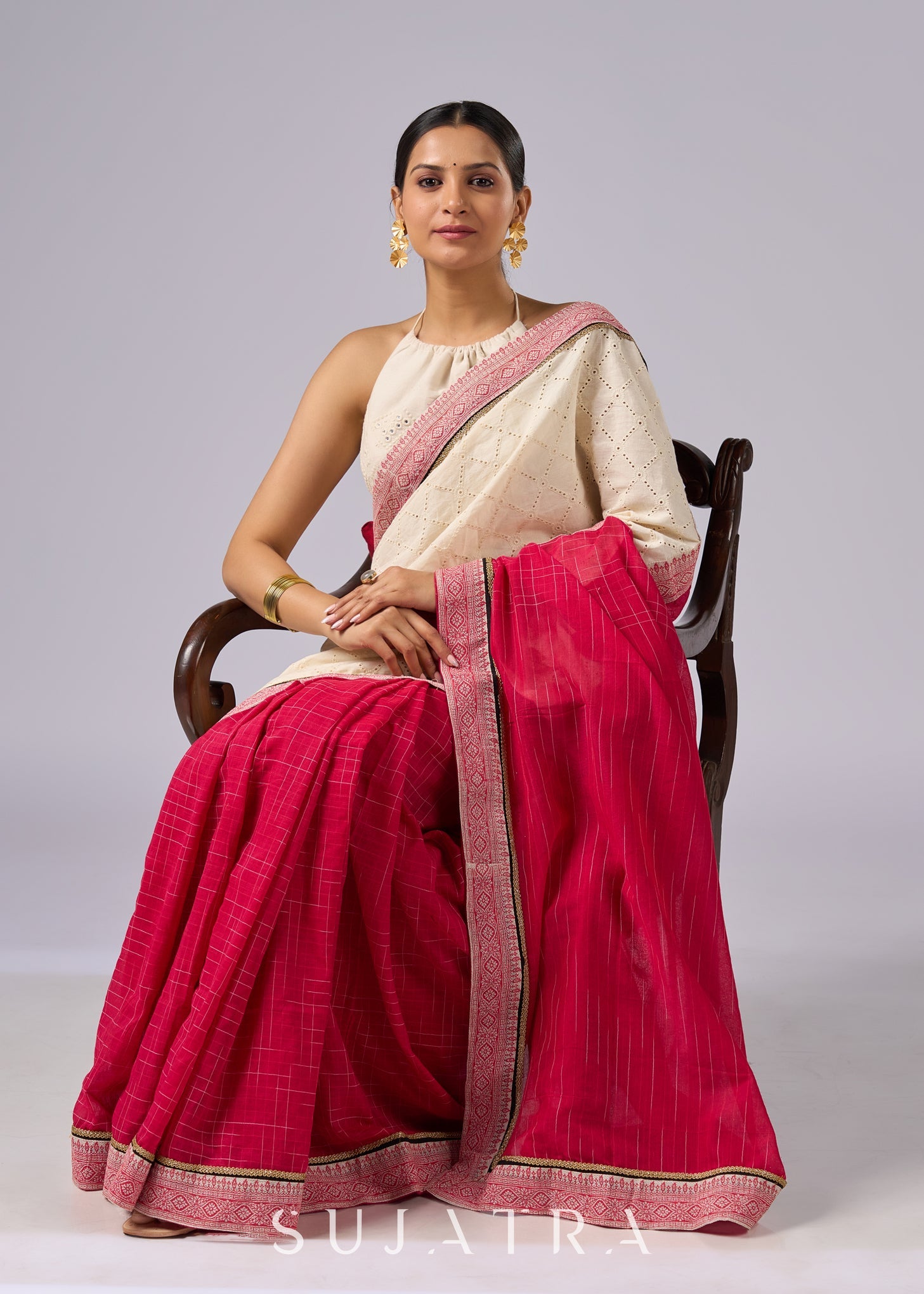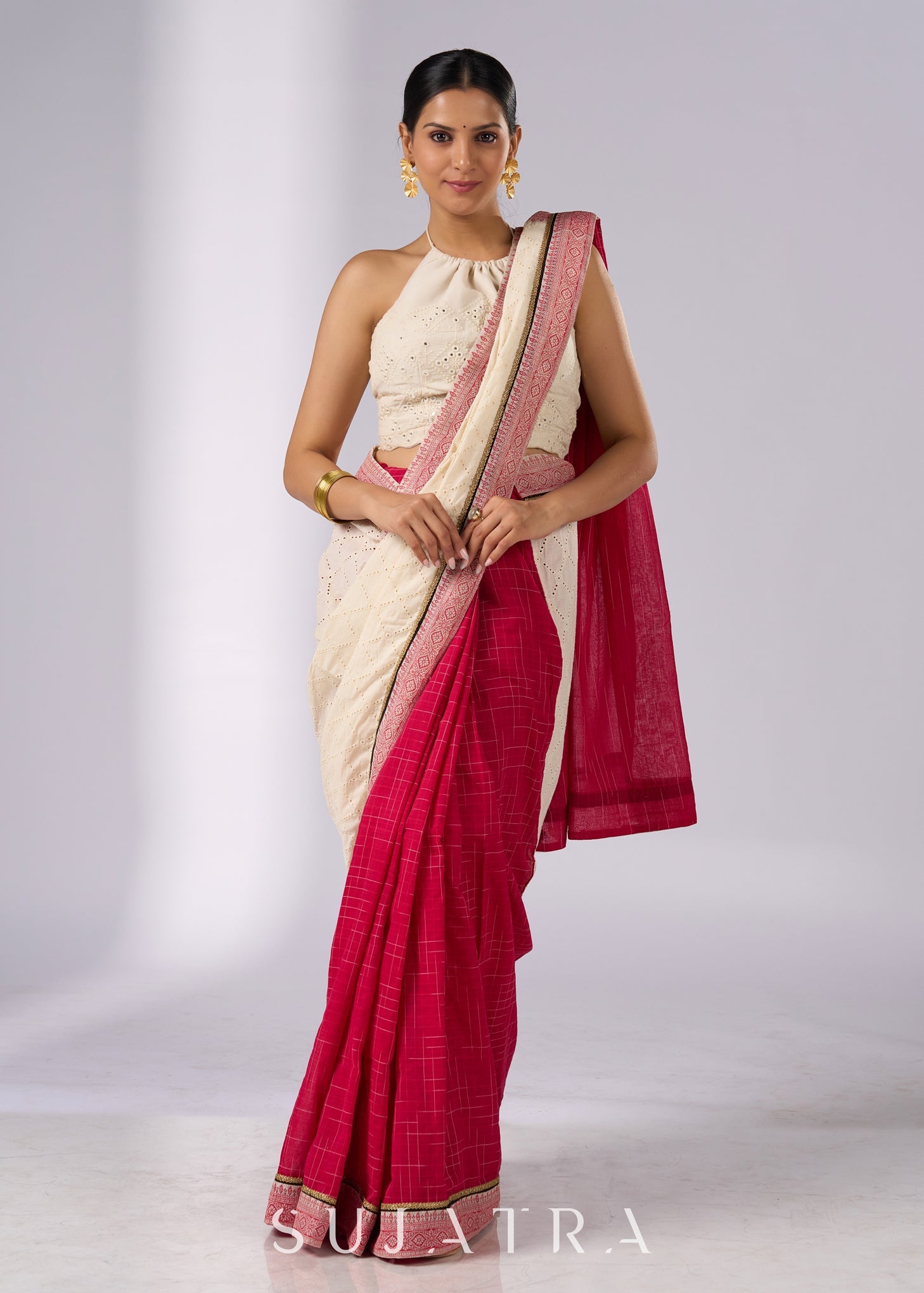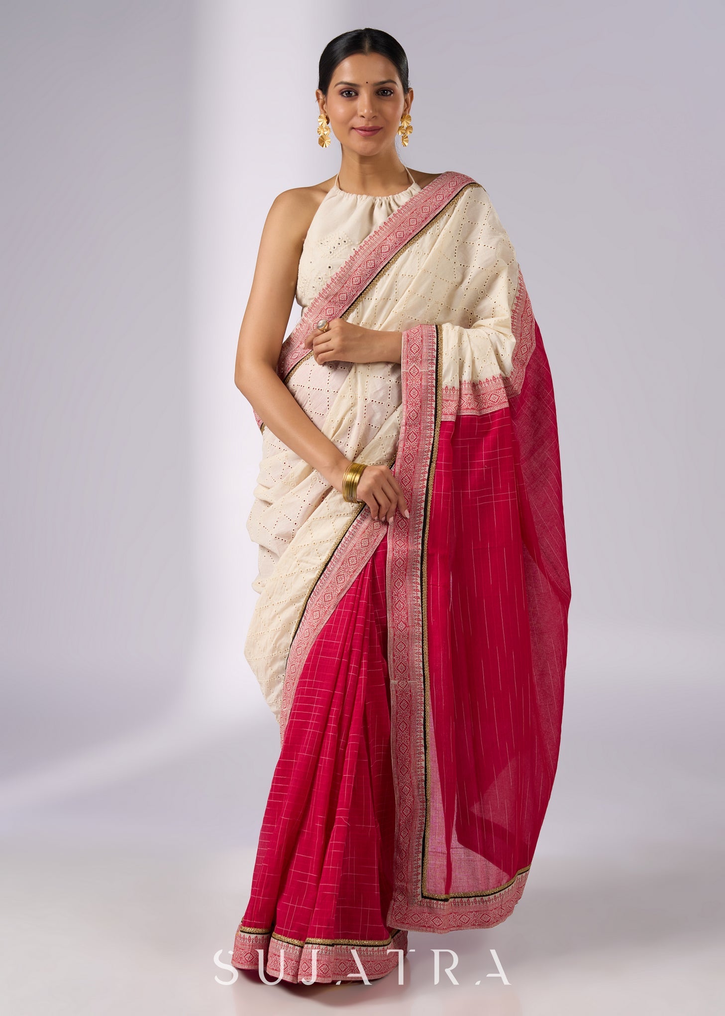 This festive saree features a beautiful off white color with intricate haakoba cotton detailing. The bright chequered pink combination adds a pop of color to the traditional design. Made of high-quality cotton, this saree is perfect for any special occasion.