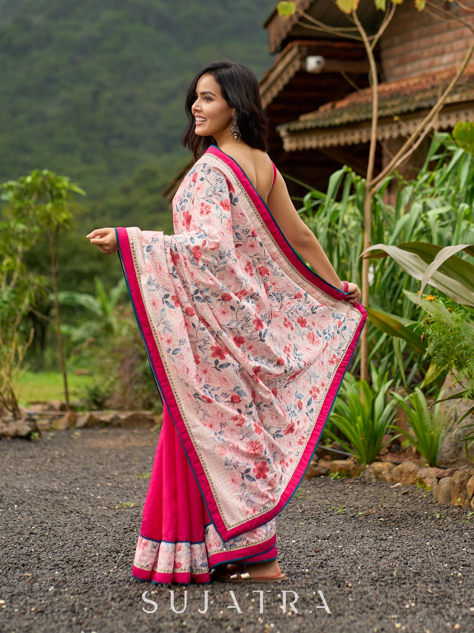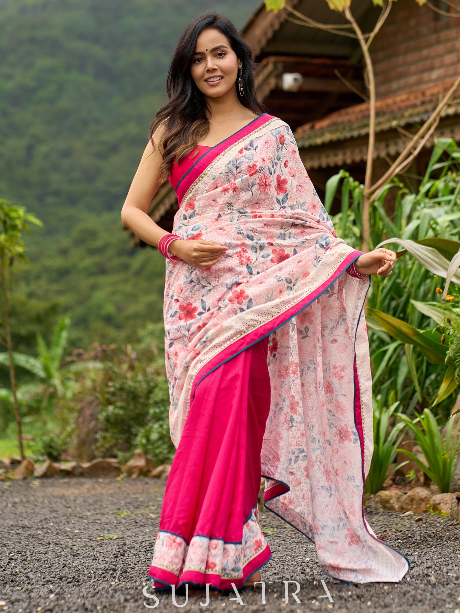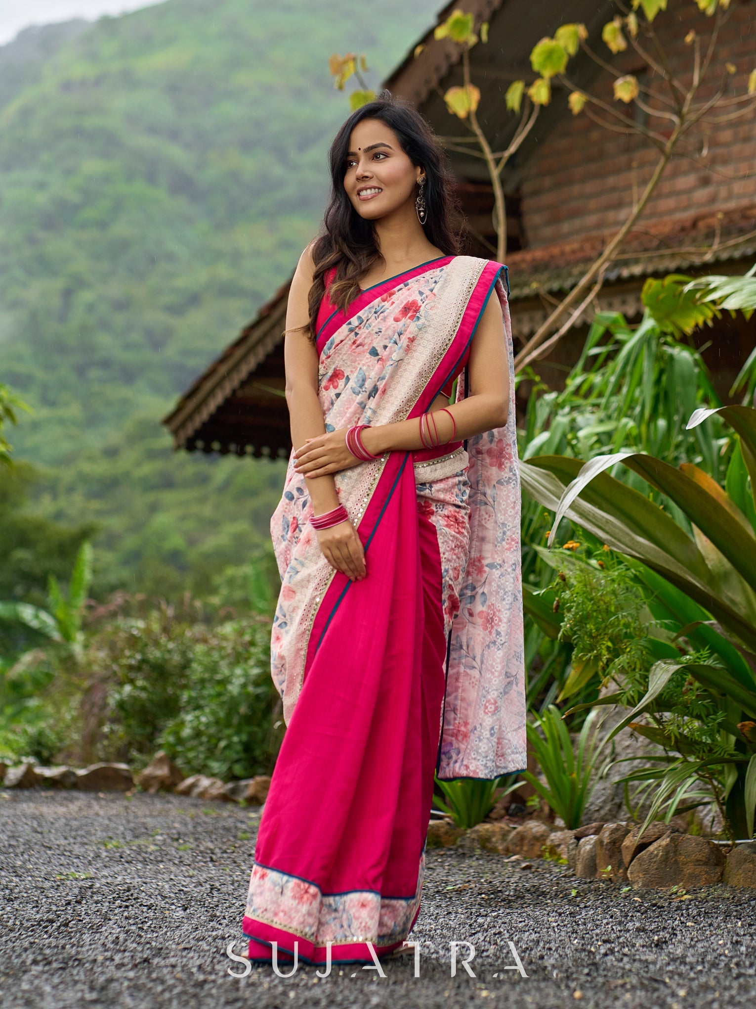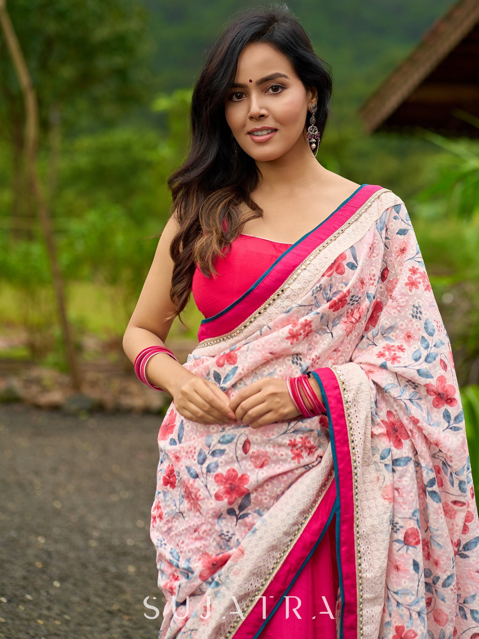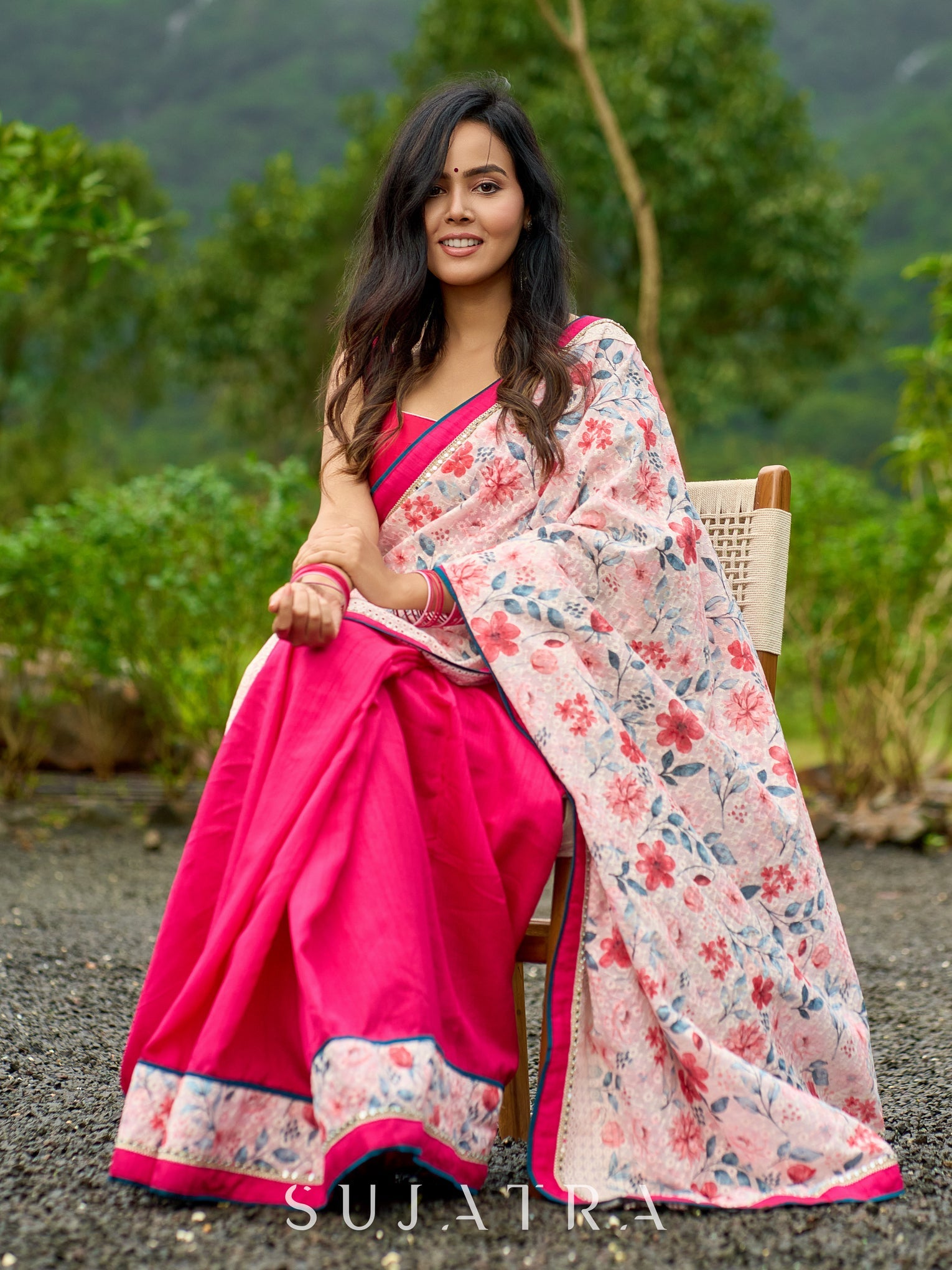 This floral-inspired white saree features beautifully crafted fuchsia pleats and borders, adding a pop of color to its elegant design. A perfect choice for any formal occasion, this saree highlights the beauty of traditional Indian fashion with a modern twist. Elevate your style with this stunning piece.