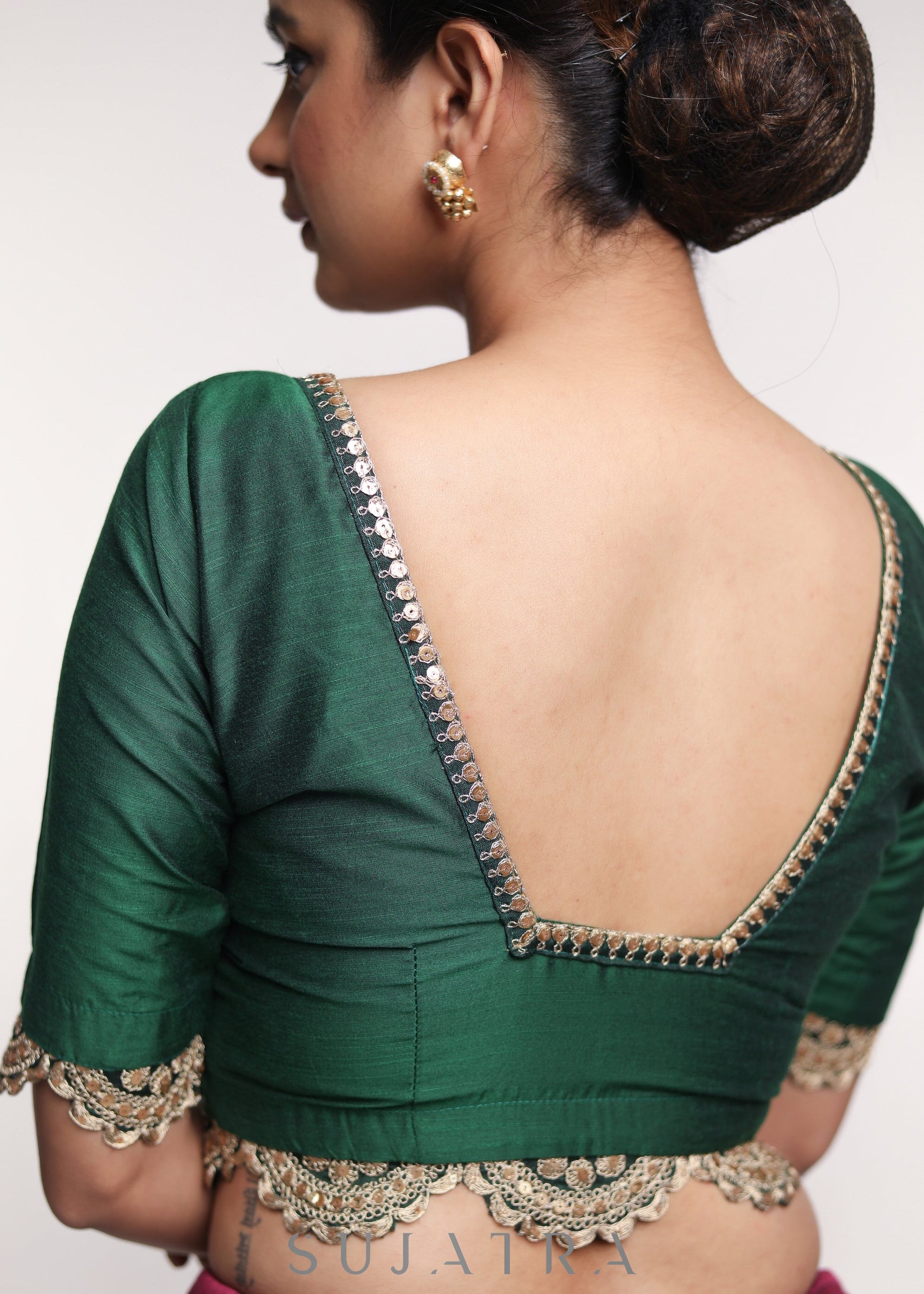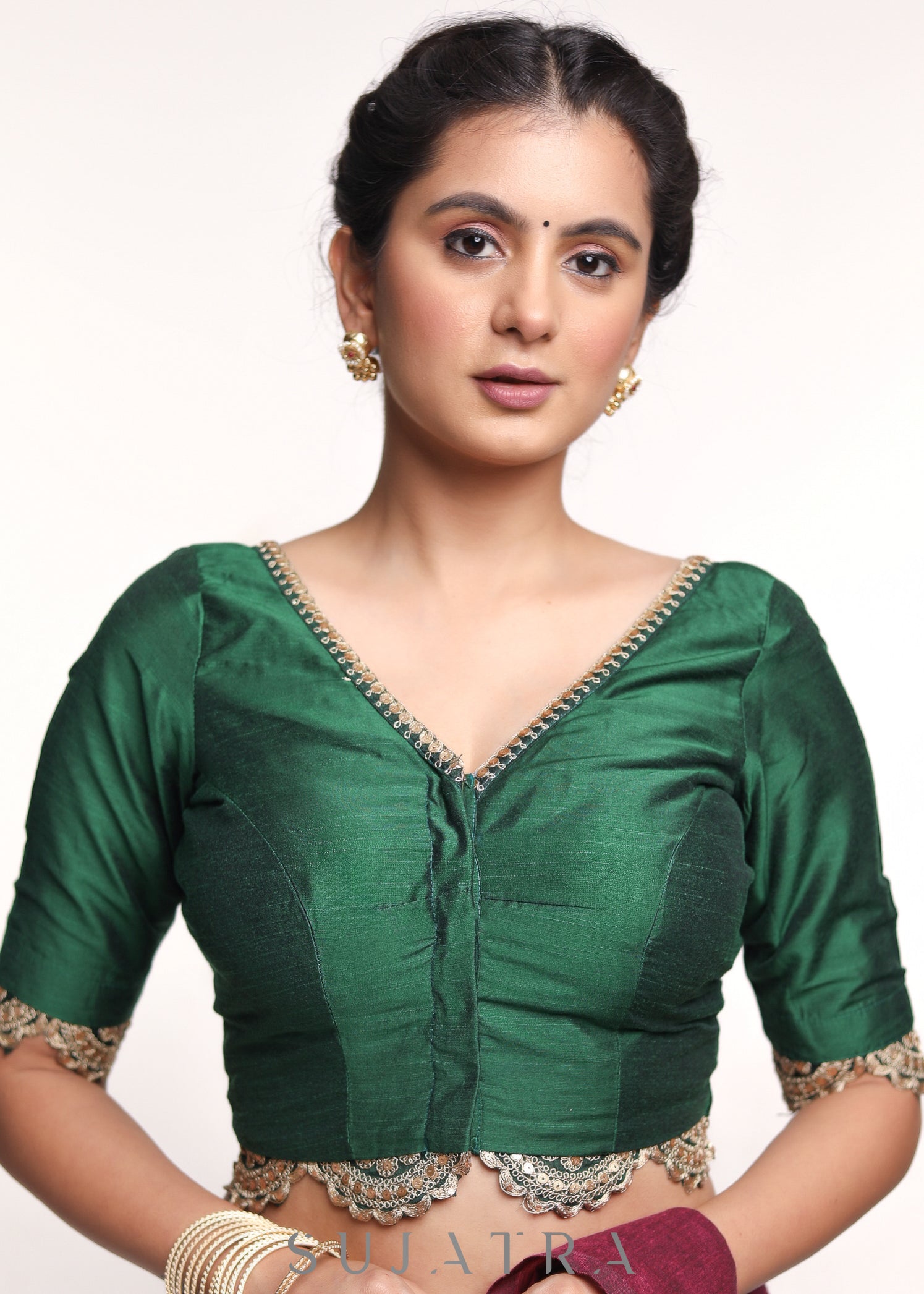 This forest green blouse combines the natural comfort of cotton with the subtle sheen of silk, offering a refined yet breathable garment. The delicate lace insert adds an elegant touch, enhancing its sophisticated design. Ideal for both formal occasions and stylish everyday wear, this blouse balances classic craftsmanship with contemporary detail.