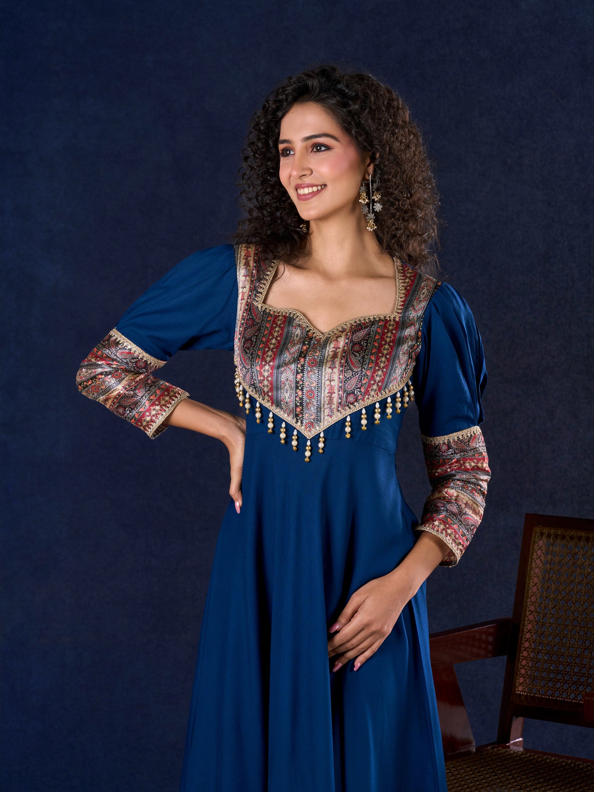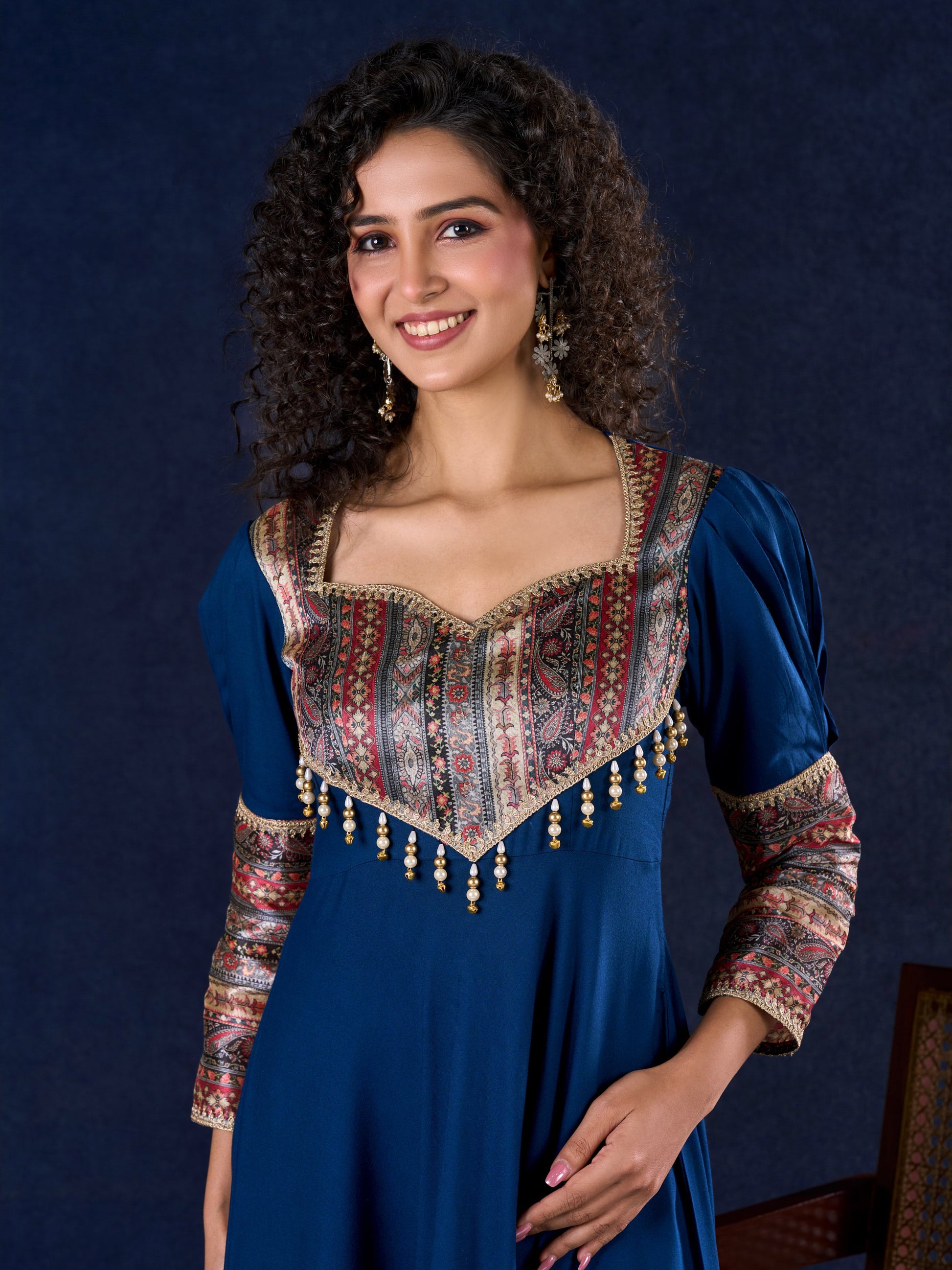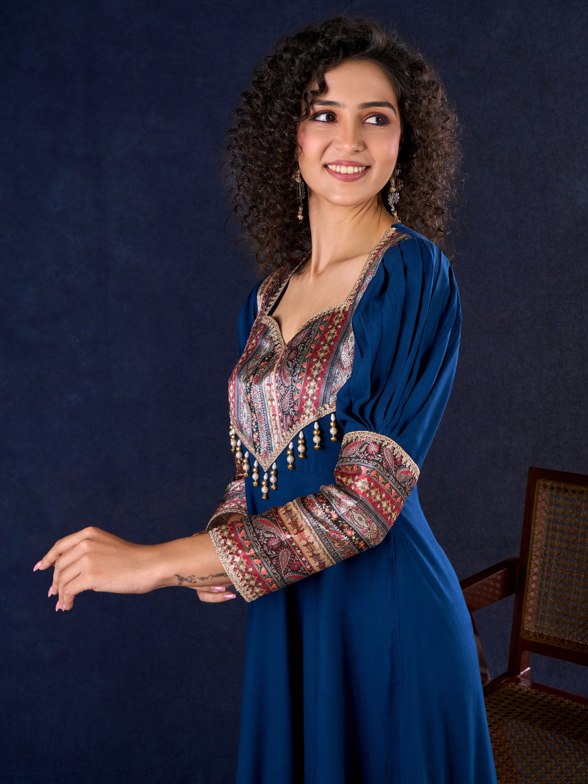 This graceful navy blue rayon flared gown is the perfect combination of elegance and sophistication. The pleated statement sleeves add volume and movement, while the embellished yoke and pearl accents add a touch of glamour. Made with rayon fabric, this gown is both comfortable and stylish. Elevate your wardrobe with this stunning piece.