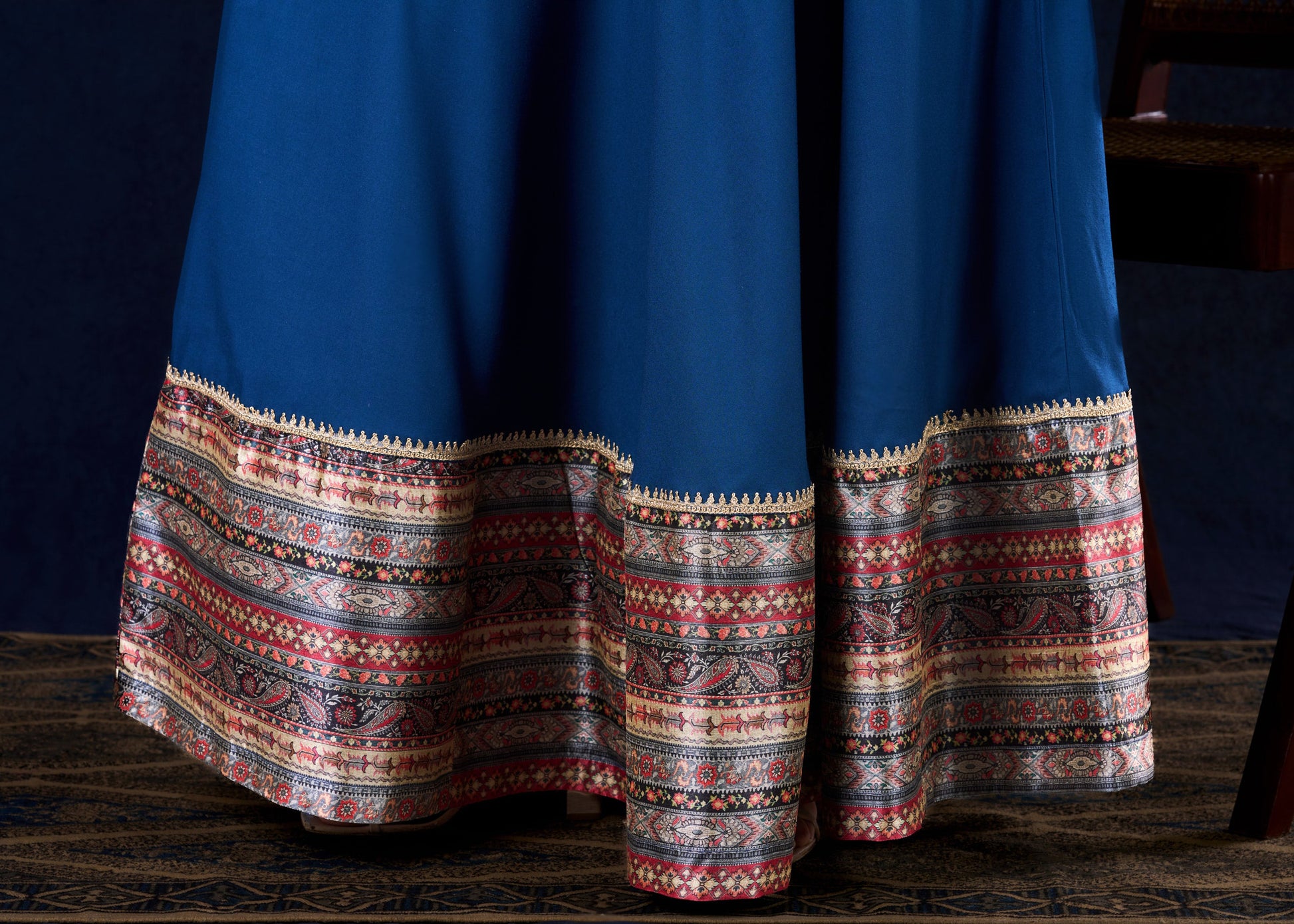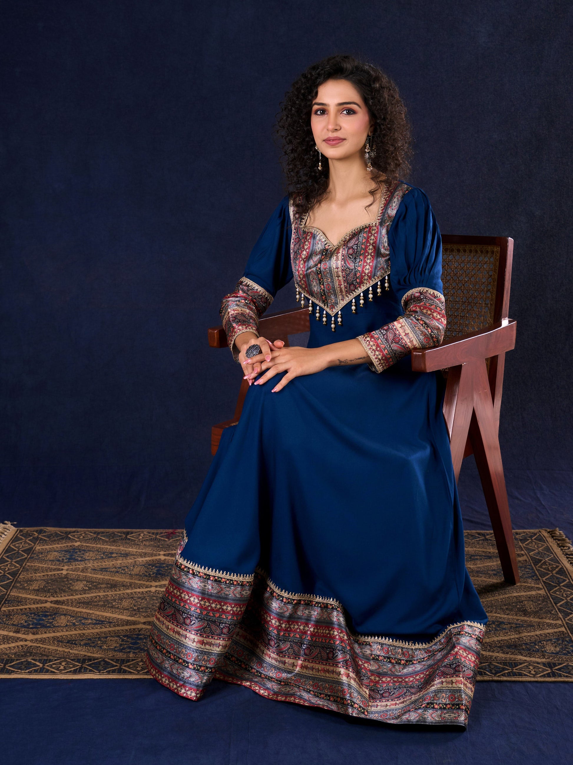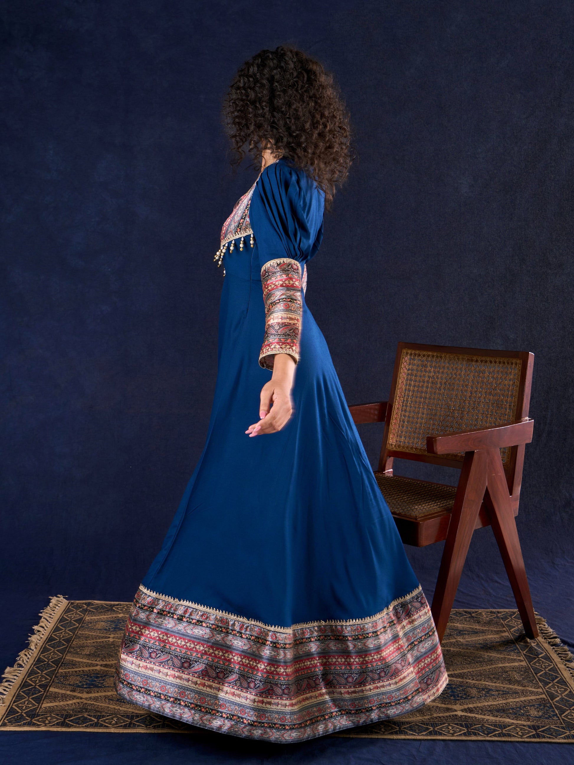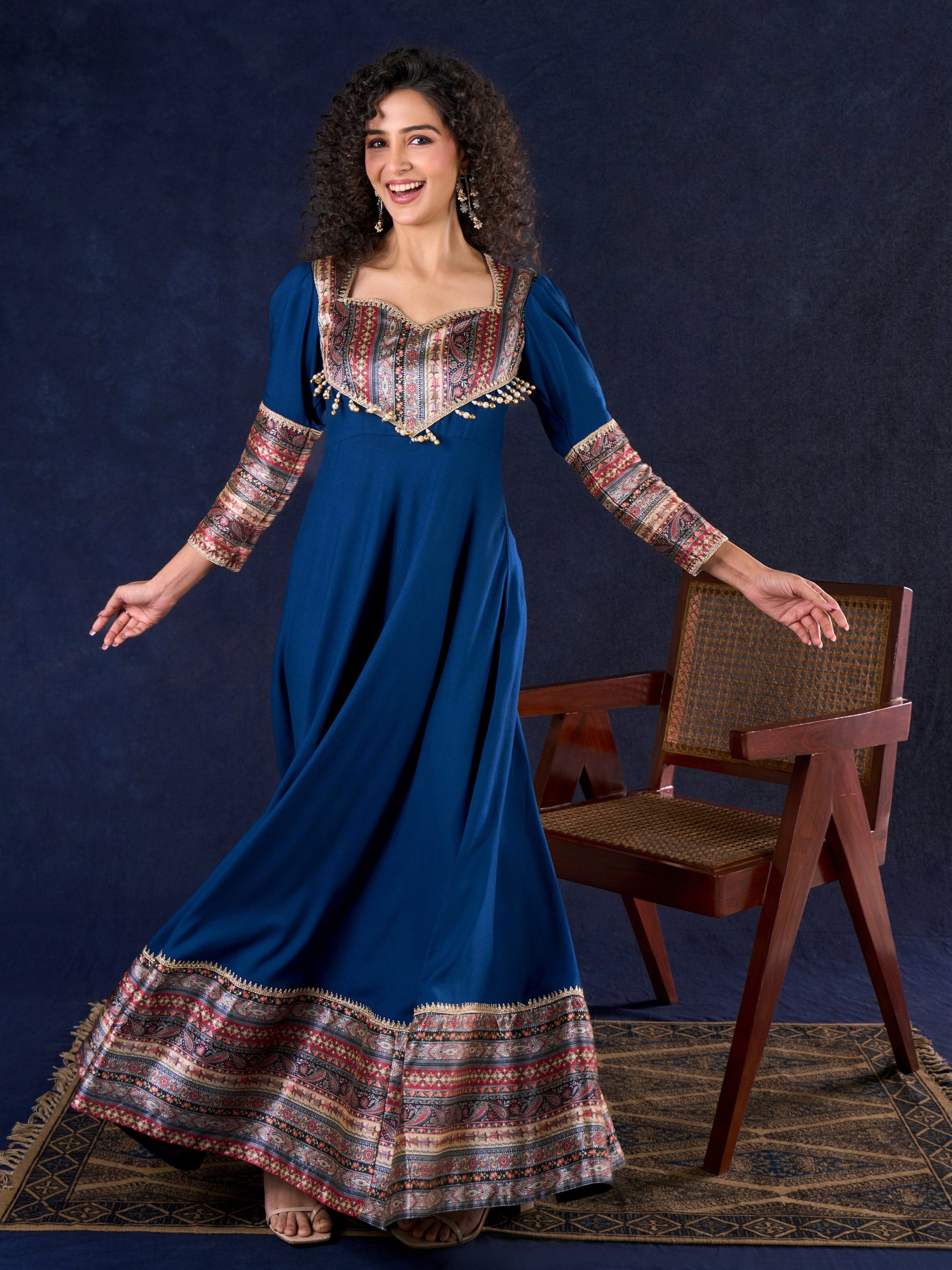 This graceful navy blue rayon flared gown is the perfect combination of elegance and sophistication. The pleated statement sleeves add volume and movement, while the embellished yoke and pearl accents add a touch of glamour. Made with rayon fabric, this gown is both comfortable and stylish. Elevate your wardrobe with this stunning piece.