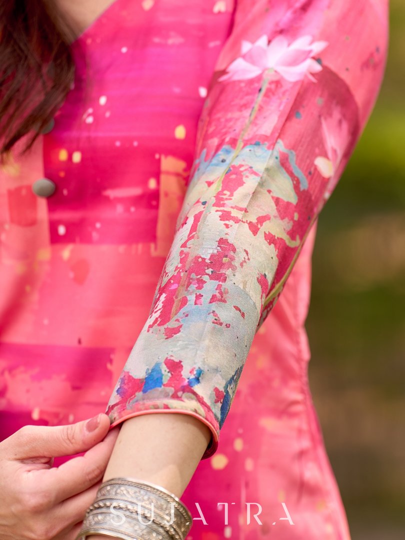 Graceful pink-shaded kurta featuring abstract Pichwai lotus–inspired motifs and a delicate neckline