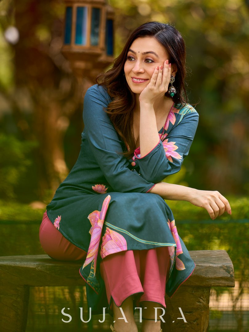 The Graceful teal kurta features intricate pink lotus printing and subtle pink accents, enhancing both aesthetic and cultural appeal. The statement patch above the neckline adds a distinctive character, making this garment suitable for various occasions. Its design combines elegance with versatility, reflecting traditional artistry in a contemporary style.