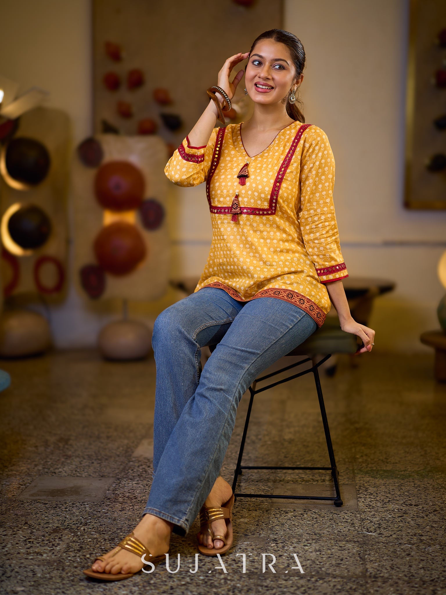 Discover effortless elegance with our Graceful Yellow Floral Top. Featuring delicate mirror and tassel detailing, this top adds a touch of bohemian charm to any outfit. The bold yellow floral print is perfect for brightening up your wardrobe. Embrace style and comfort with this must-have top.