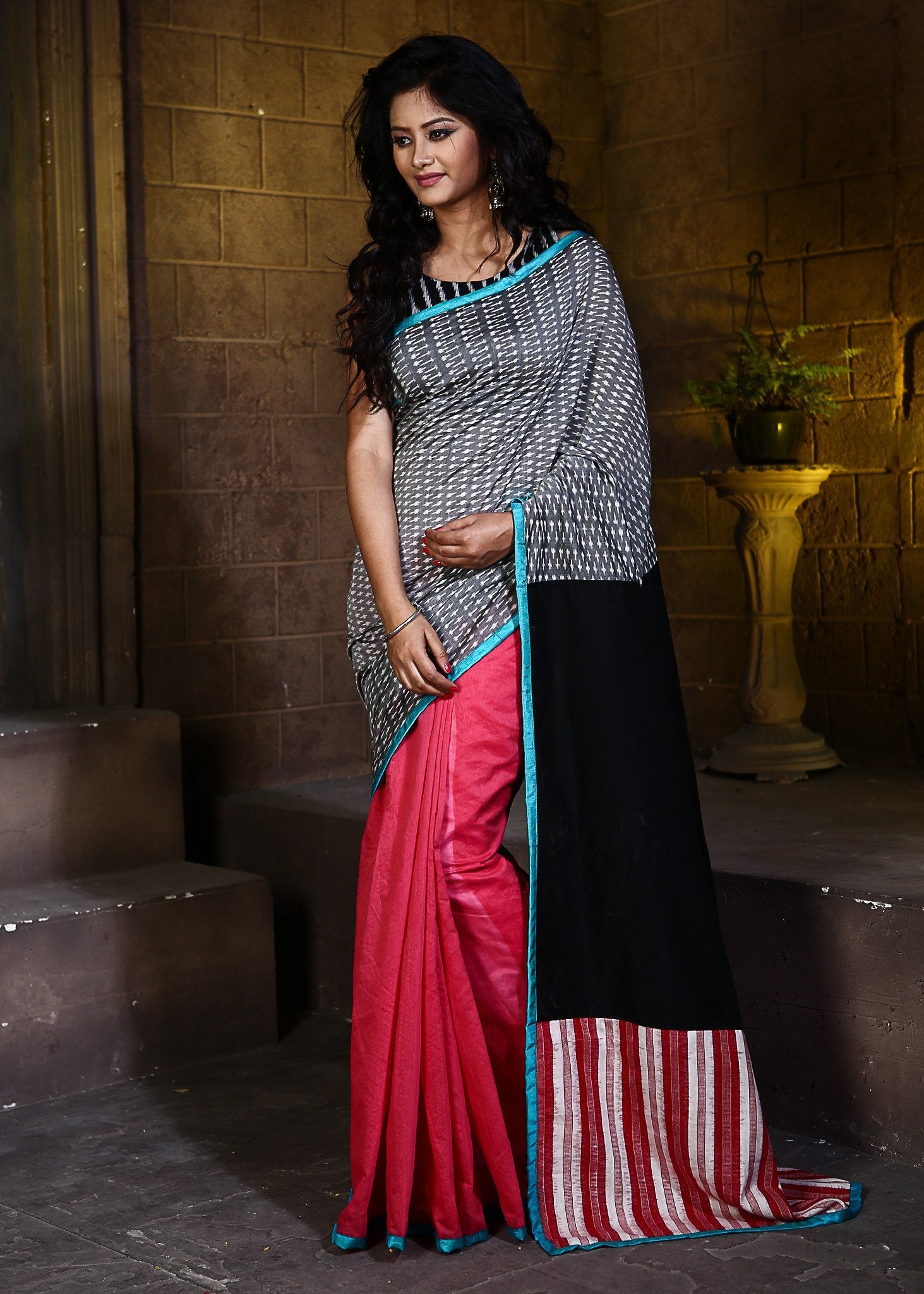Experience the perfect blend of tradition and elegance with this grey ikat mercerised pure cotton fabric, enhanced by a striking pink Chanderi and ikat patch on the pallu. The mercerised cotton offers a soft, lustrous feel that lasts, while the vibrant pink accents add a touch of sophistication and charm. Ideal for those who appreciate quality and style, this fabric transforms any outfit into a statement of timeless beauty and grace. Elevate your wardrobe with this exquisite piece today.