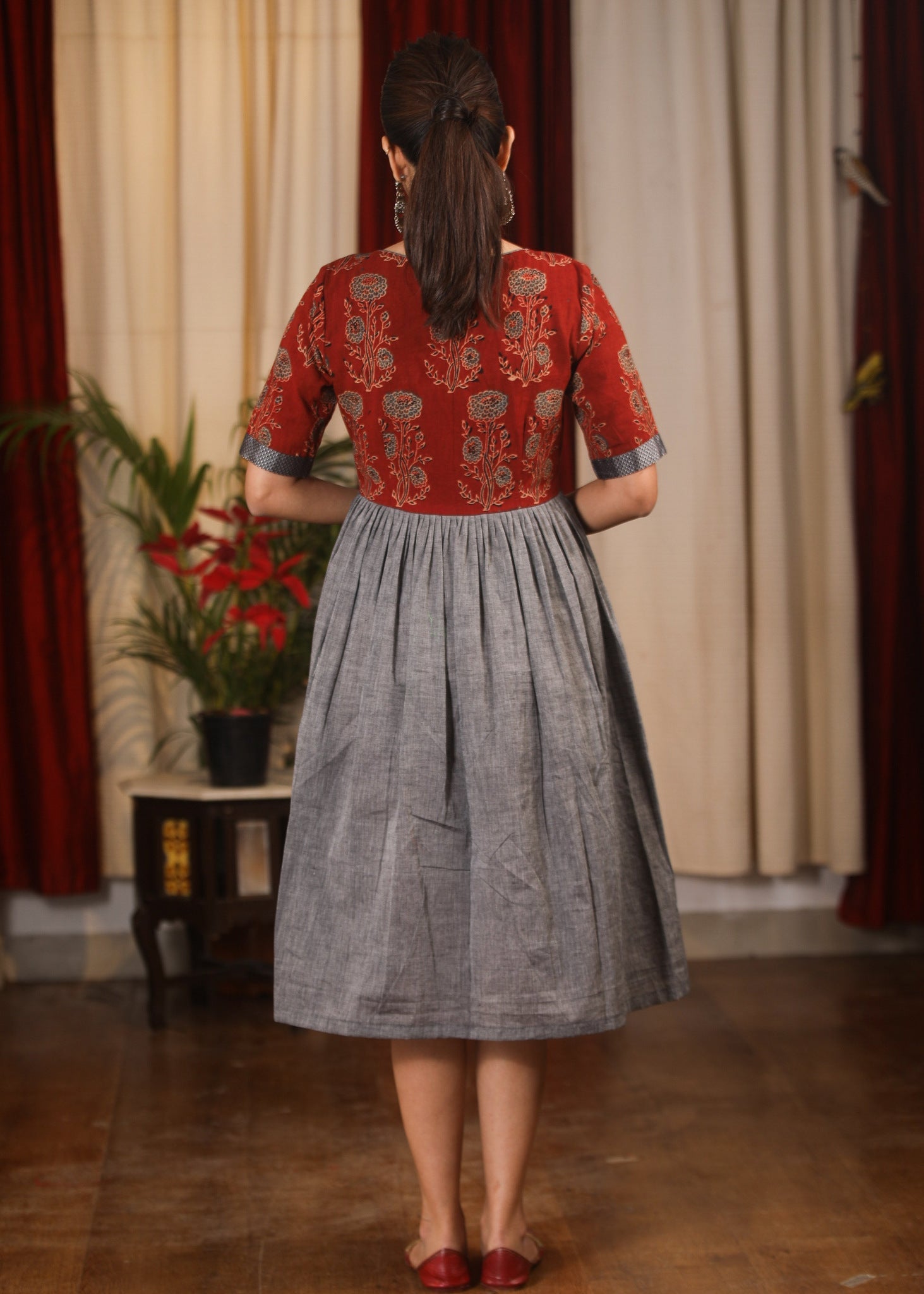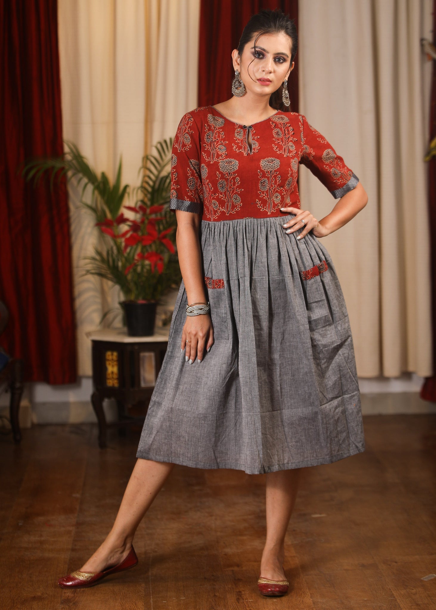 Grey & maroon Ajrakh block printed combination one piece dress