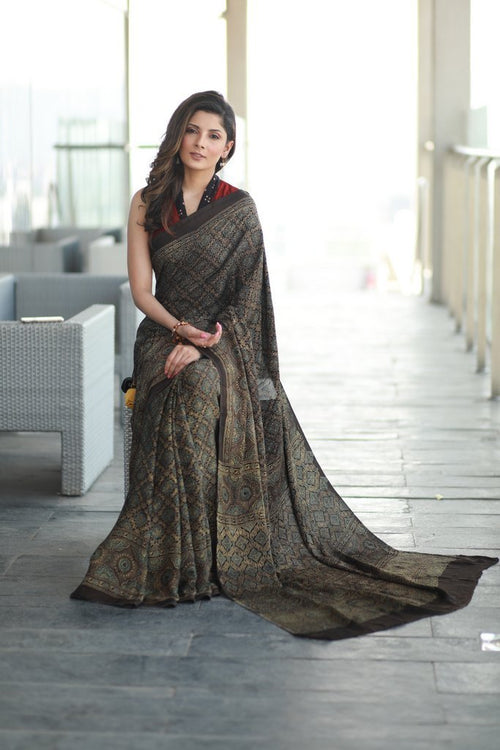 Experience the understated beauty of this hand block printed Chanderi saree, where earthy tones meet timeless heritage. Crafted with care, its elegant design reflects traditional artistry while offering a sophisticated look. Perfect for those who appreciate subtle charm and cultural richness, this saree is ideal for both festive occasions and refined everyday wear.