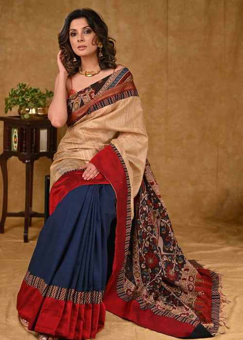 Bring the unique beauty of India to your wardrobe with this gorgeous saree! The hand painted kalamkari design and handloom cotton pleats blend perfectly with the ikat border to make a saree that's sure to turn a few heads. Get ready to make an unforgettable style statement!