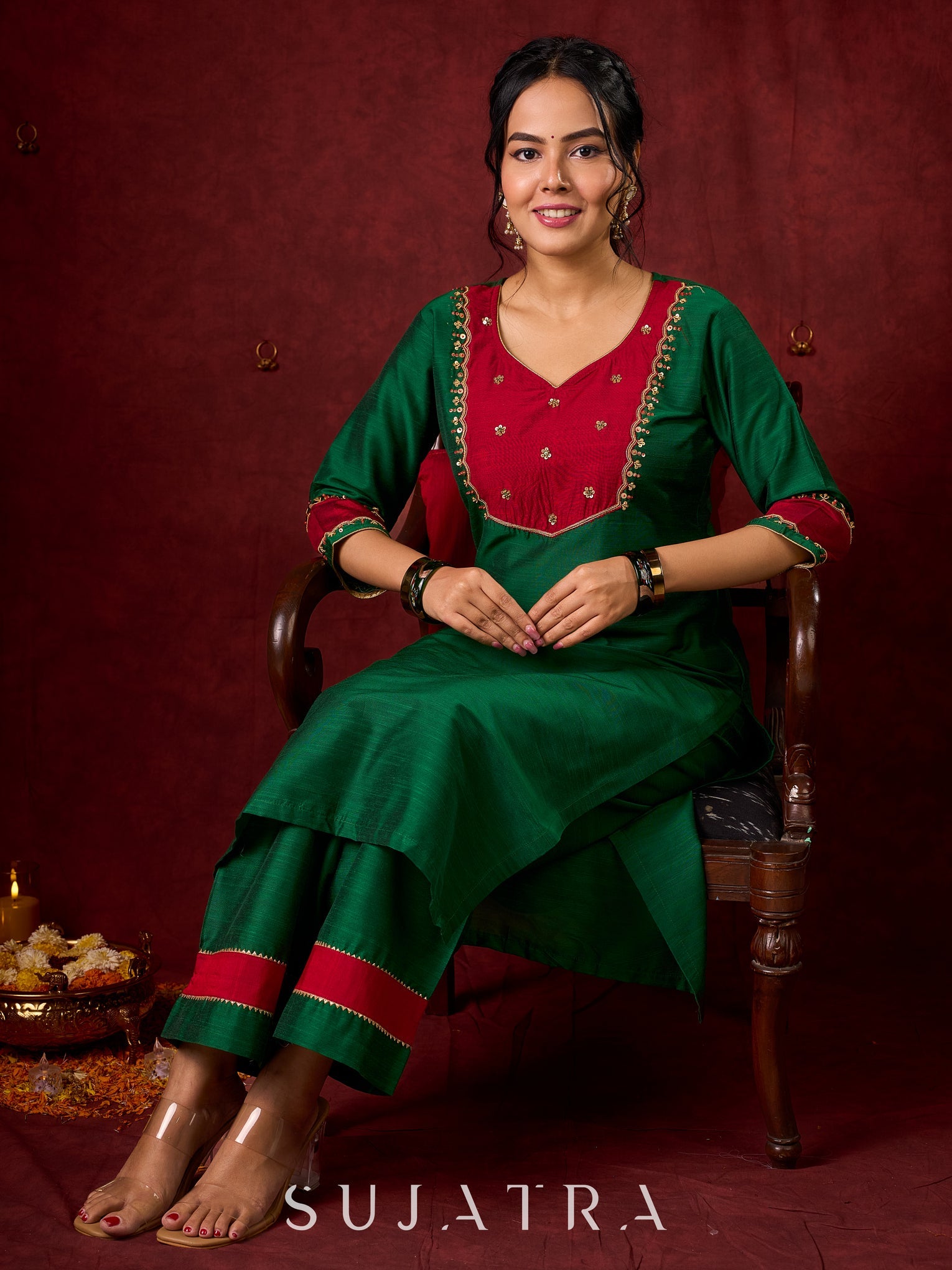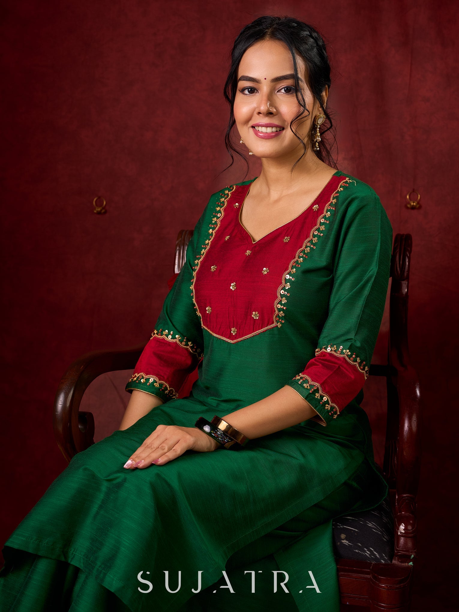 Expertly handcrafted embroidery adorns this luxurious forest green cotton-silk kurta. Create a stunning look with the optional pants or wear it on its own. Elevate your style with this beautifully designed, high-quality piece.