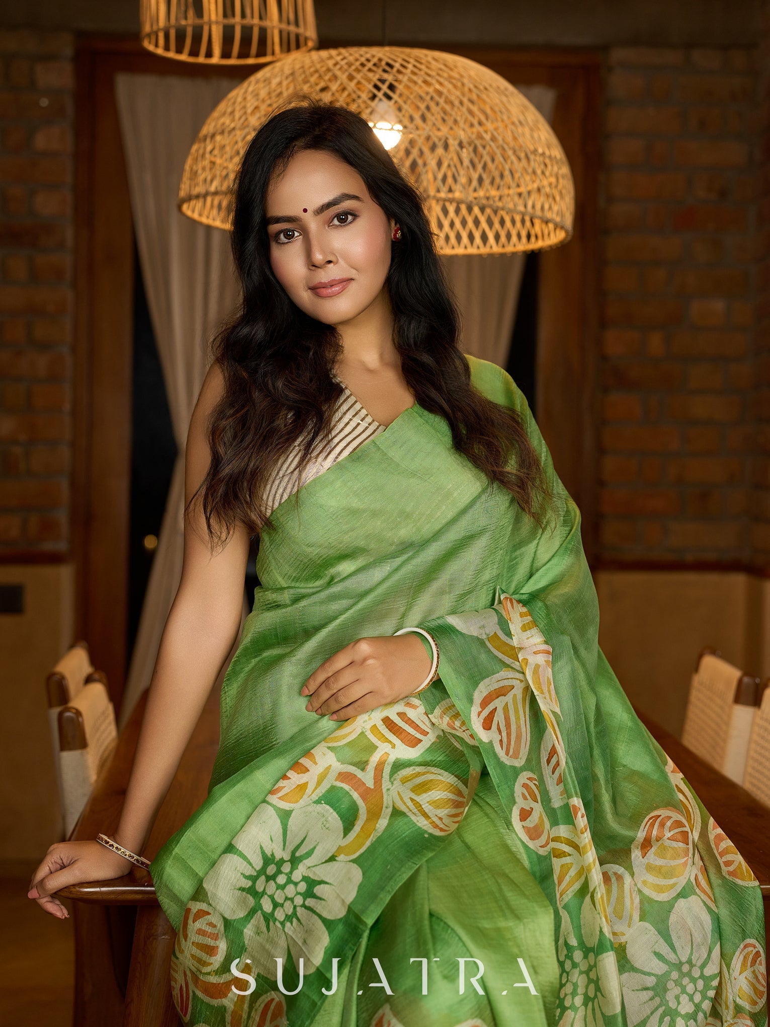 Handcrafted pure silk beauty in green with vibrant hand batik floral motif