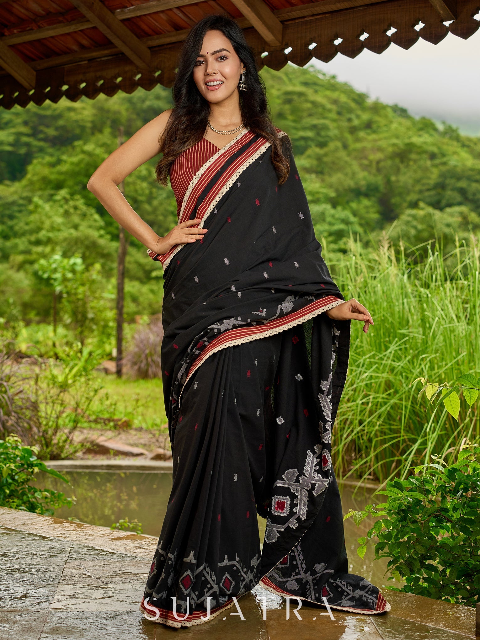 Heritage black cotton saree blending Jamdani-inspired weaves with Ajrakh elegance