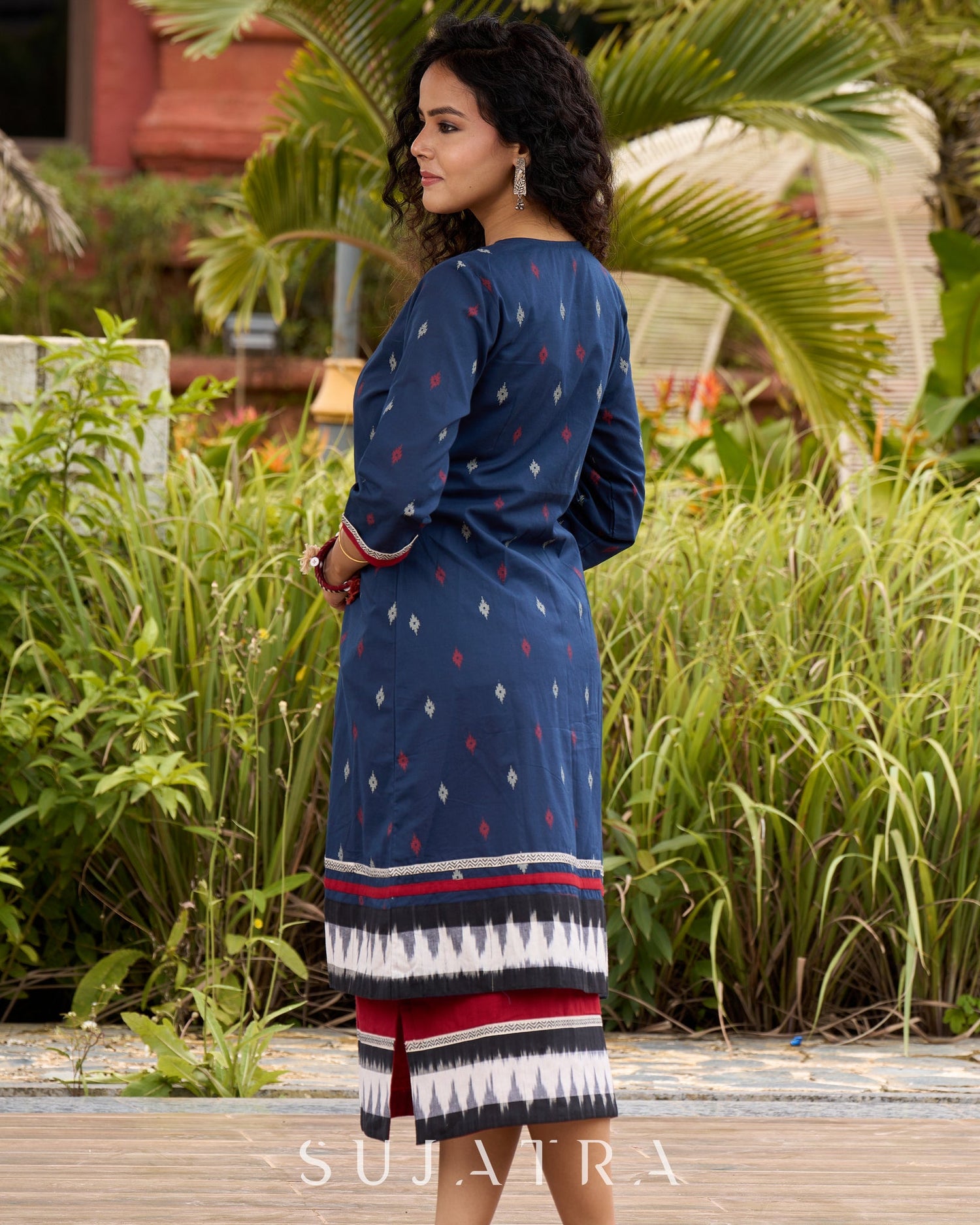 Stunning maroon fusion ensemble blending traditional Ikat and Jamdani craftsmanship. Ideal for weddings, festivals, and celebrations. Premium cotton construction ensures comfort and elegance.