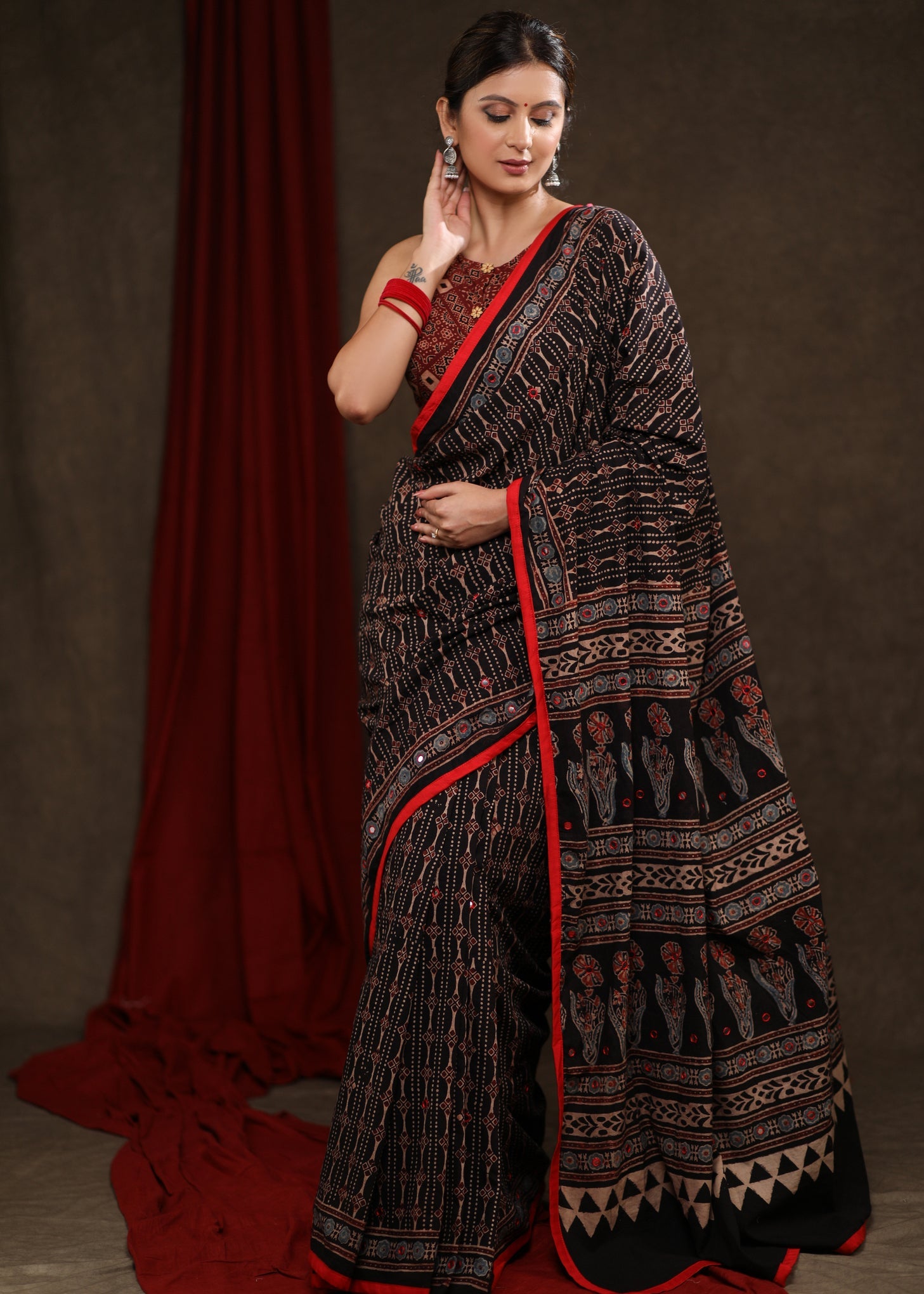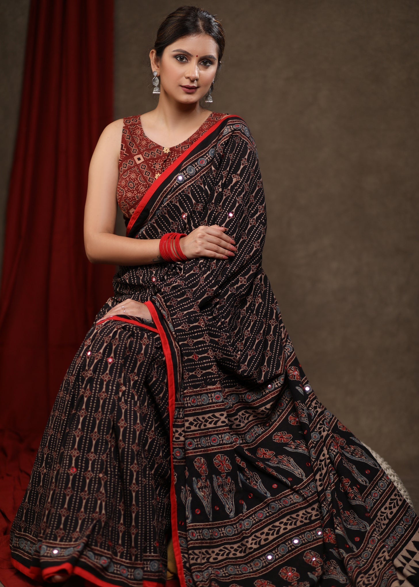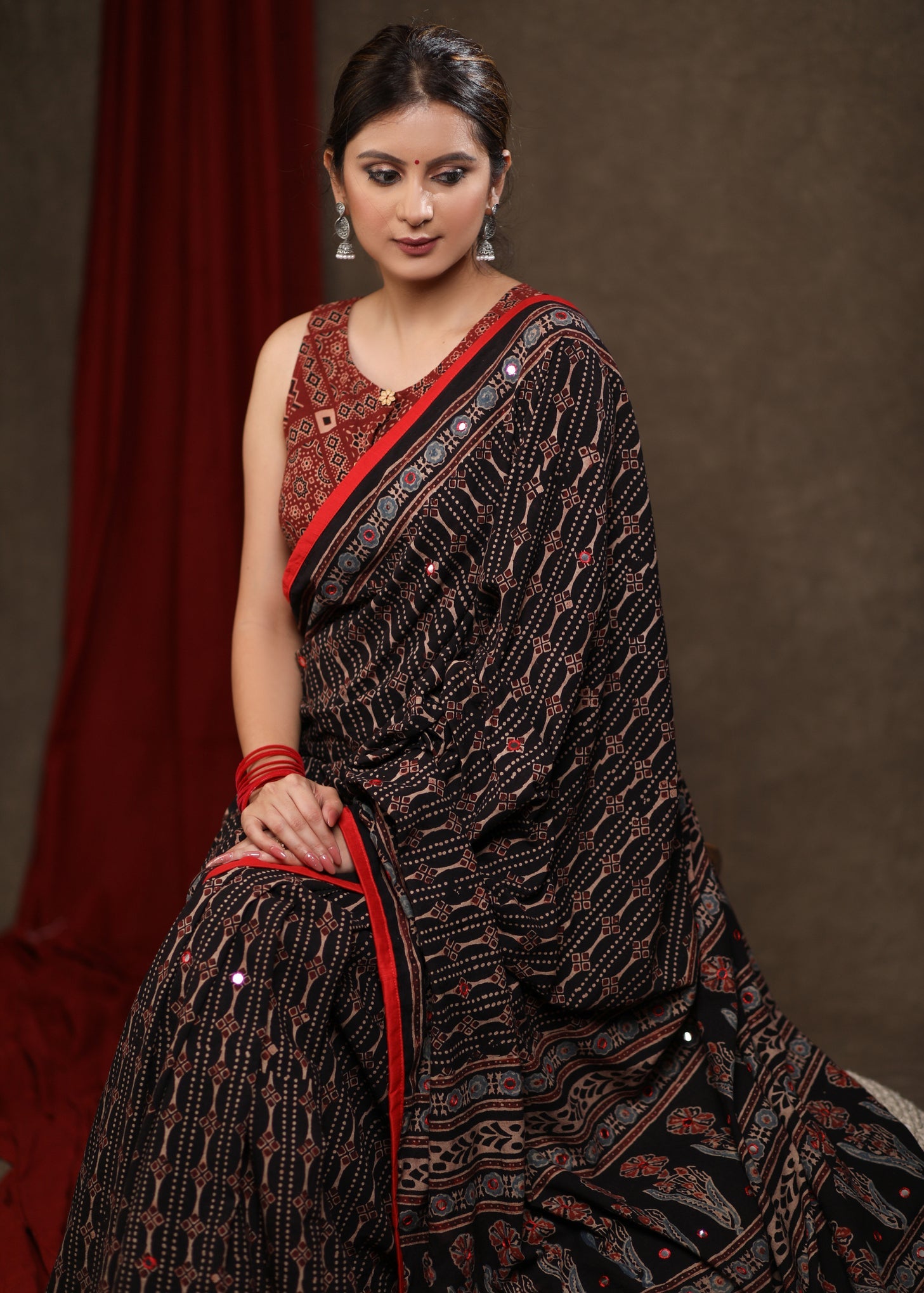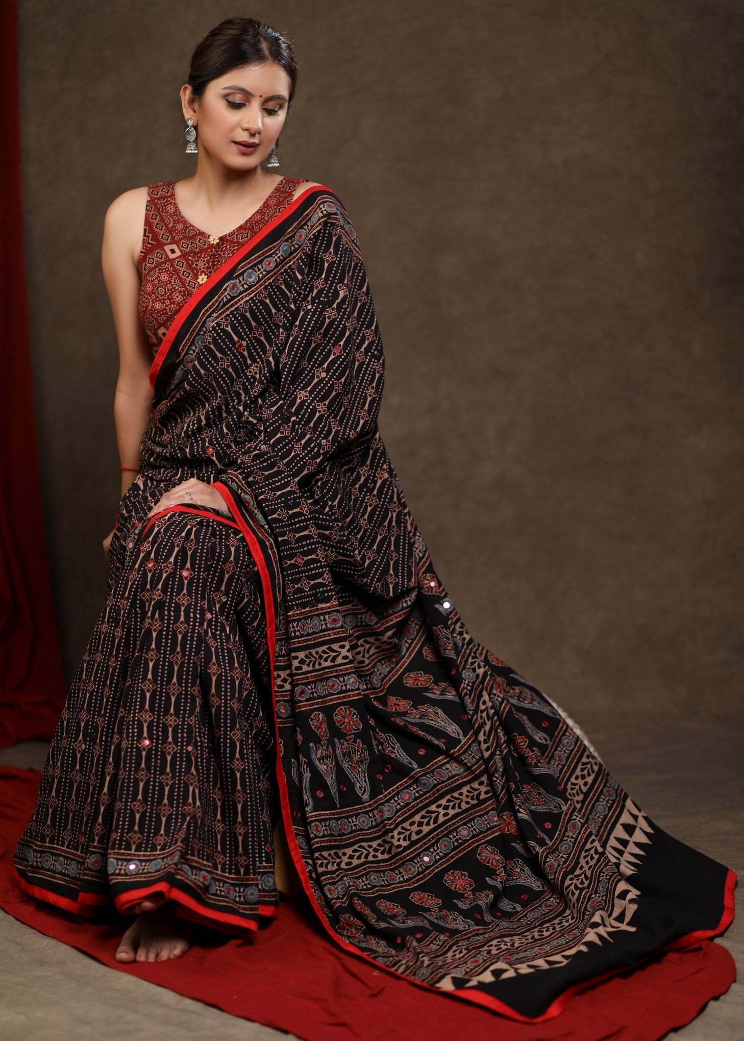 Make a bold statement with the Beautiful Black Ajrakh Block Print Cotton Saree, enhanced by intricate mirrorwork. Crafted from breathable cotton, this saree offers comfort and style for all-day wear. The traditional Ajrakh block print combined with sparkling mirror accents creates a unique and eye-catching look, perfect for festive occasions or casual gatherings. Embrace timeless artistry and effortless elegance with this stunning saree.