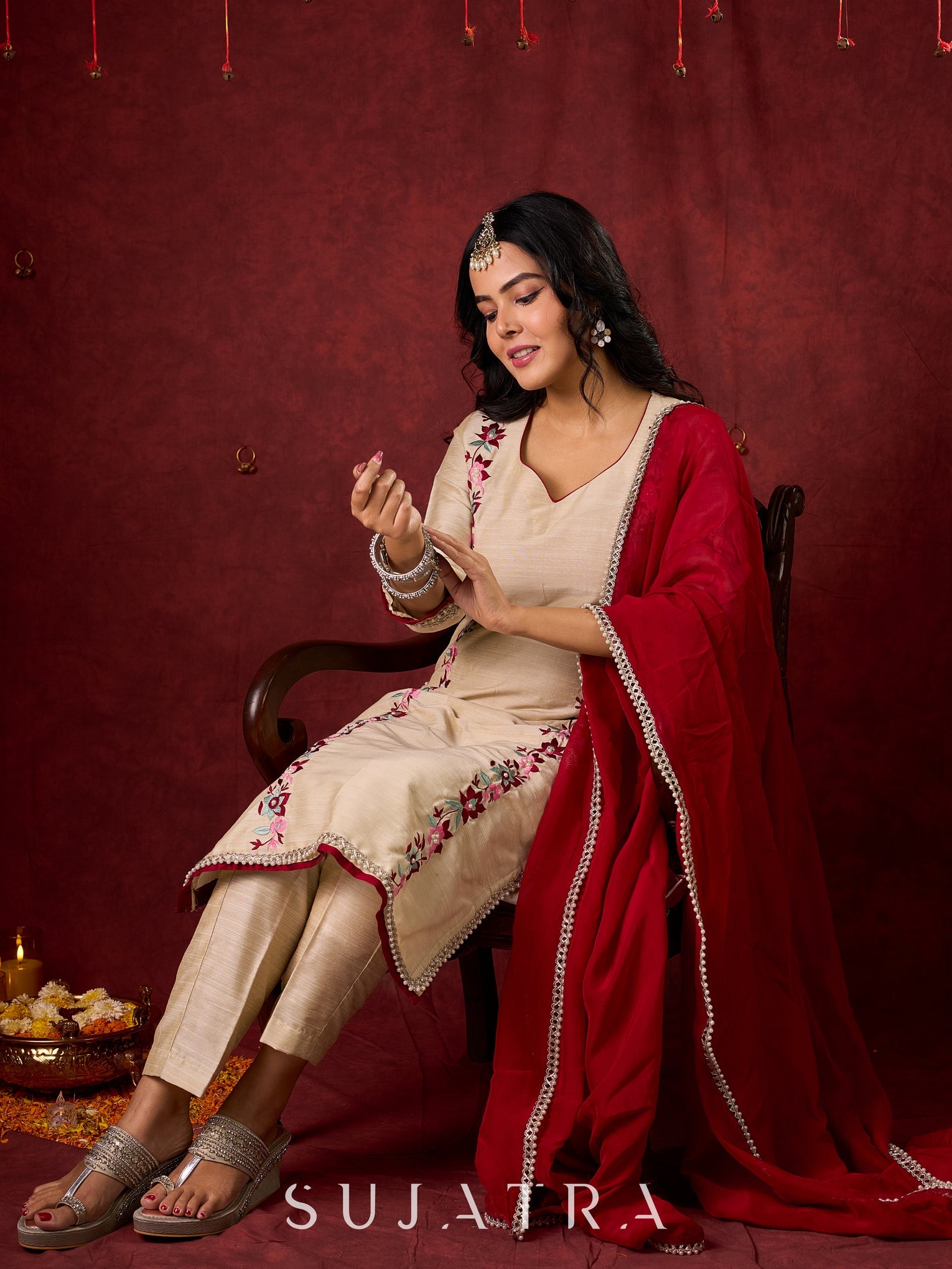 Expertly crafted with a blend of cotton and silk, this ivory kurta features delicate floral embroidery and elegant pearl lace accents. The luxurious fabric and intricate detailing make it a perfect addition to your wardrobe, offering both comfort and sophistication.