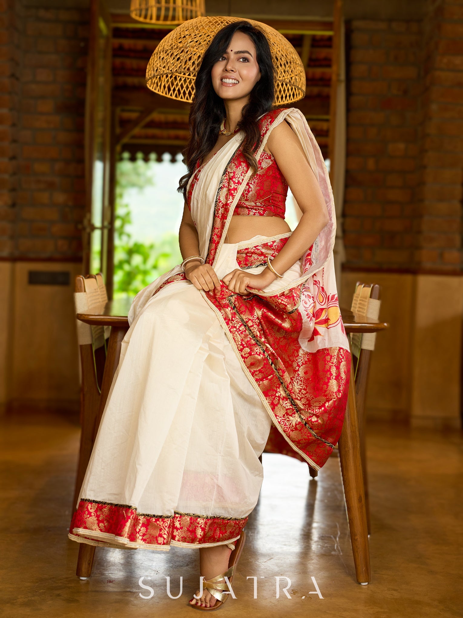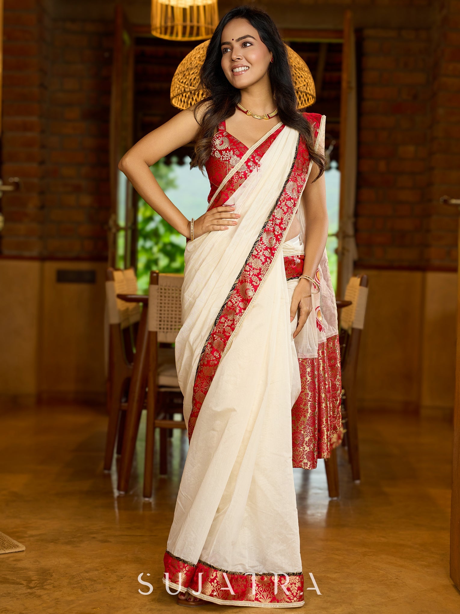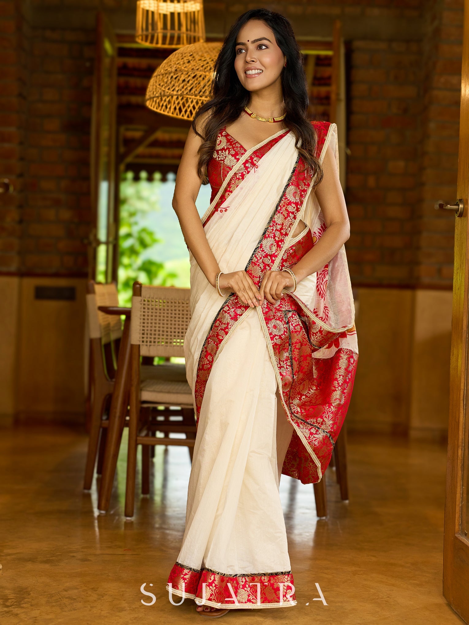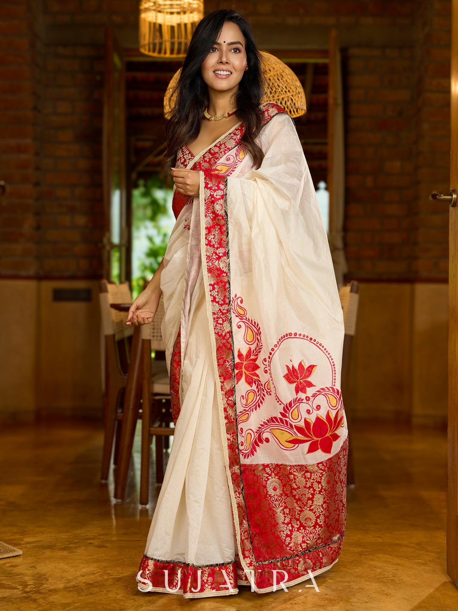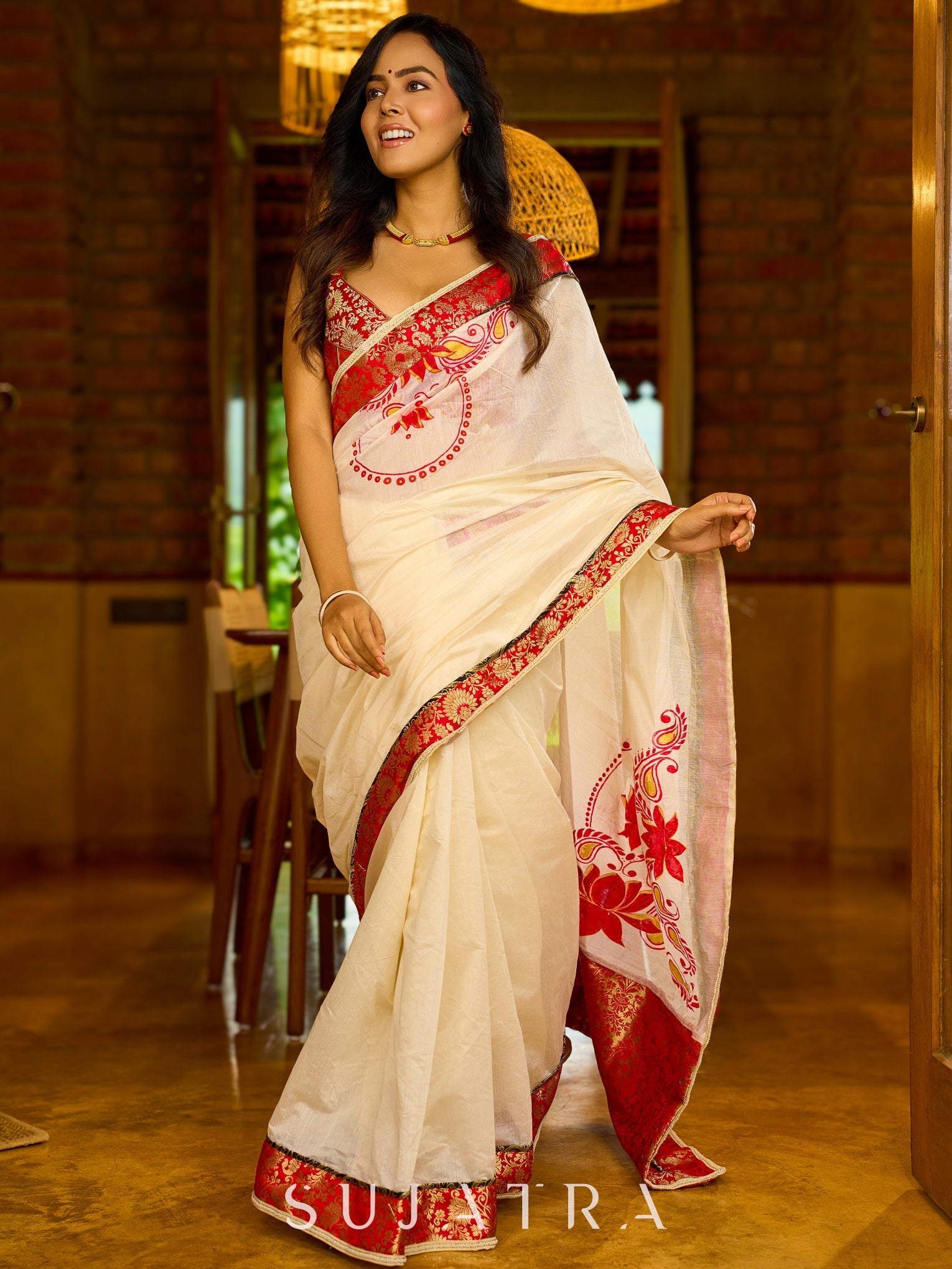 Heritage white Chanderi saree with benarasi border featuring artisanal hand-painted floral motifs