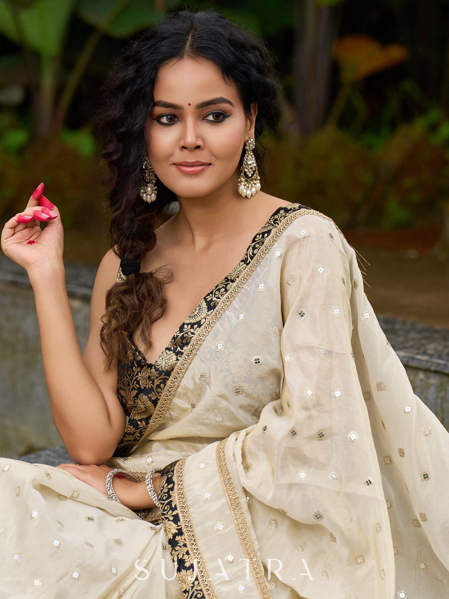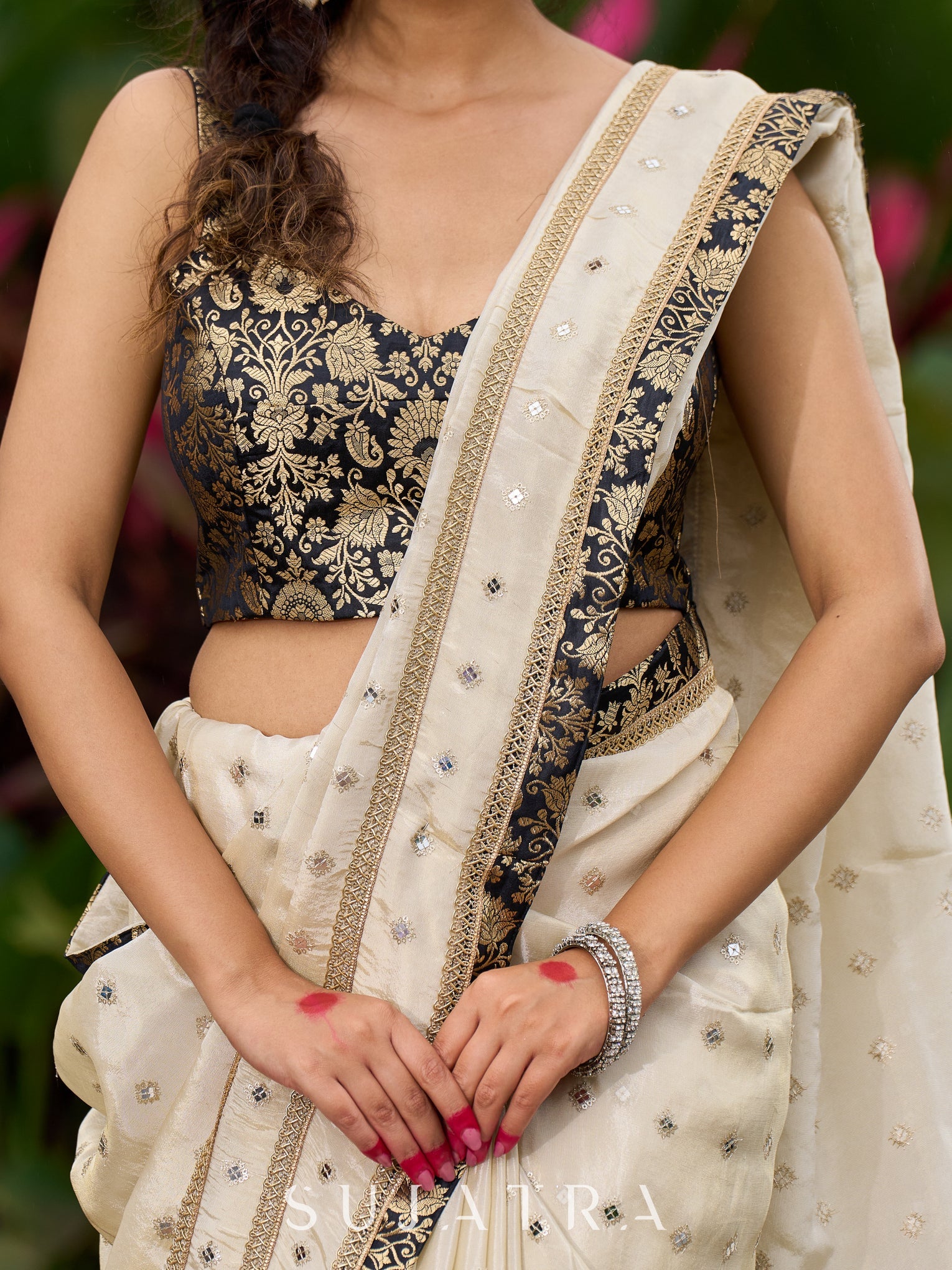 This elegant Timeless ivory tissue saree features zari embroidery and Banarasi accents, adding a touch of luxury to any occasion. The delicate zari work and traditional Banarasi design make this saree a timeless piece of art, perfect for those who appreciate the beauty of Indian craftsmanship.