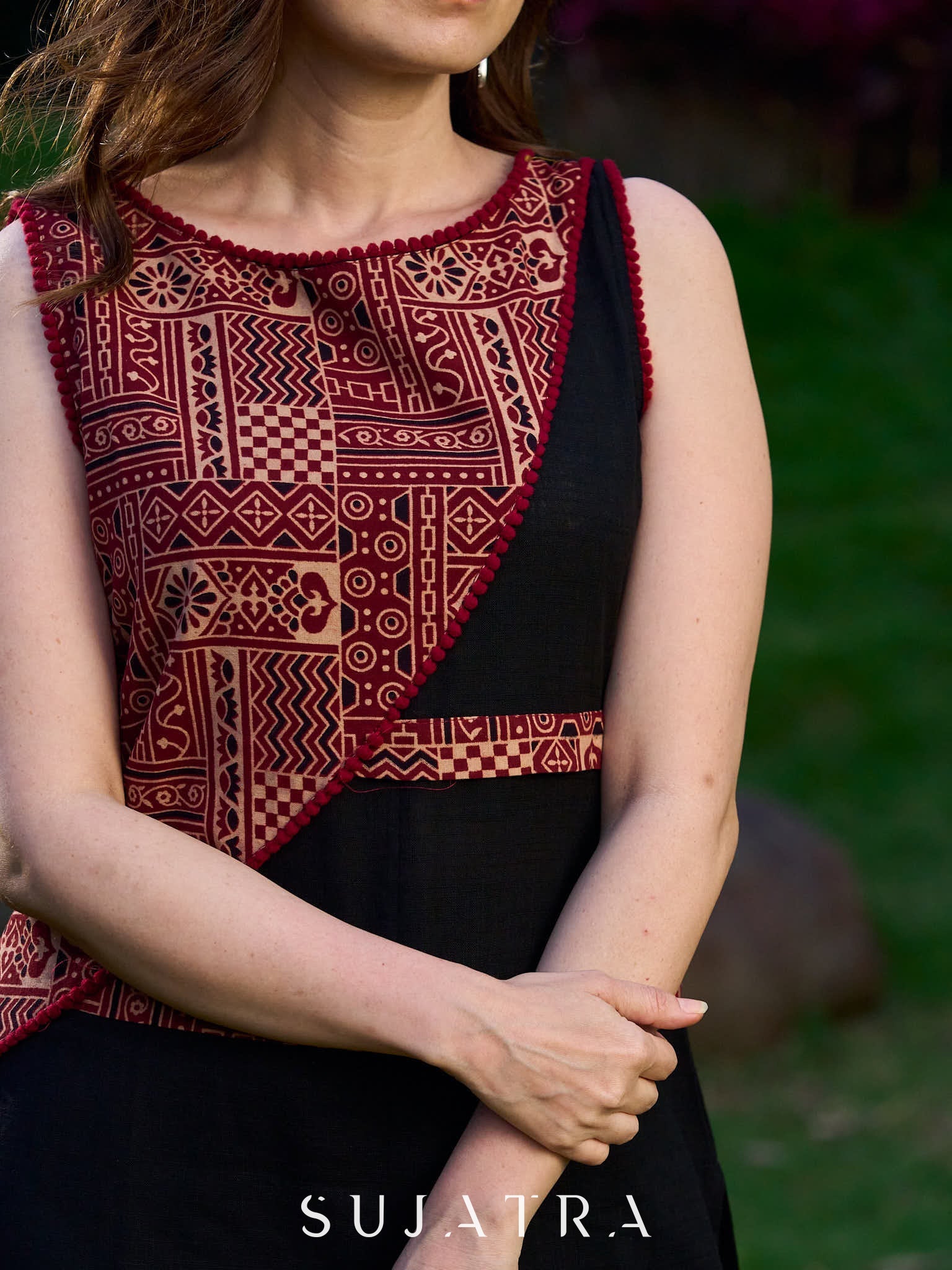 Modern Black Cotton Kurta with Asymmetric Maroon Ajrakh Patch Panel and Strap Details