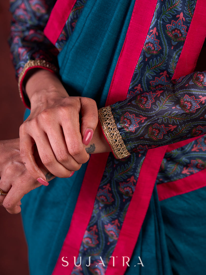 This Ocean Turquoise Cotton Saree features a subtle printed border and delicate silk pink highlights, giving it a touch of elegance. Made from high-quality cotton, this saree is perfect for any occasion and offers a comfortable fit. Stay stylish and comfortable with this beautiful saree.