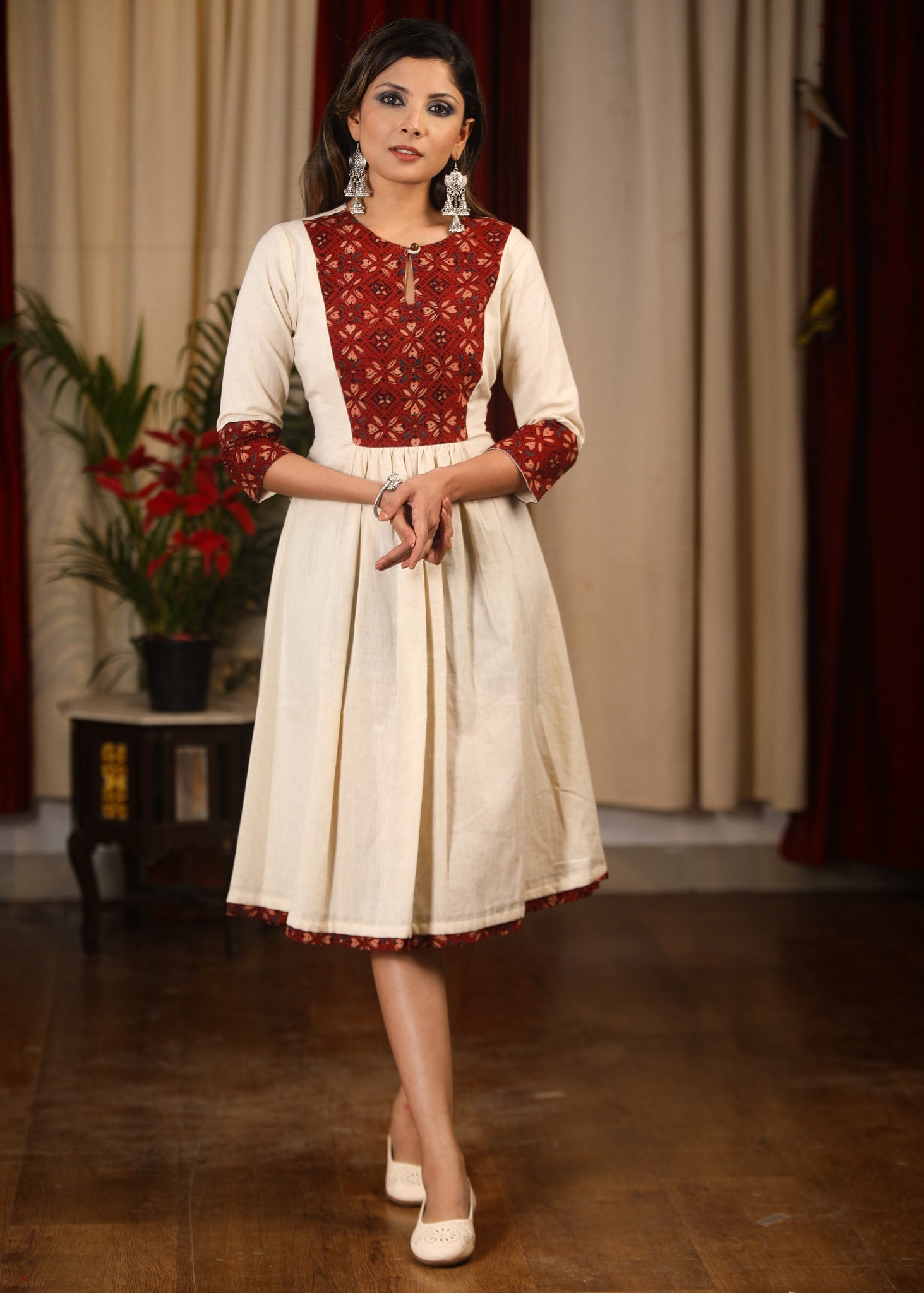 Off white cotton flex dress with Ajrakh block printed yoke