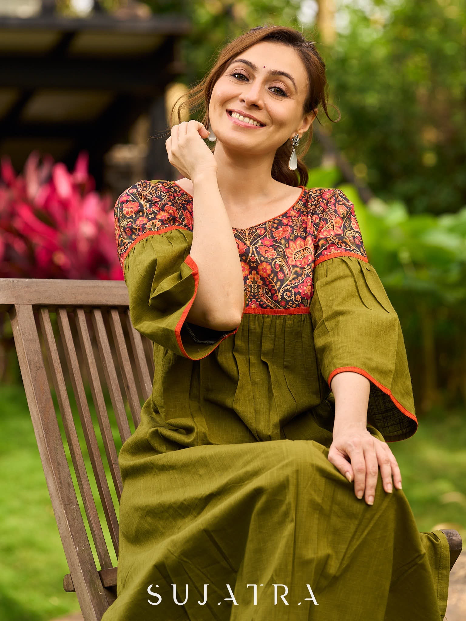 Olive Cotton Kurta with Digital Printed Yoke and Vibrant Orange Accents