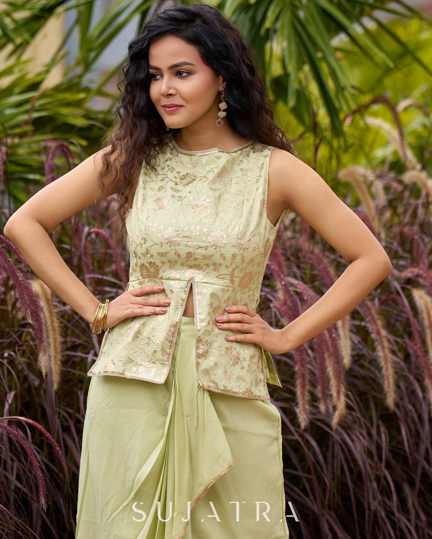 This festive green drape skirt features a beautiful brocade top, adding a touch of elegance to your outfit. With a pastel hue, this skirt is perfect for any special occasion. Made with high-quality materials, this skirt is comfortable and durable for all-day wear. Elevate your style with this stunning skirt.