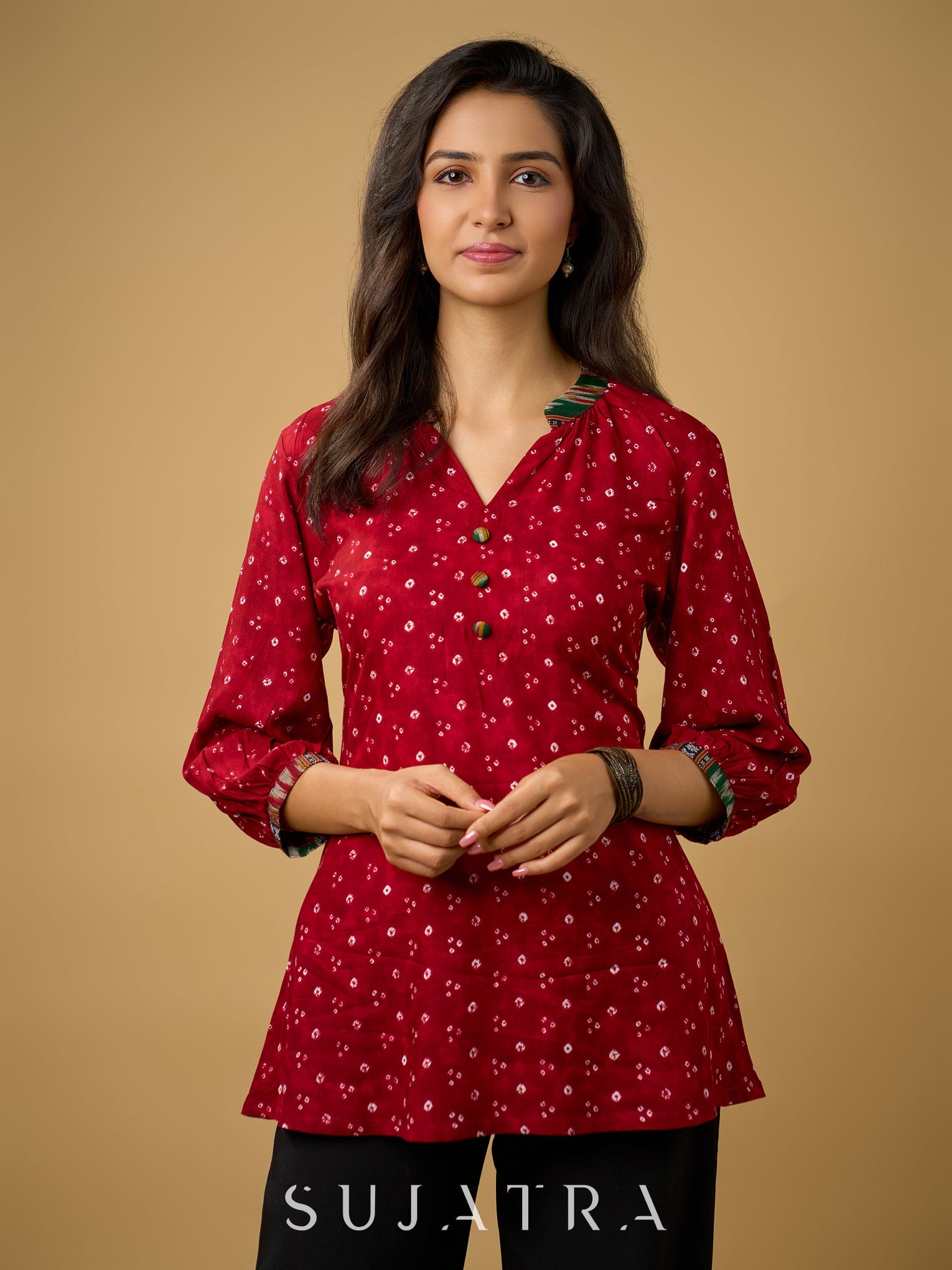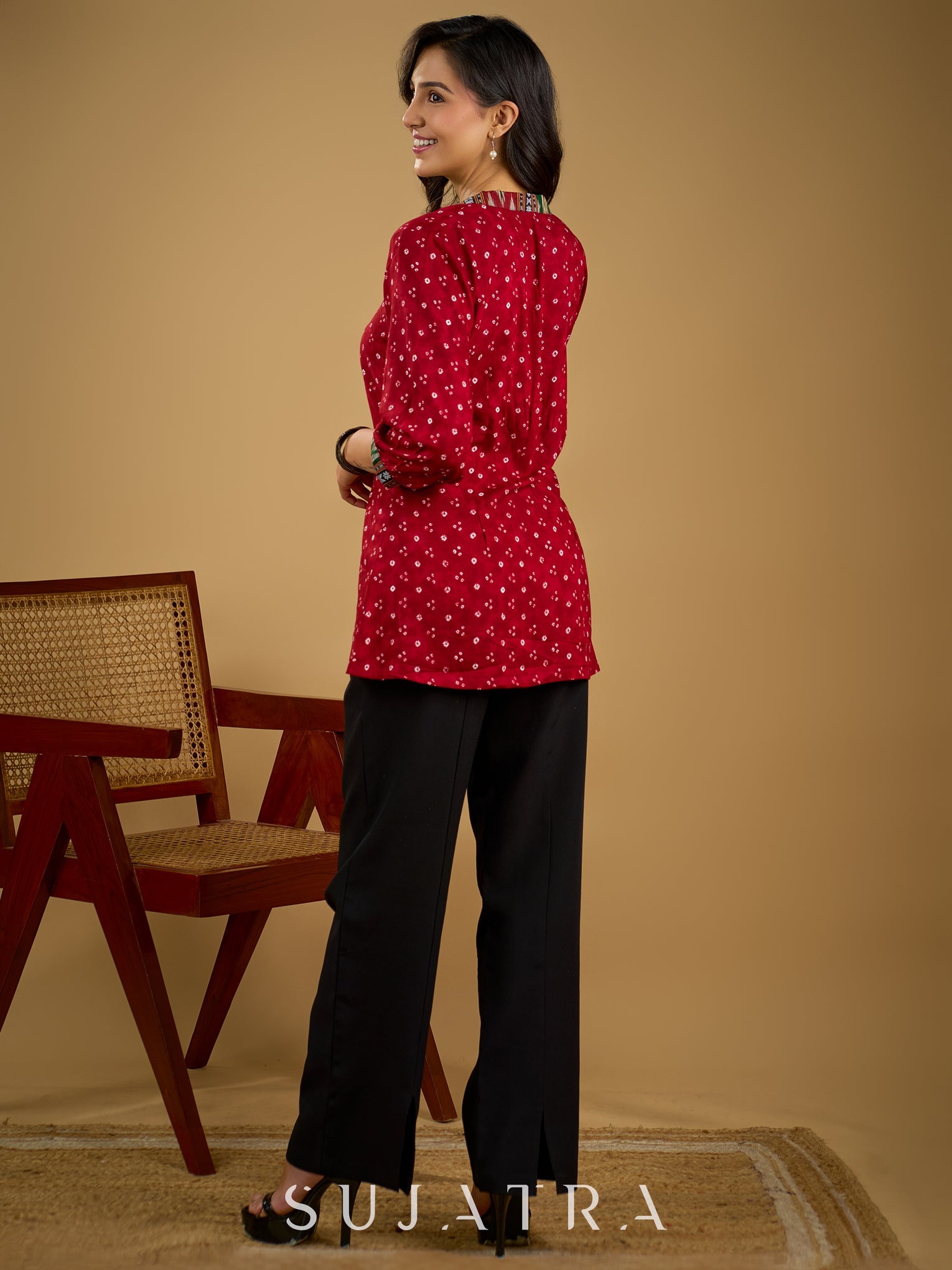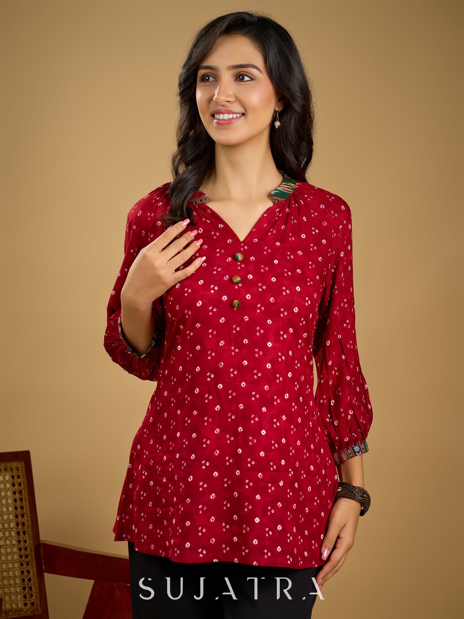 Red rayon bandhani top beautifully combined with classic ikat collar.