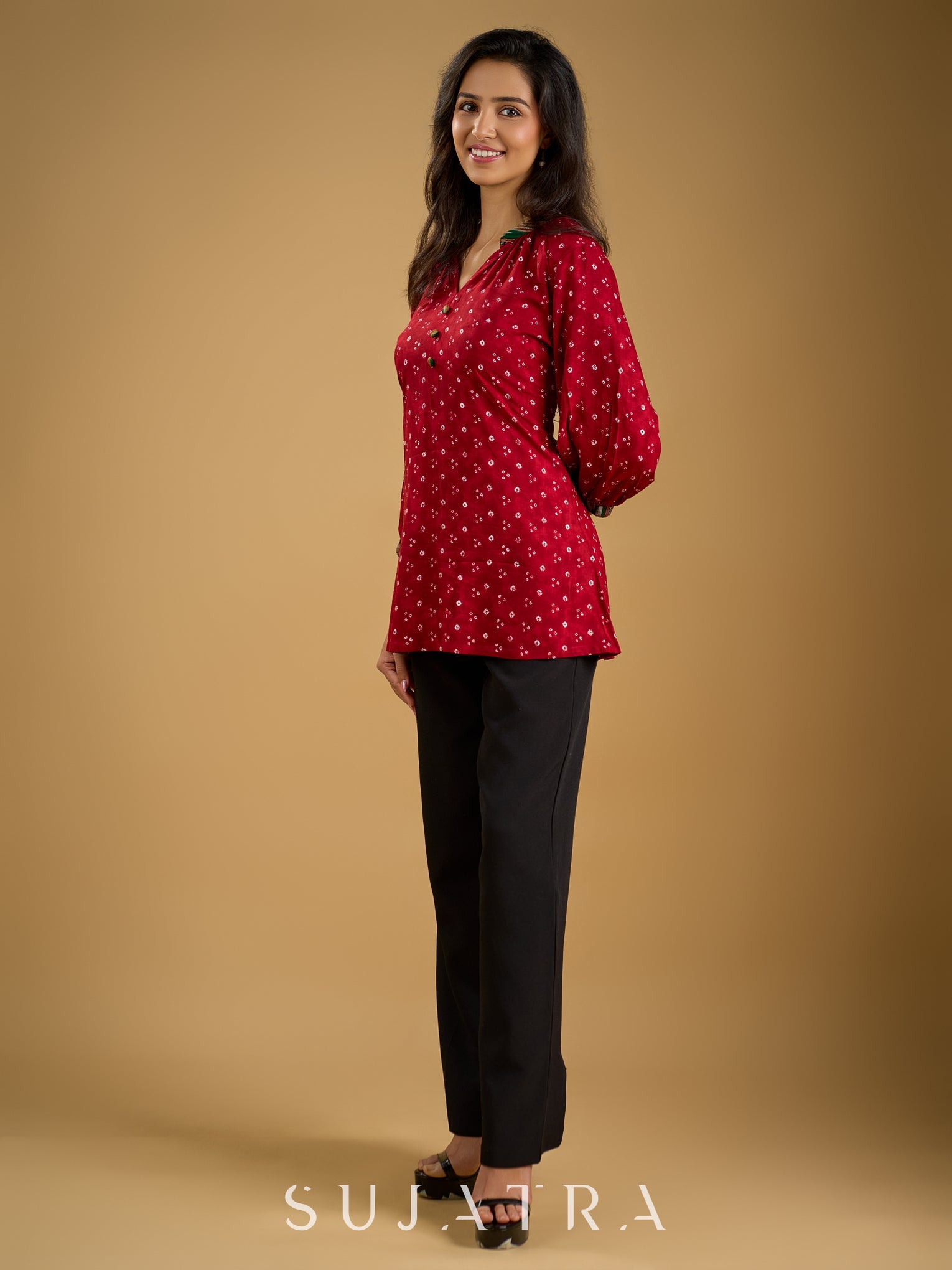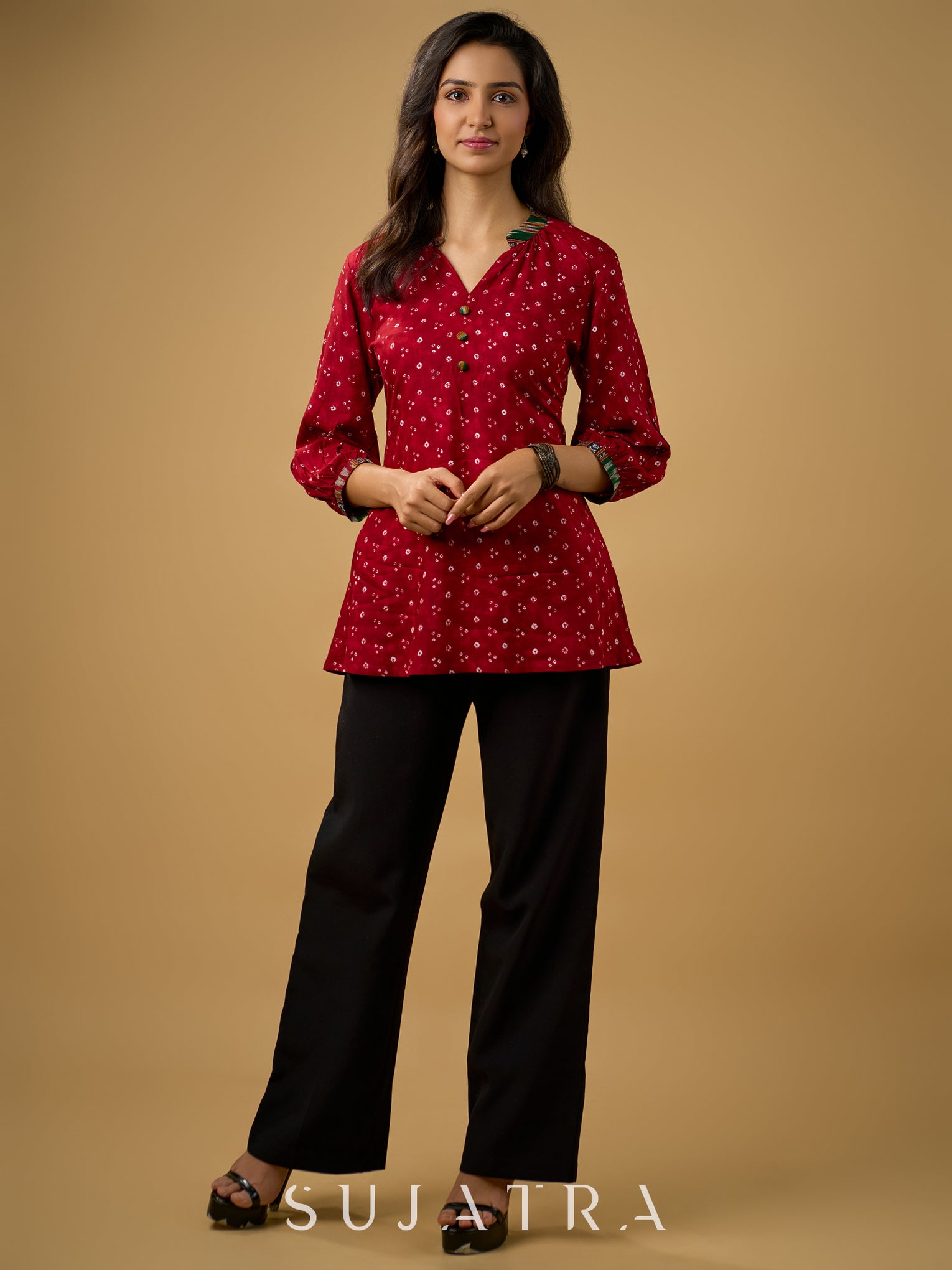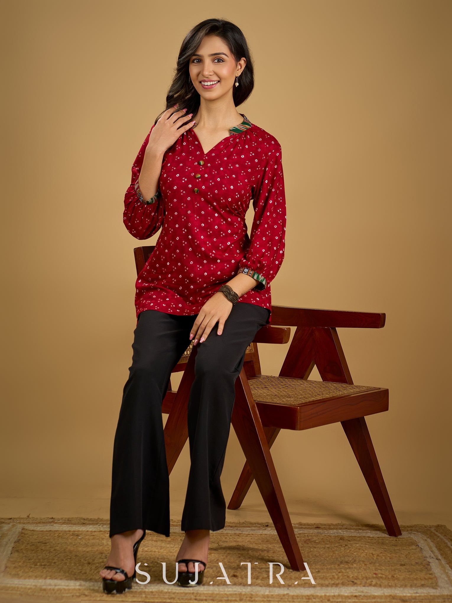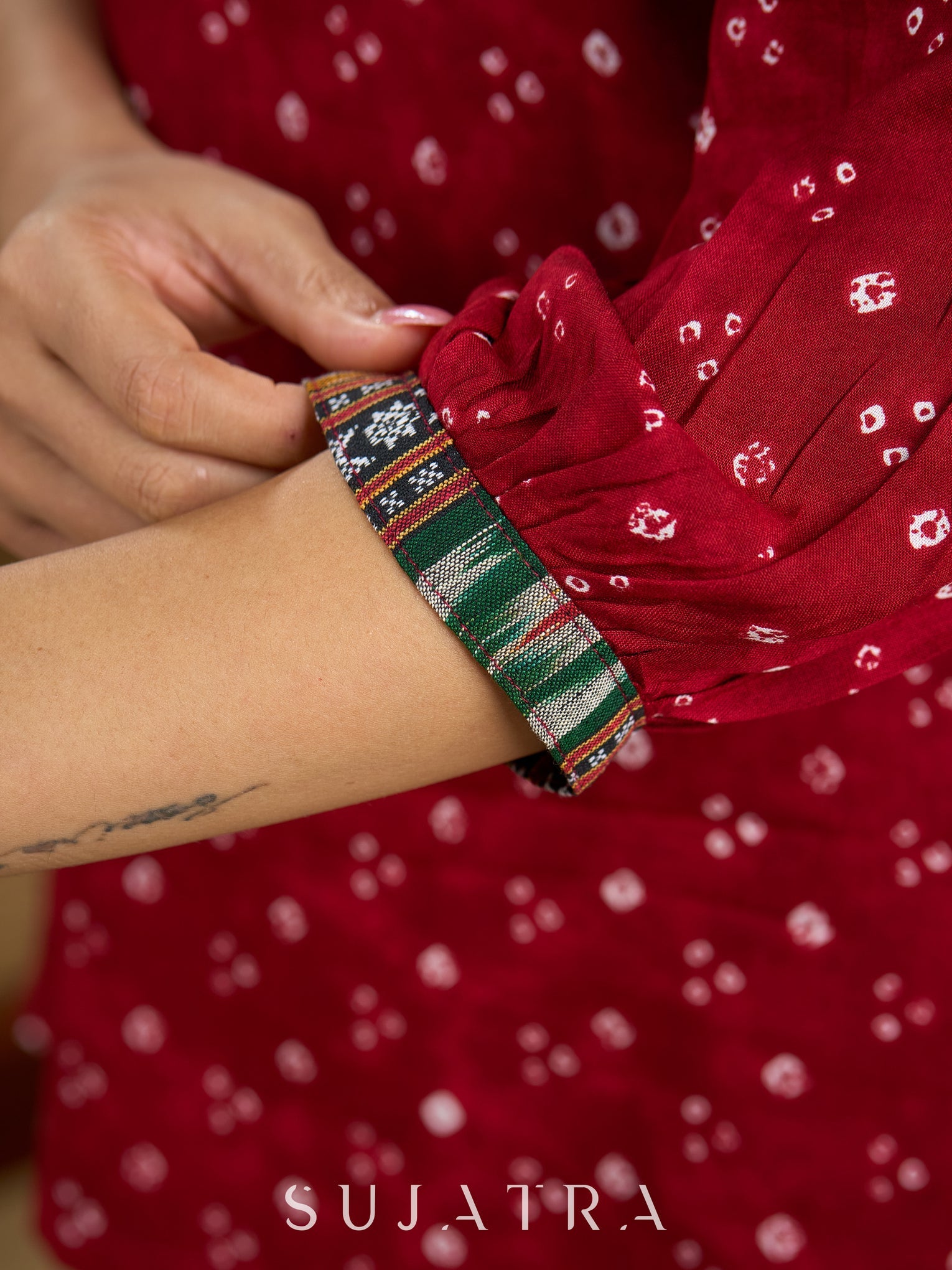 Red rayon bandhani top beautifully combined with classic ikat collar.