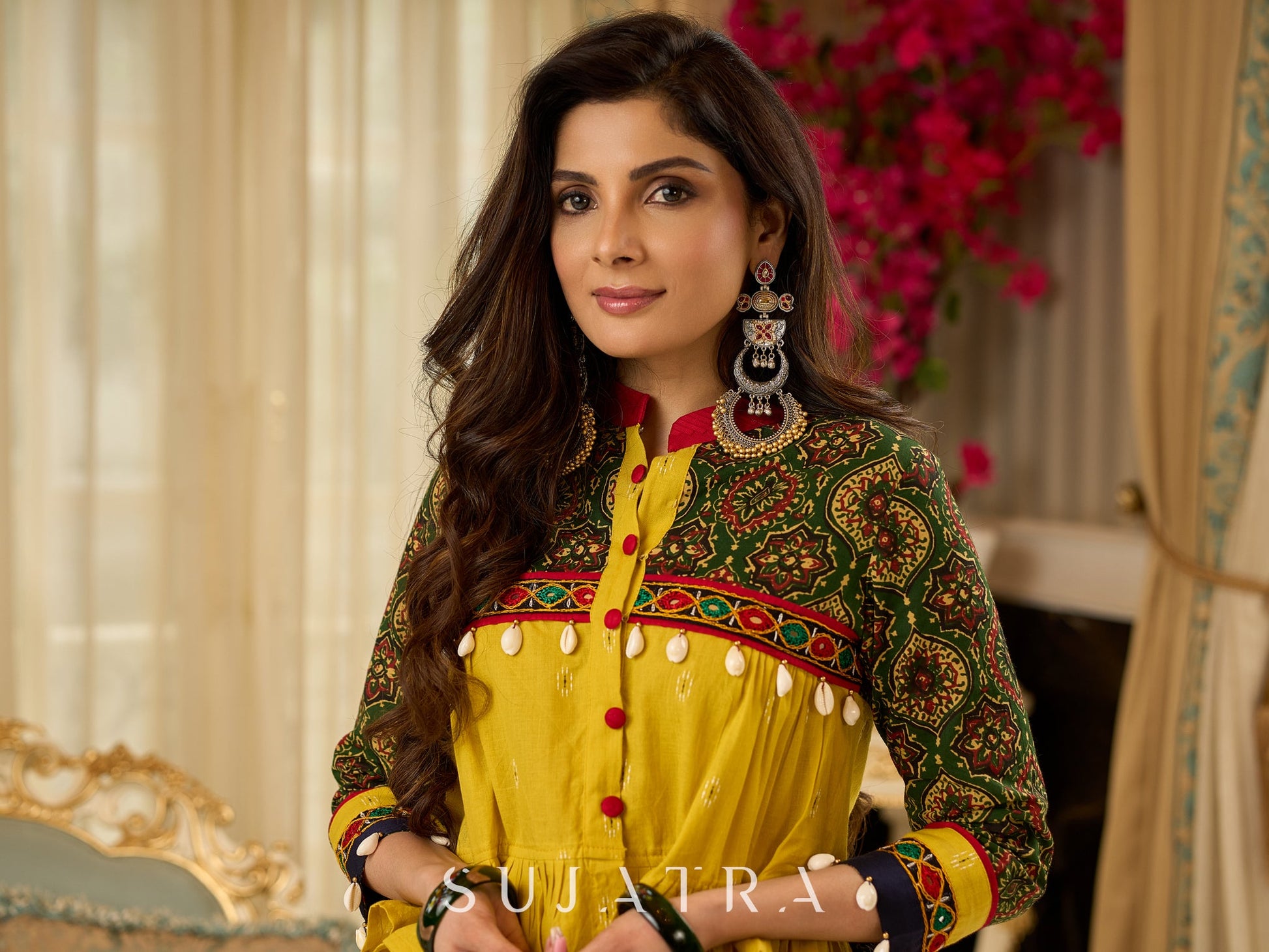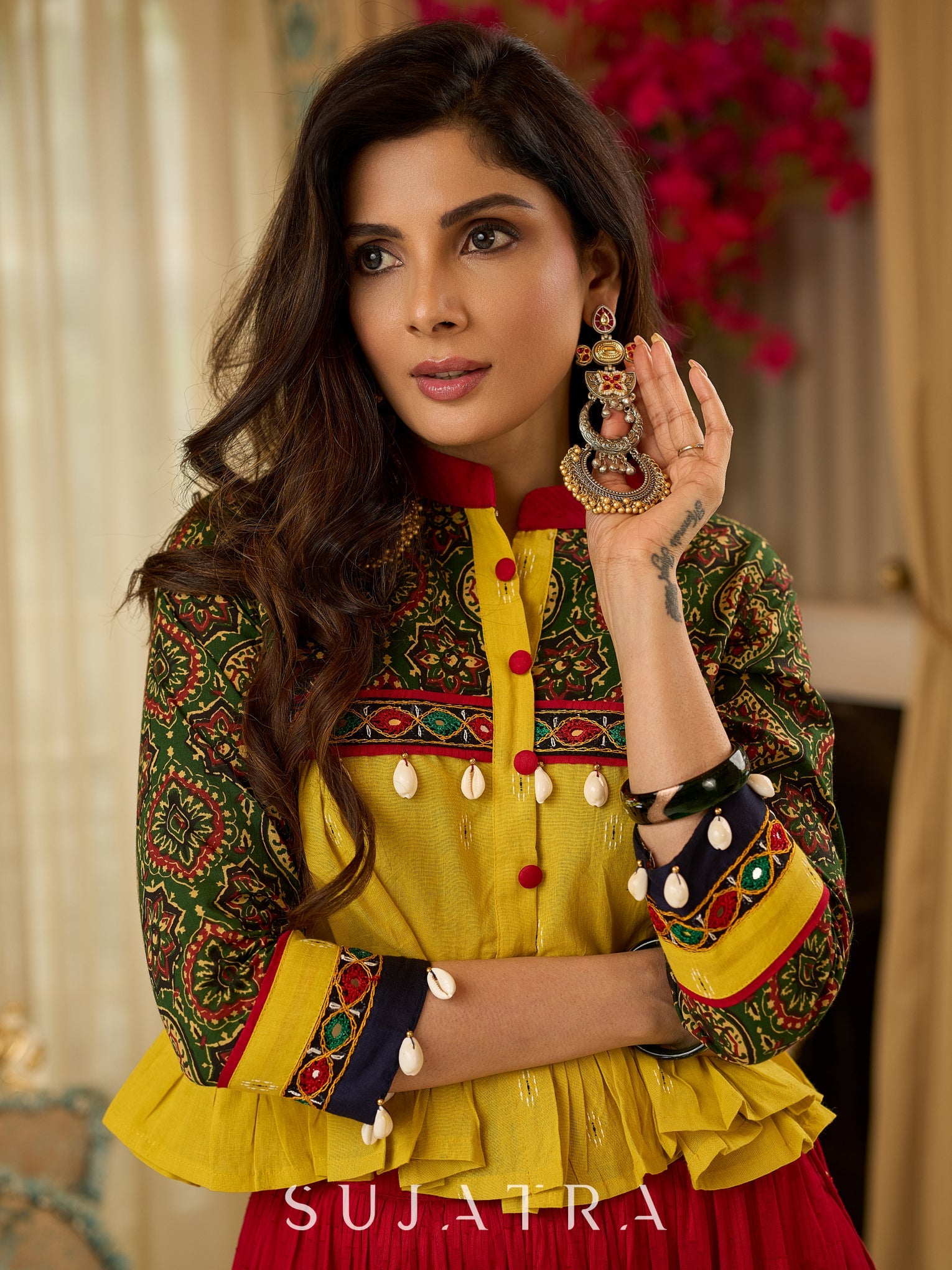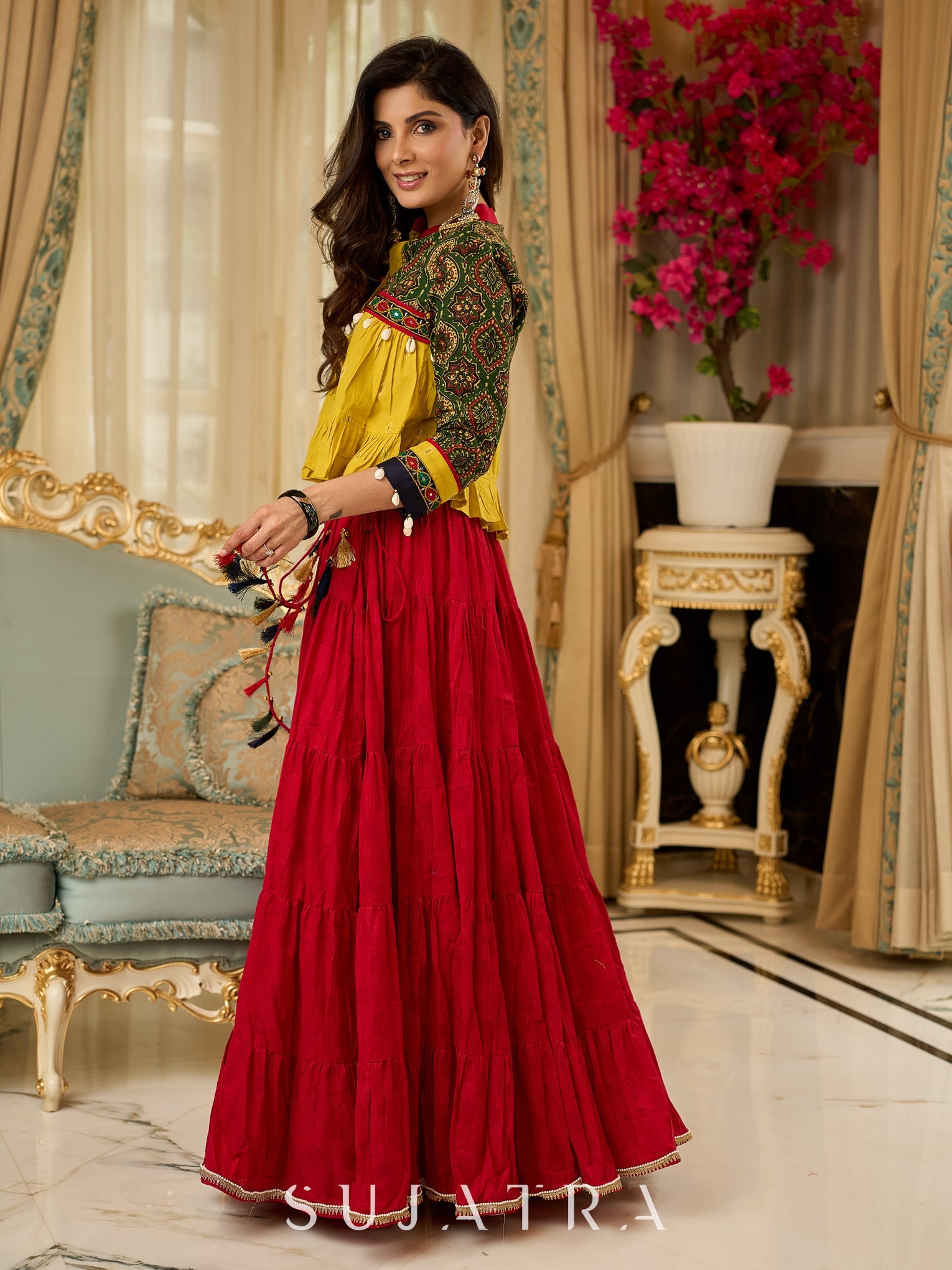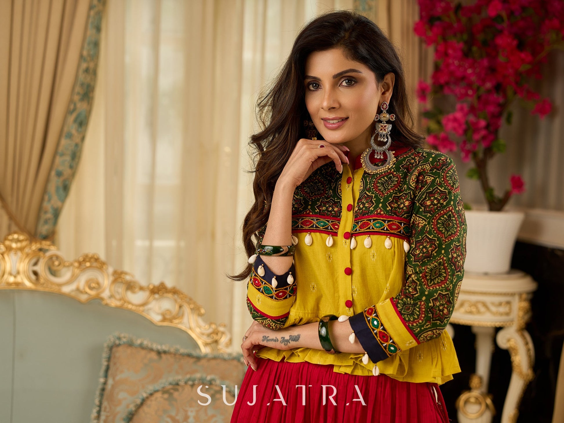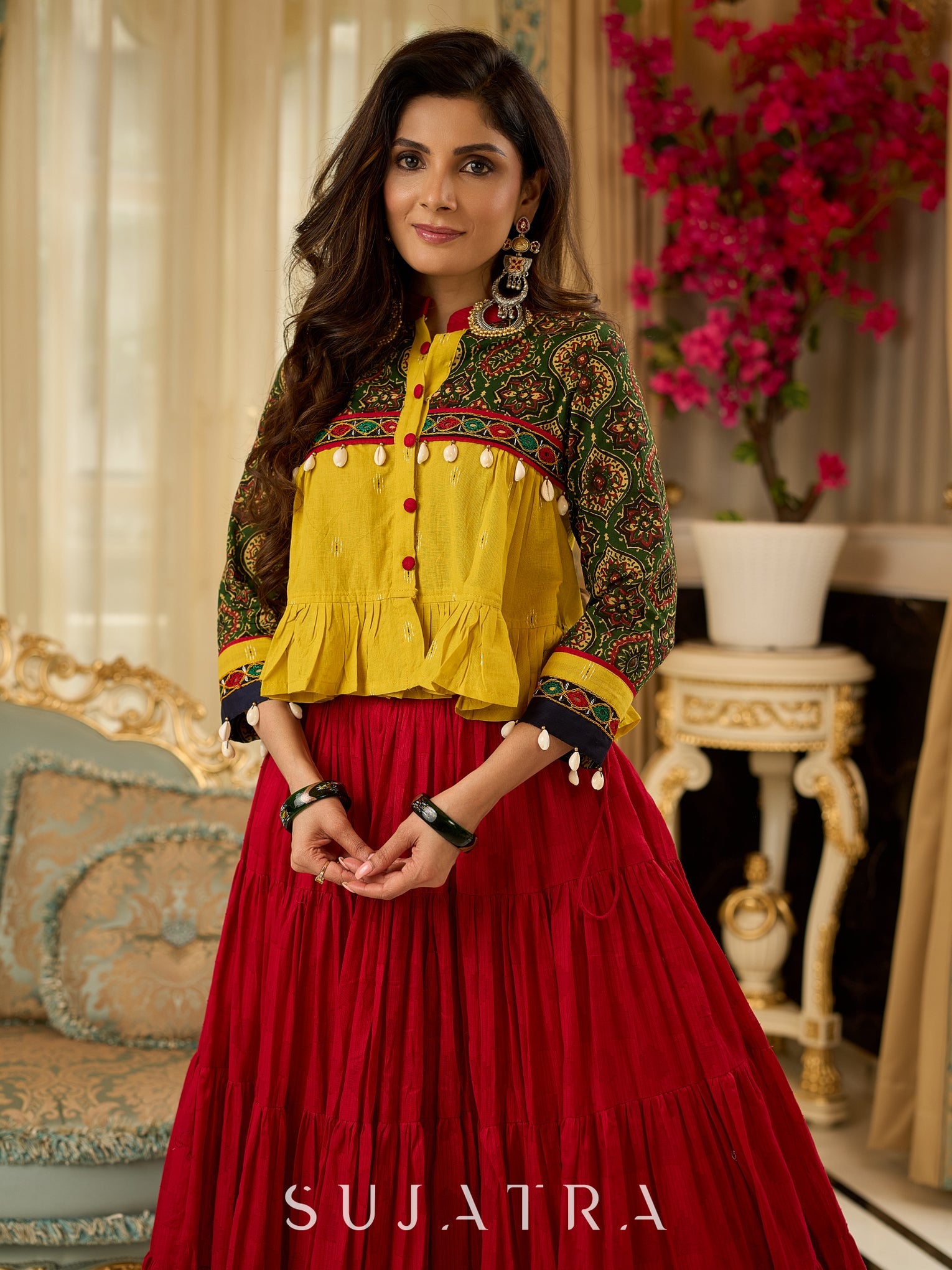 Red tiered Jamdani lehenga with a striking green Ajrakh and mustard jamdani choli featuring intricate mirror work & shell tassels .