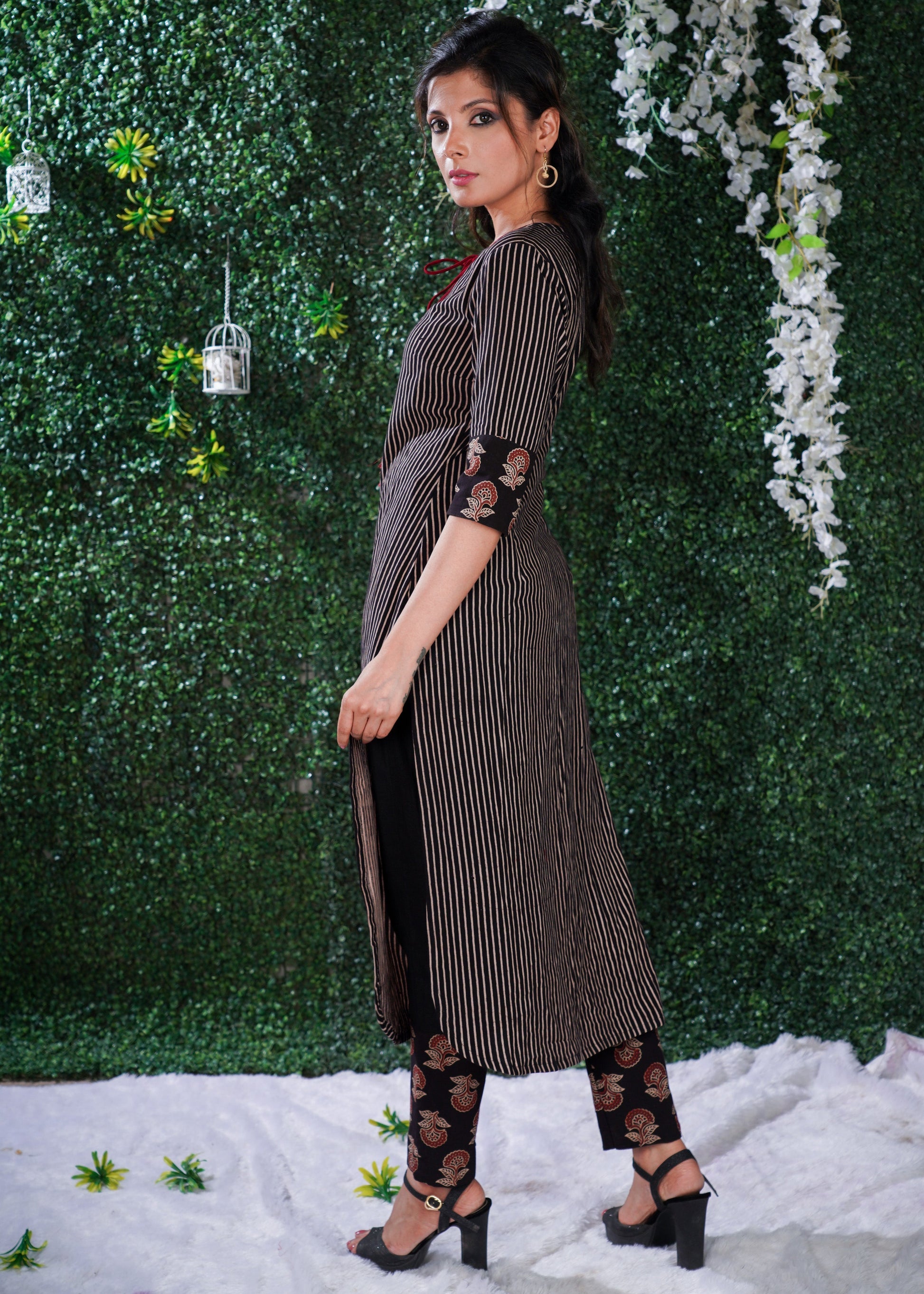 Black Cotton Ajrakh striped kurta with Ajrakh on sleeves
