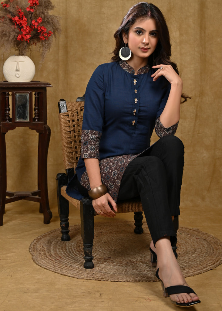 Trendy Straight Cut Tunic with Navy Blue Cotton & Grey Printed Ajrakh combination