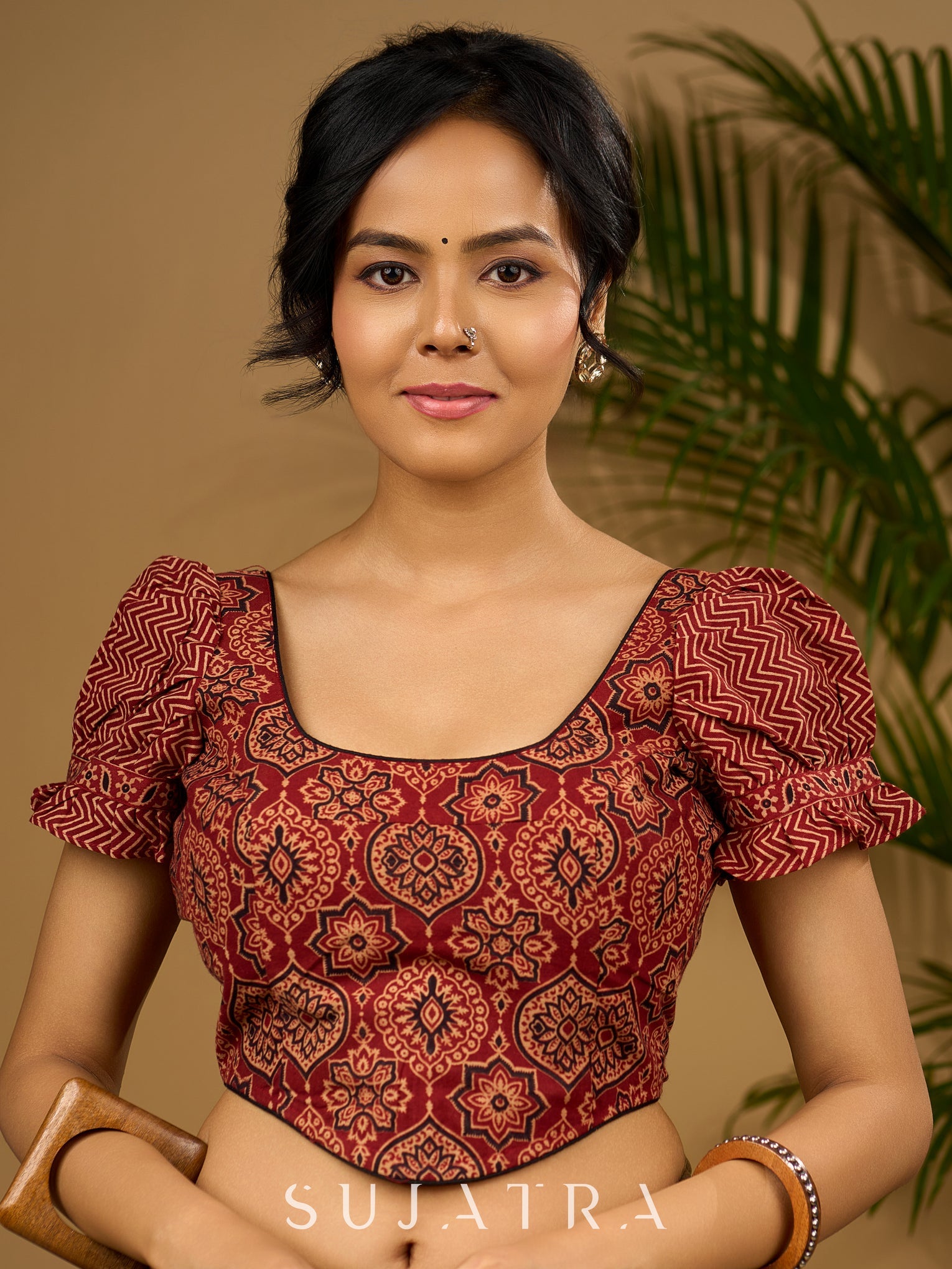 This sleek corset-style blouse features a fitted silhouette crafted from breathable cotton, combining traditional Ajrakh print artistry with modern tailoring. Its structured design enhances the waistline, offering a flattering and elegant fit ideal for both casual and formal occasions. The natural fabric ensures comfort while showcasing intricate patterns, making it a refined choice for those who appreciate heritage-inspired fashion with a contemporary edge.