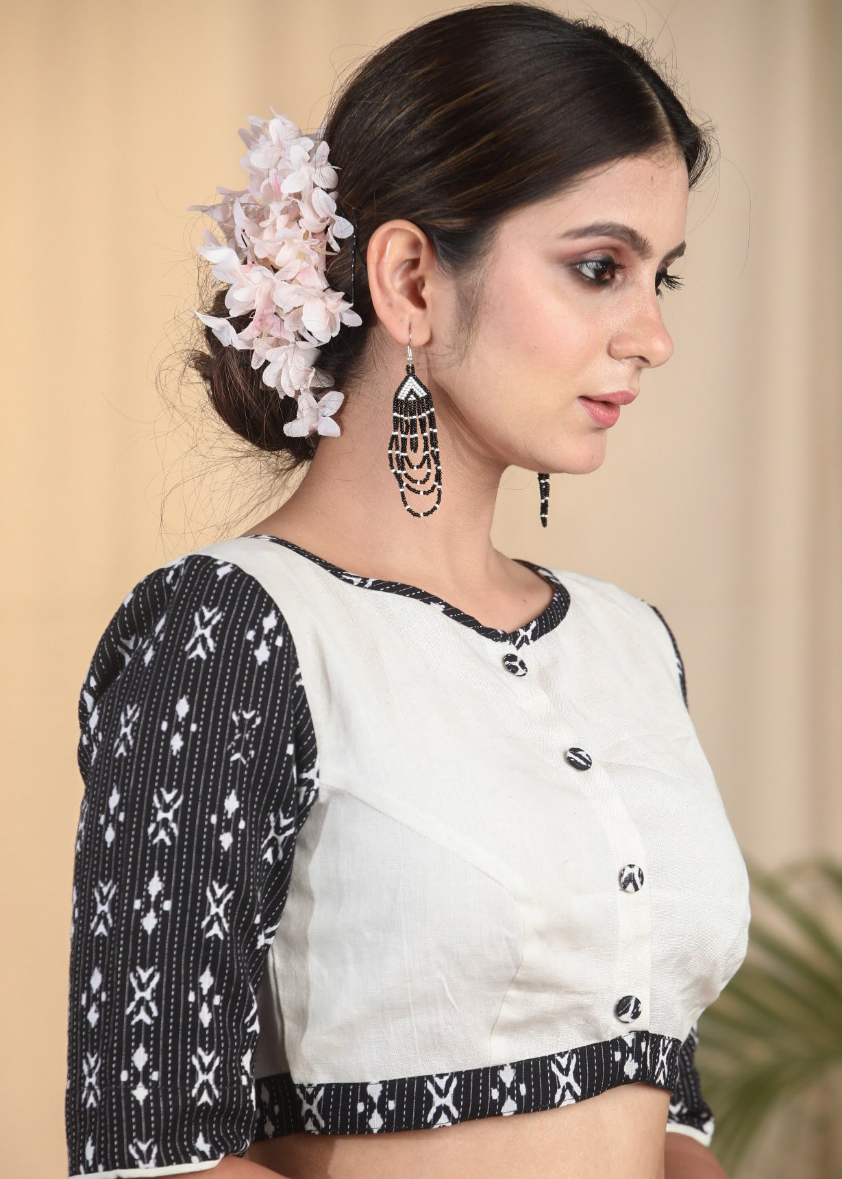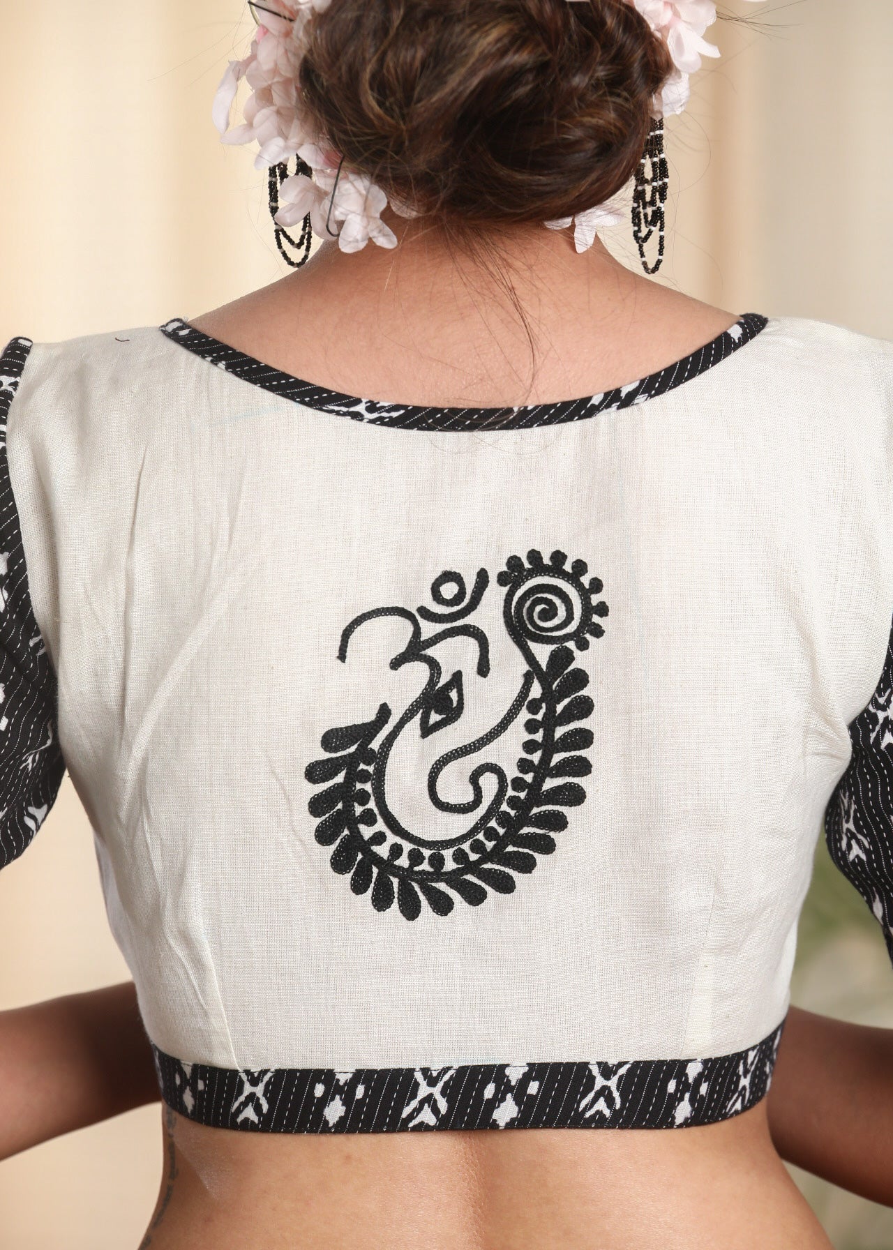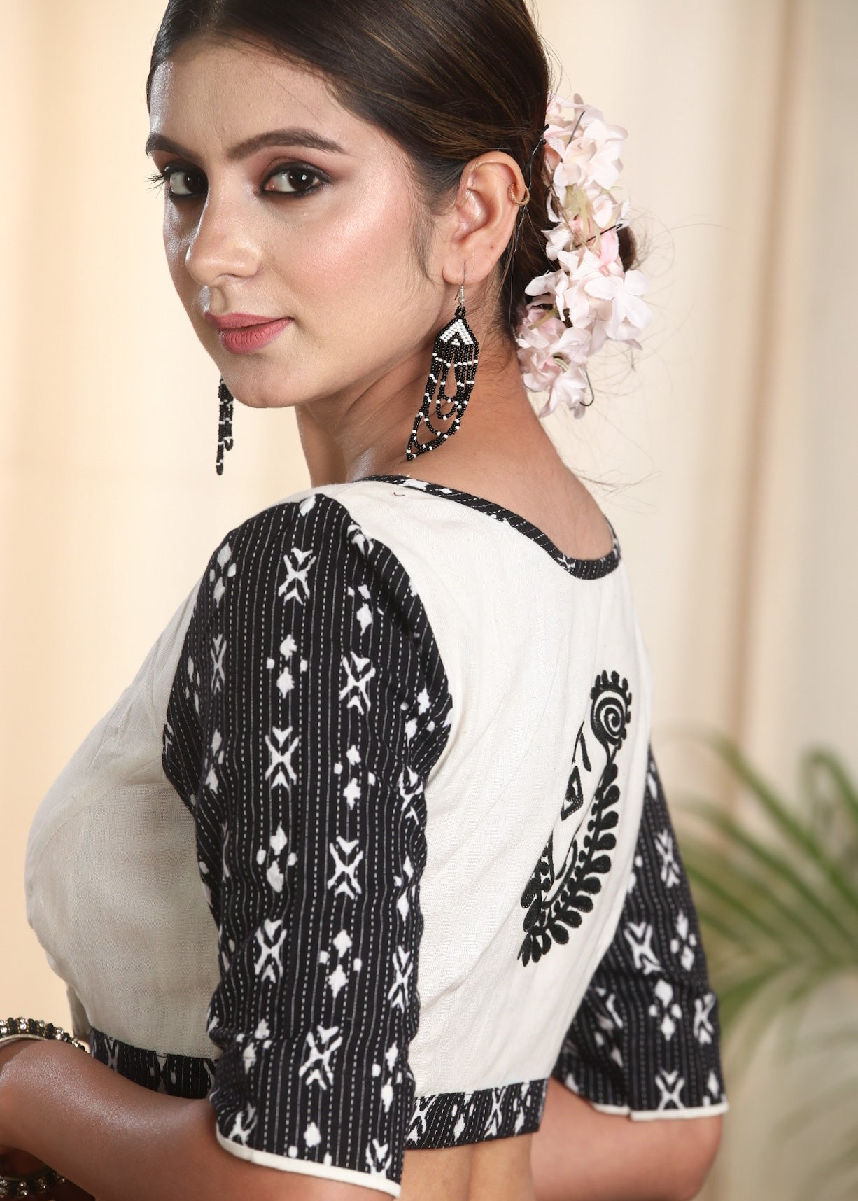 Elevate your wardrobe with this standout cotton slub blouse, featuring eye-catching Kantha print sleeves that bring vibrant artistry to your look. The beautifully embroidered motif on the backside adds a unique, handcrafted touch that sets you apart. Made from soft, breathable cotton slub fabric, this blouse offers both comfort and style, perfect for making a lasting impression at any event. Embrace tradition with a modern twist and make this blouse your new favorite statement piece.