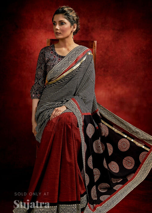 Experience the beauty of Ajrakh and stand out in this striped one piece dress. Challenge yourself to be bold and embrace the unique maroon combination. Strike a perfect balance between comfort and style with this cotton dress!