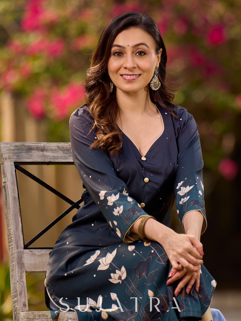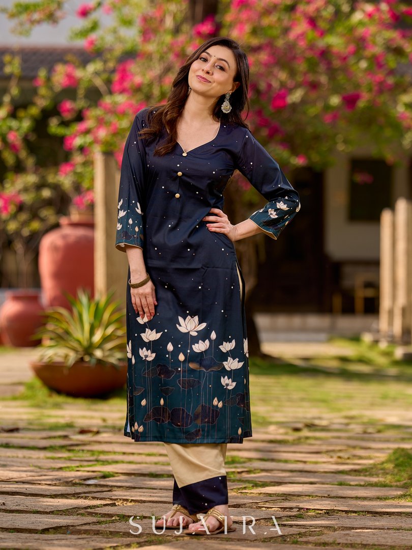 Stunning bottle green kurta adorned with a cream lotus midnight-inspired print.