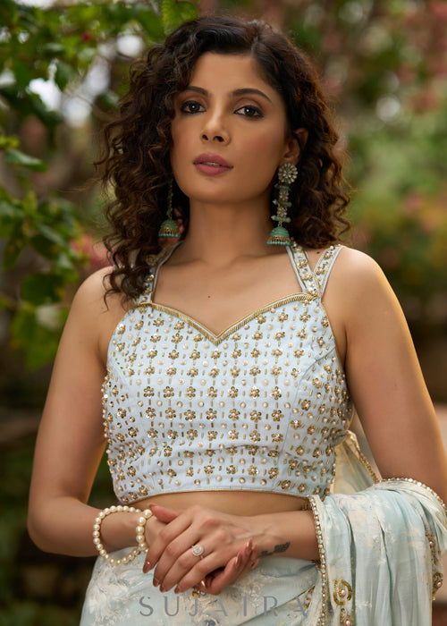 Expertly designed with stunning golden embroidery, our stylish ice blue saree features a beautiful floral print. Elevate your look with this elegant saree and turn heads at any occasion. Made with high quality materials for a luxurious feel, this saree is the perfect addition to your wardrobe.