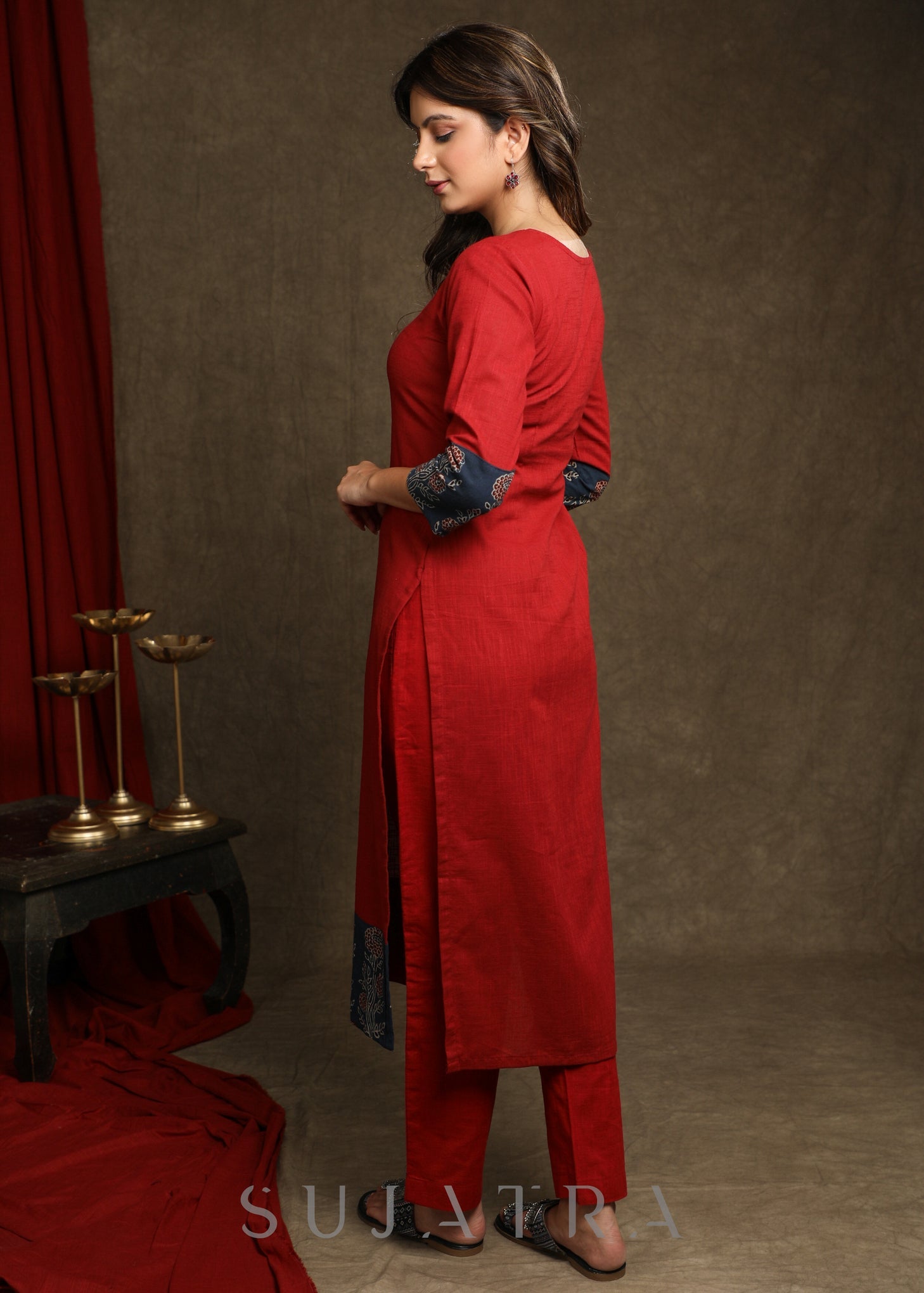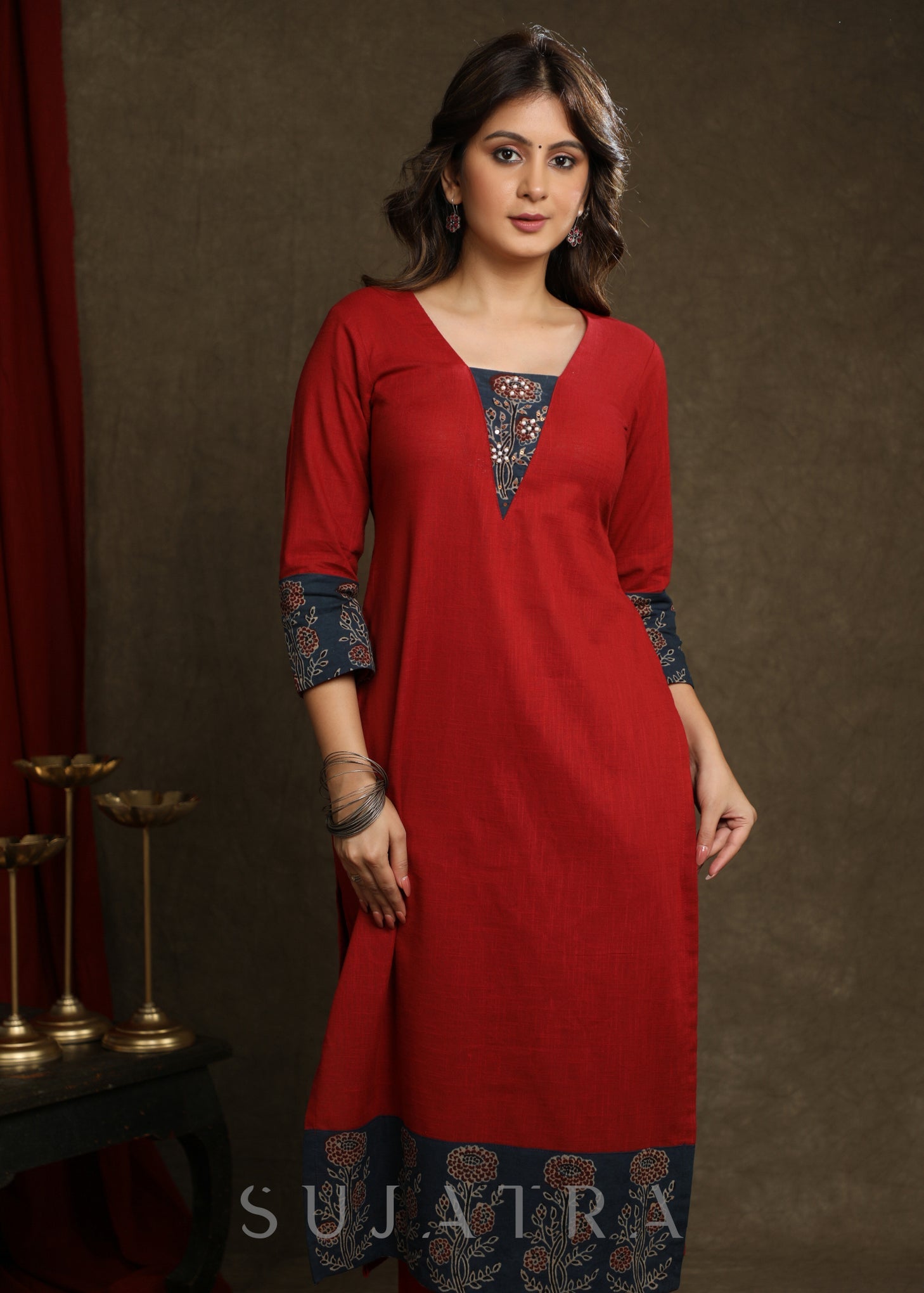 Stylish Maroon Cotton Ajrakh Combination Kurta With Pearl Embellishments - Pant Optional