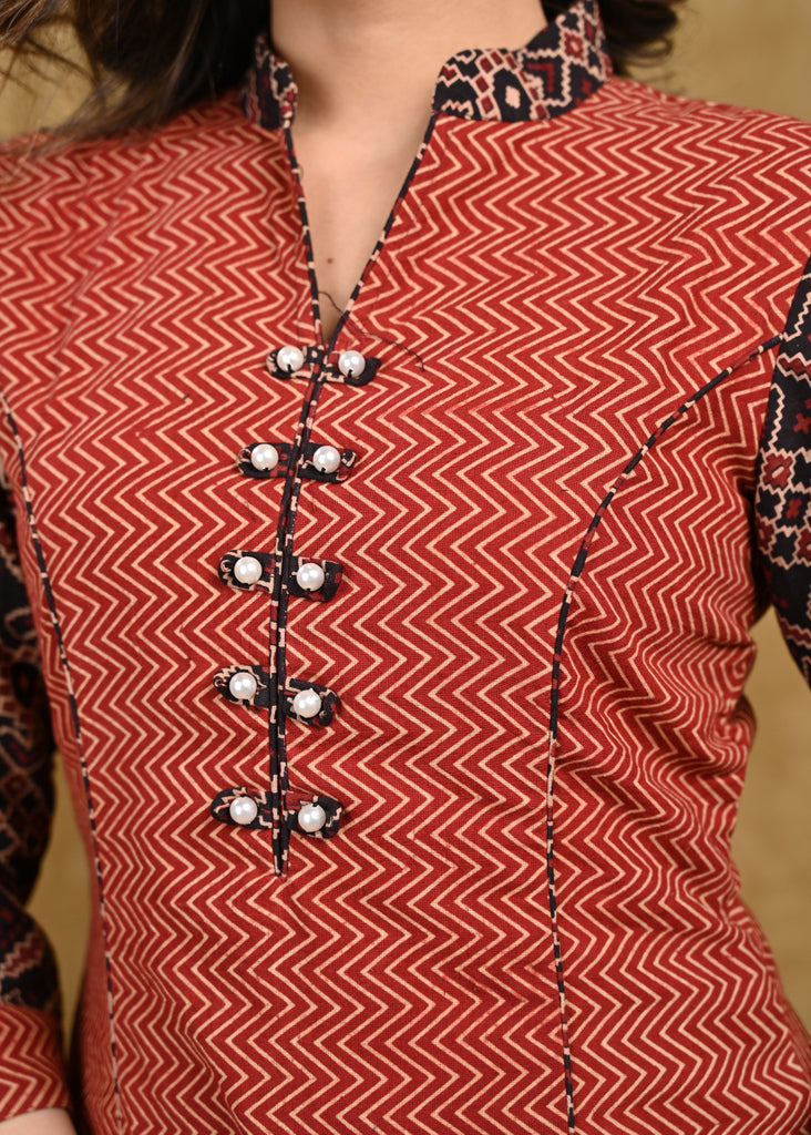 Stylish Zigzag Ajrakh Straight Cut Tunic with Printed Ajrakh Sleeves