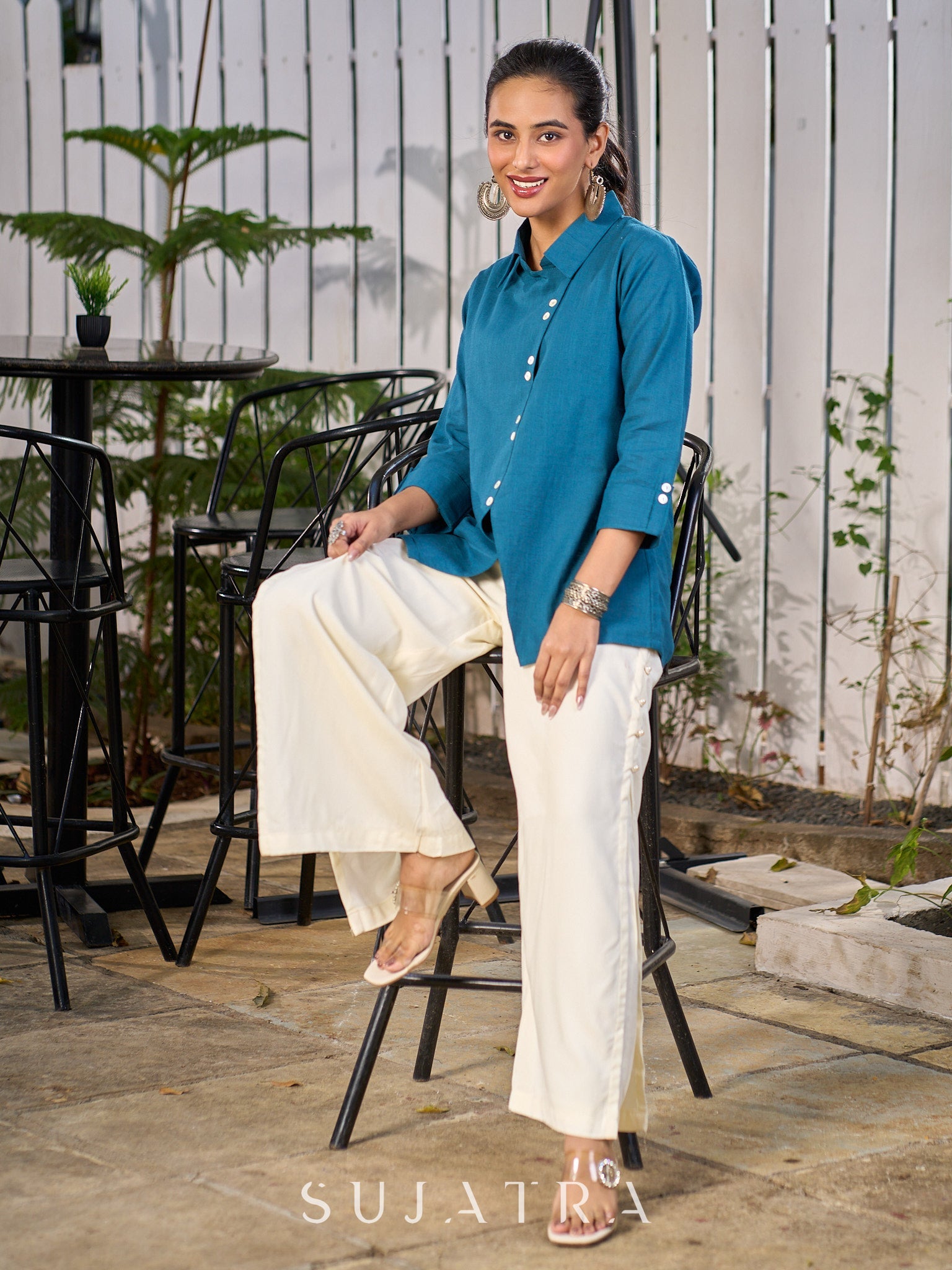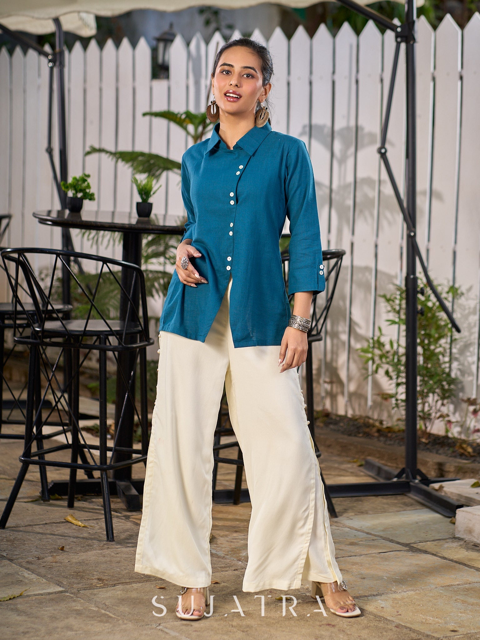 Teal Blue Cotton Shirt With Contemporary Asymmetrical Cut