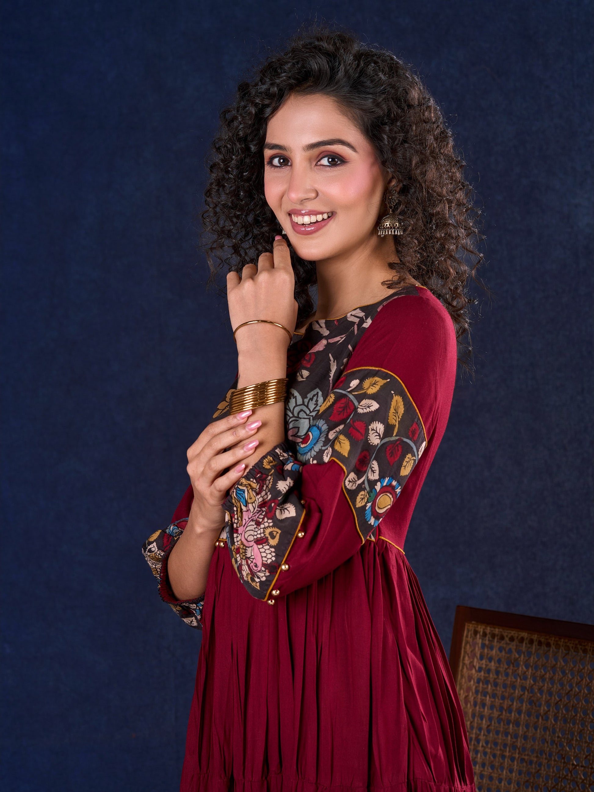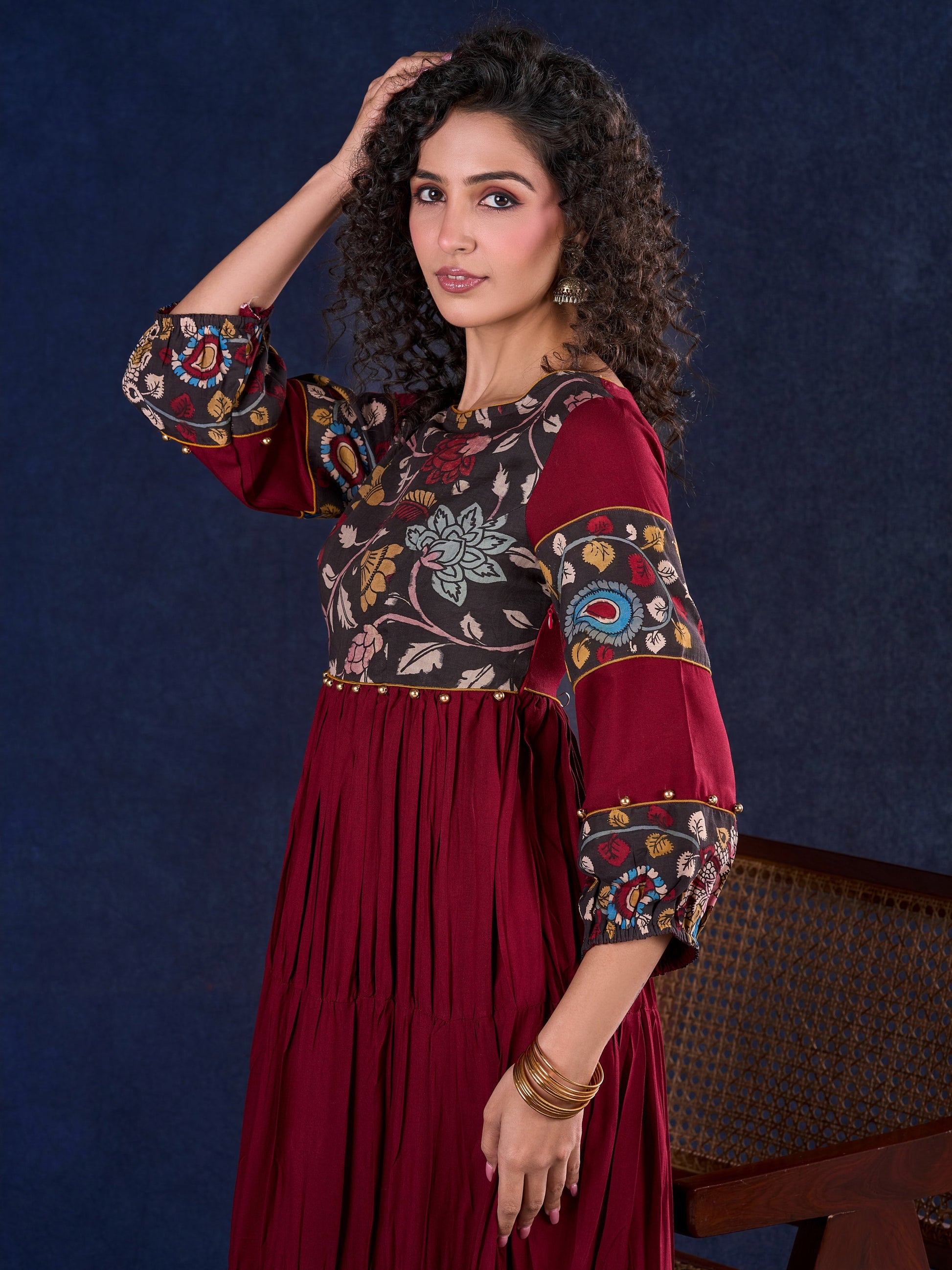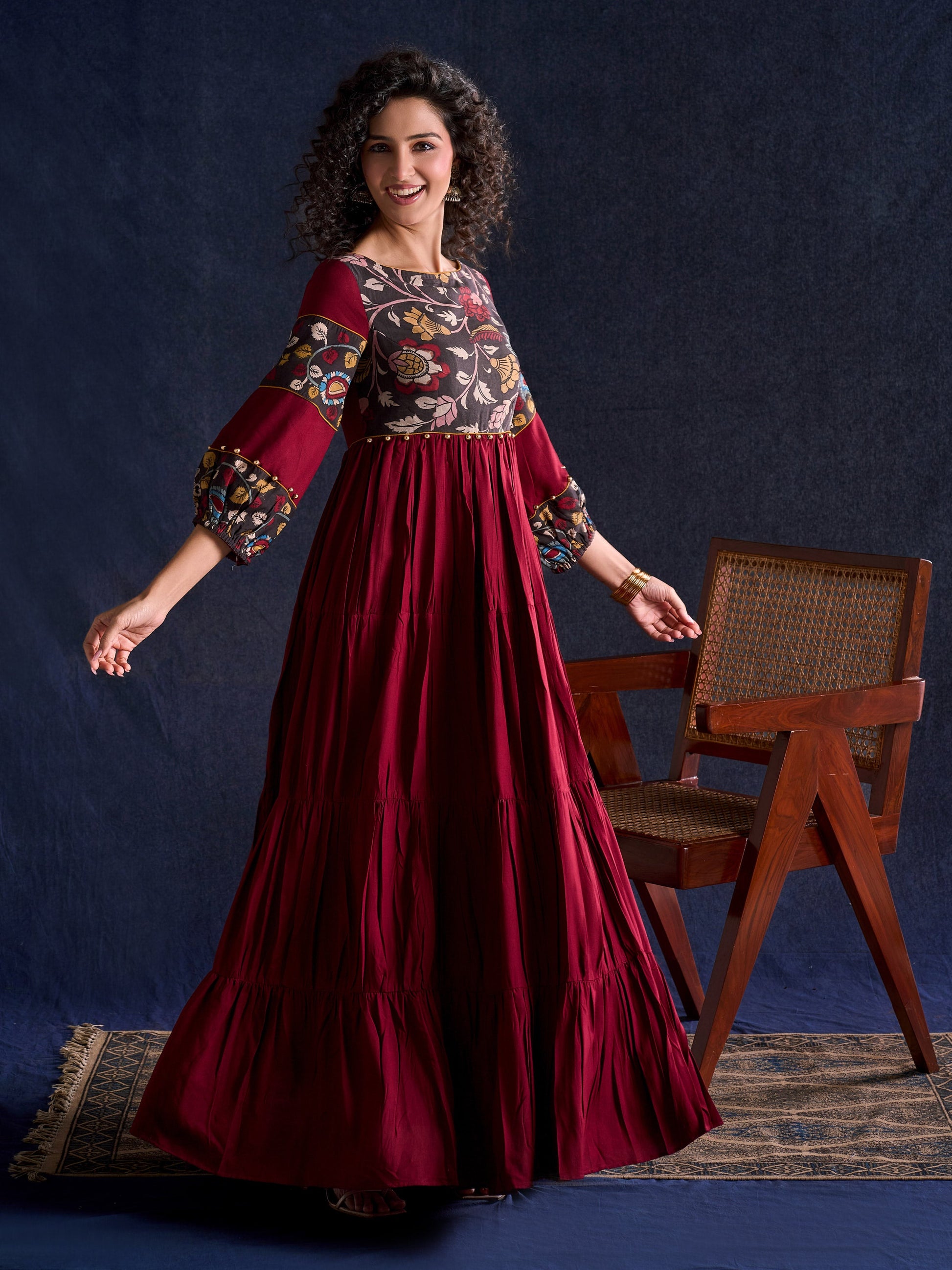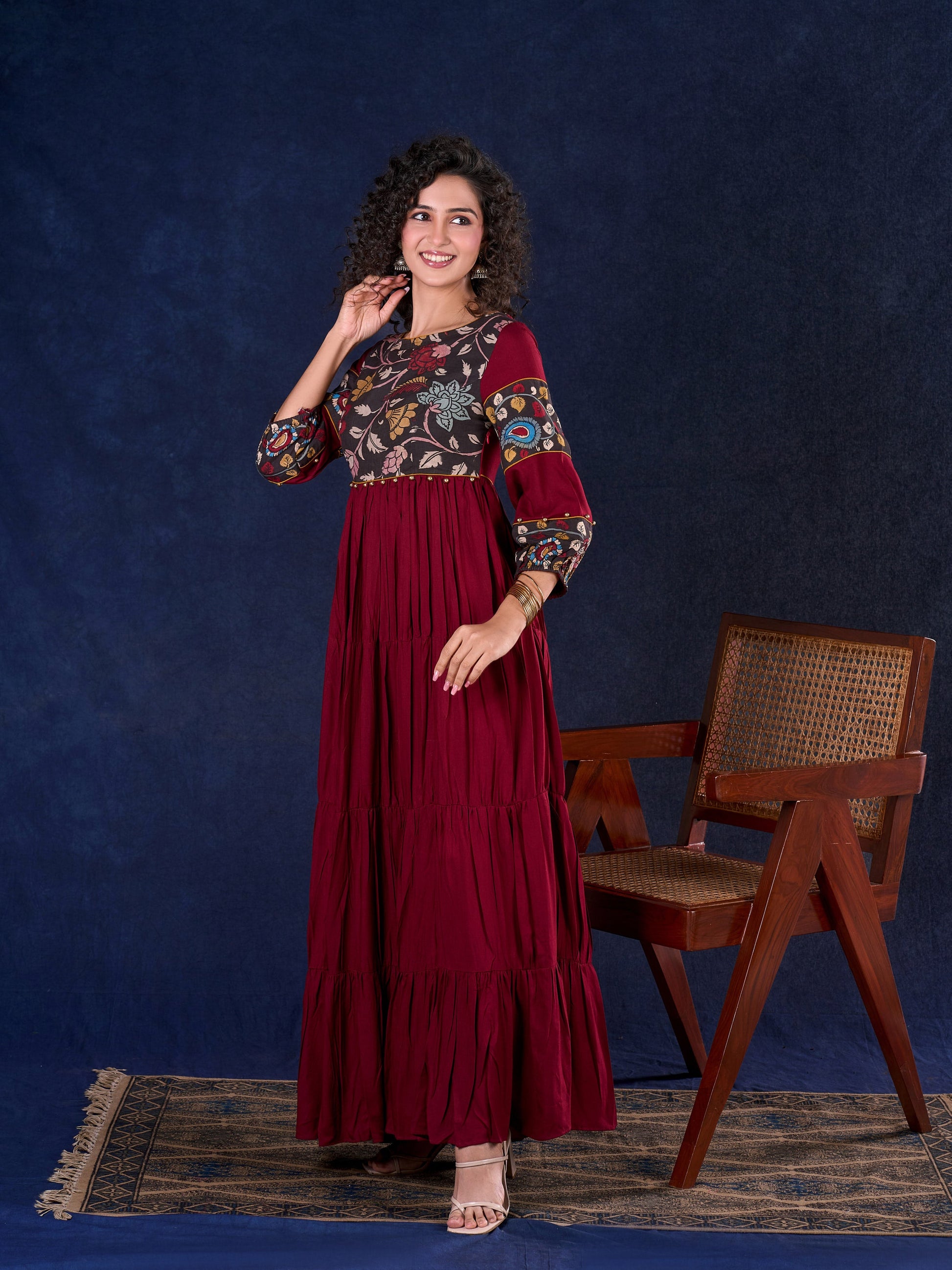 Timeless Maroon Rayon Layered Gown with Gathers and Hand Painted Kalamkari Accents featuring Puffy Sleeves and Delicate Golden Accents