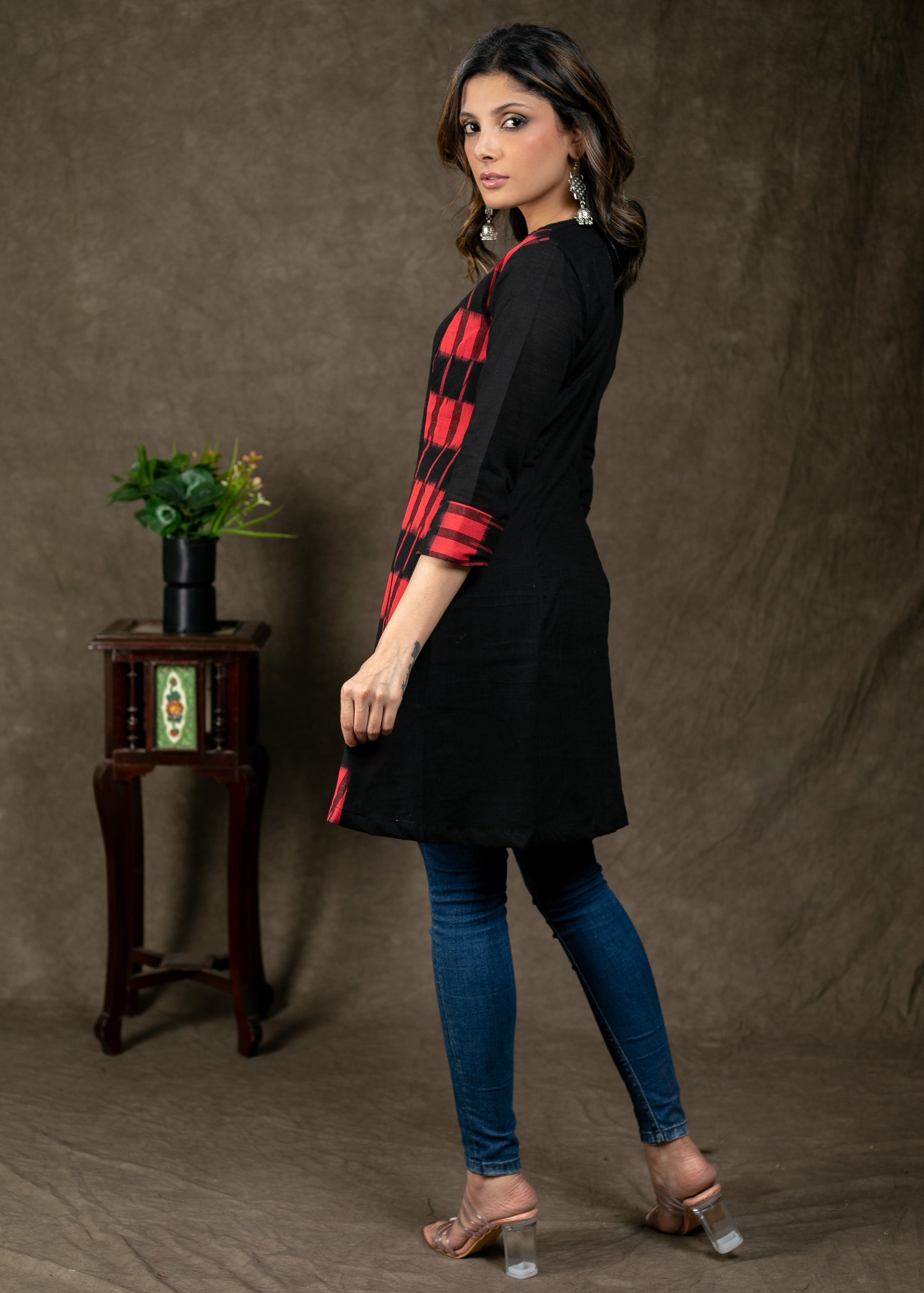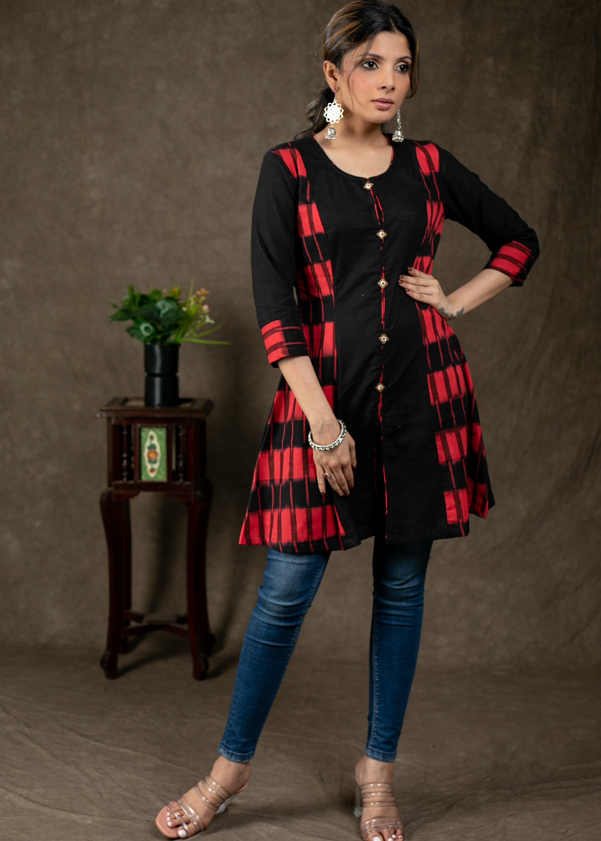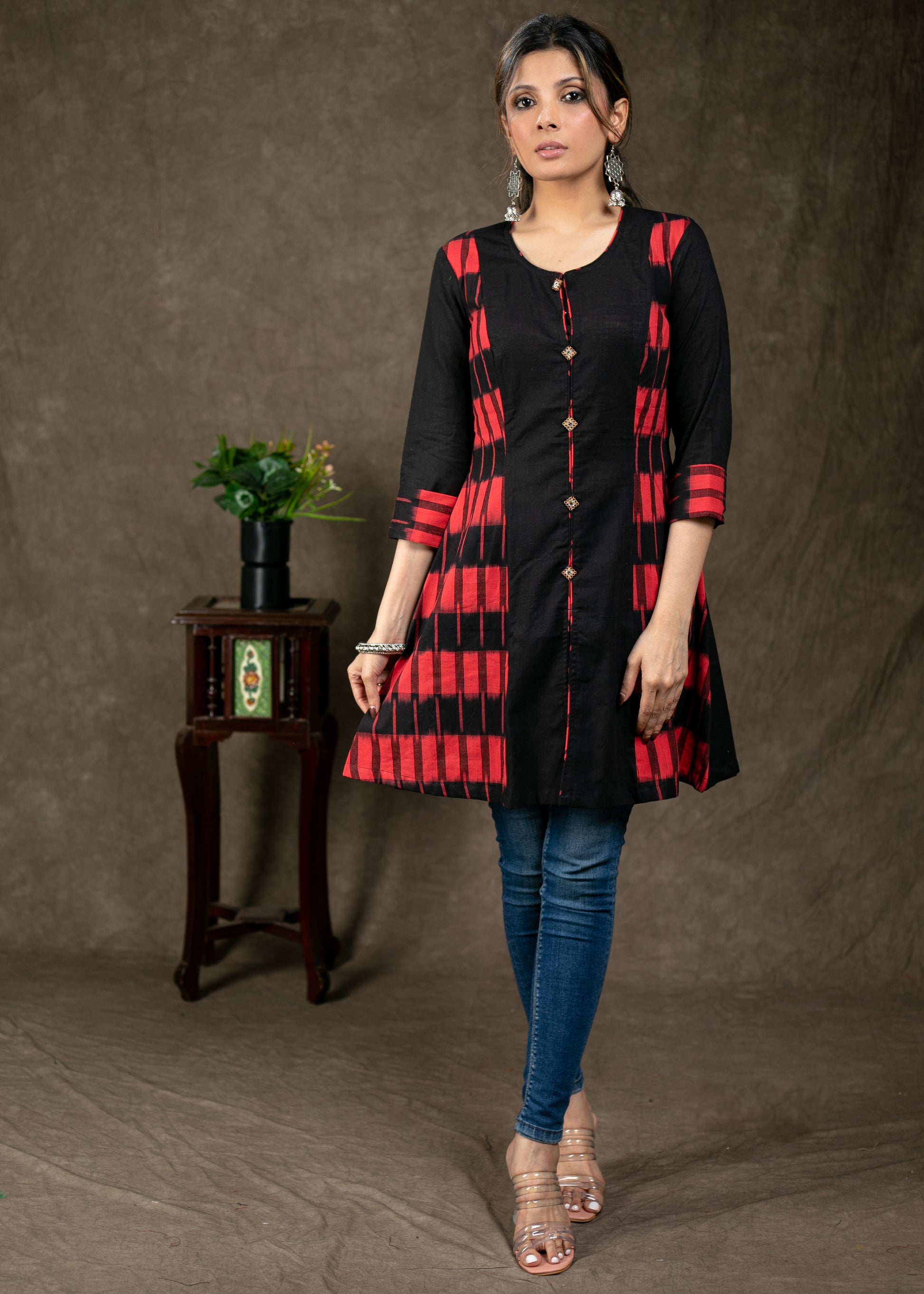 Trendy Double Ikat Combination Cotton Tunic with Wooden Button