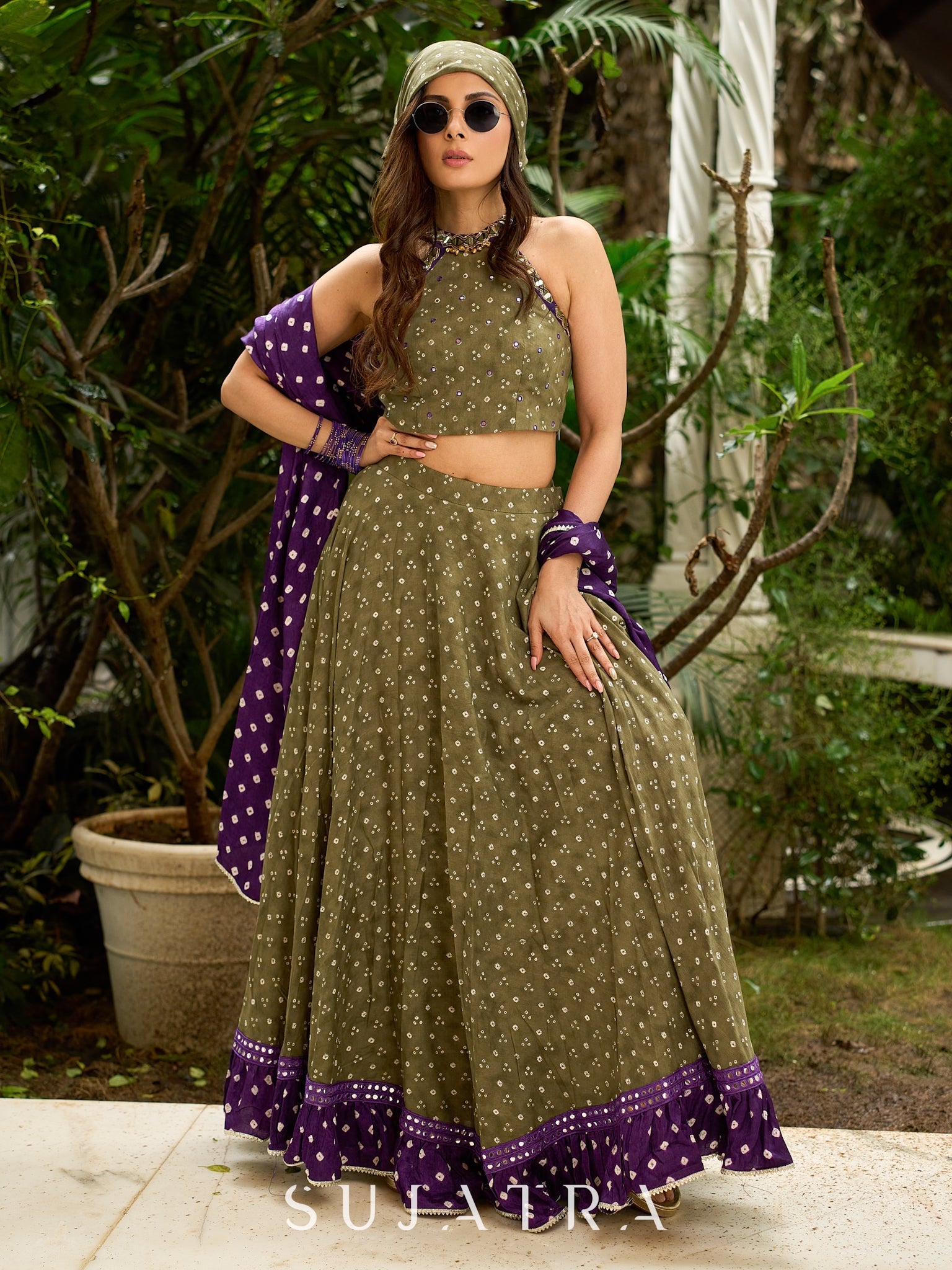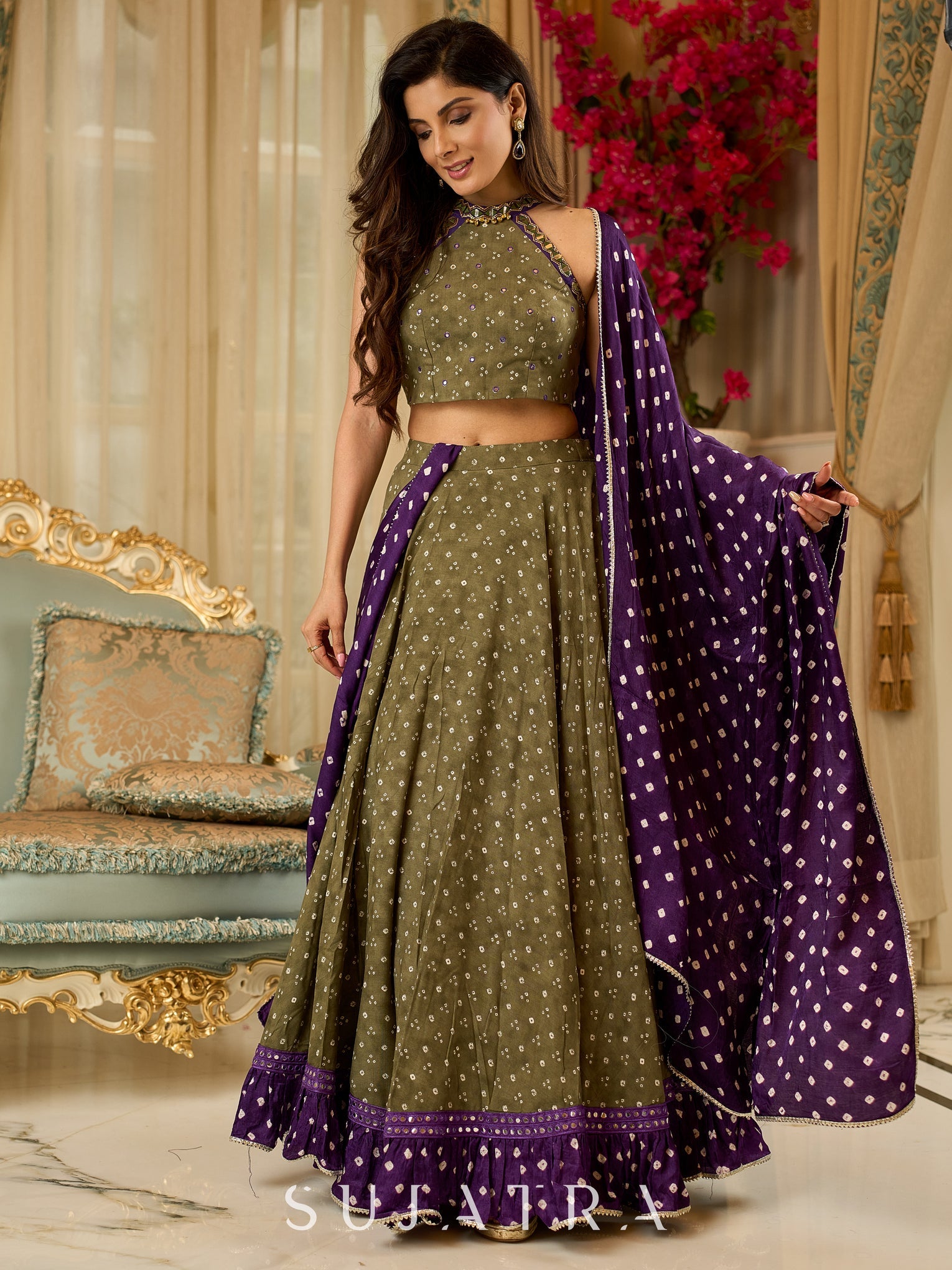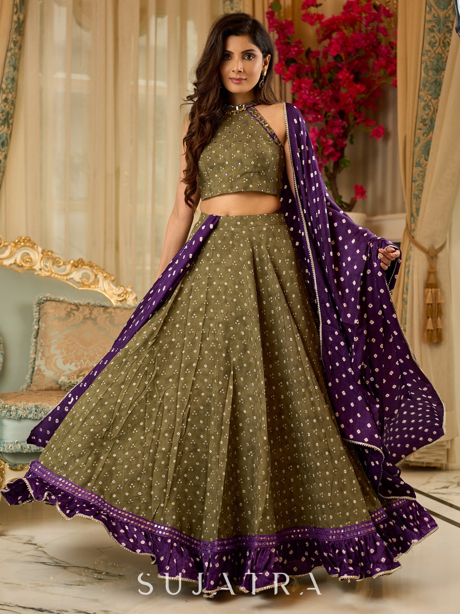 This Vibrant Mehendi green and purple bandhani lehenga is a beautiful and eye-catching piece. The mirrored halter neck choli adds a touch of elegance, while the matching dupatta completes the look. Perfect for any special occasion, this outfit will make you stand out in style.