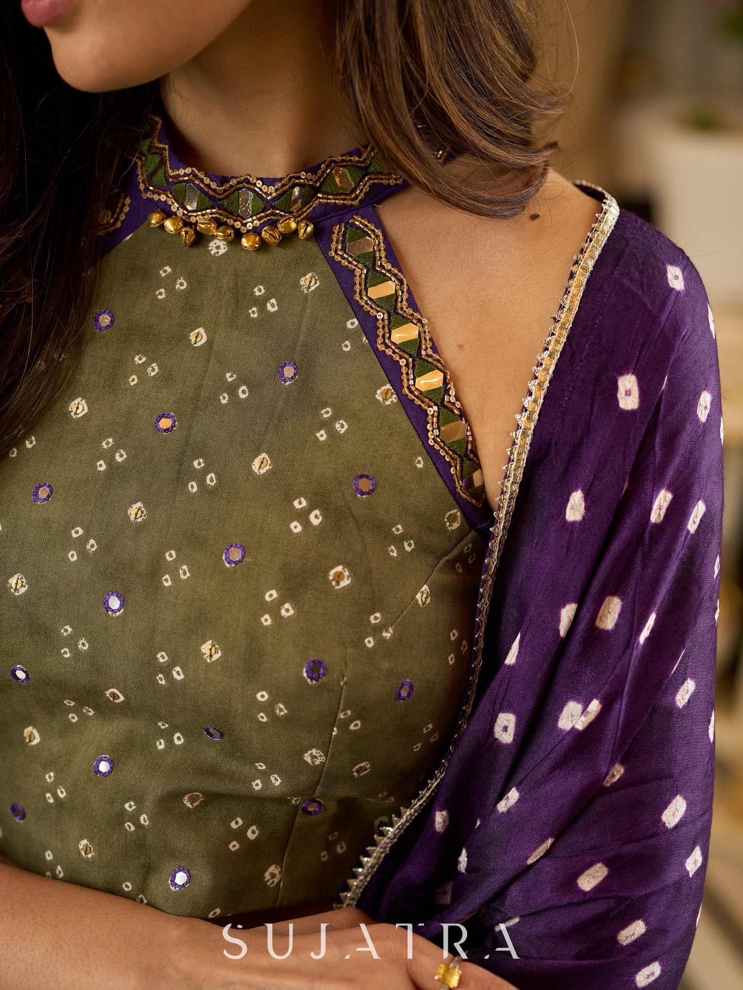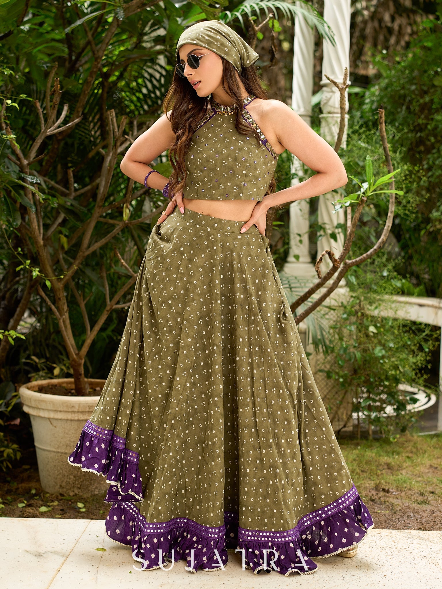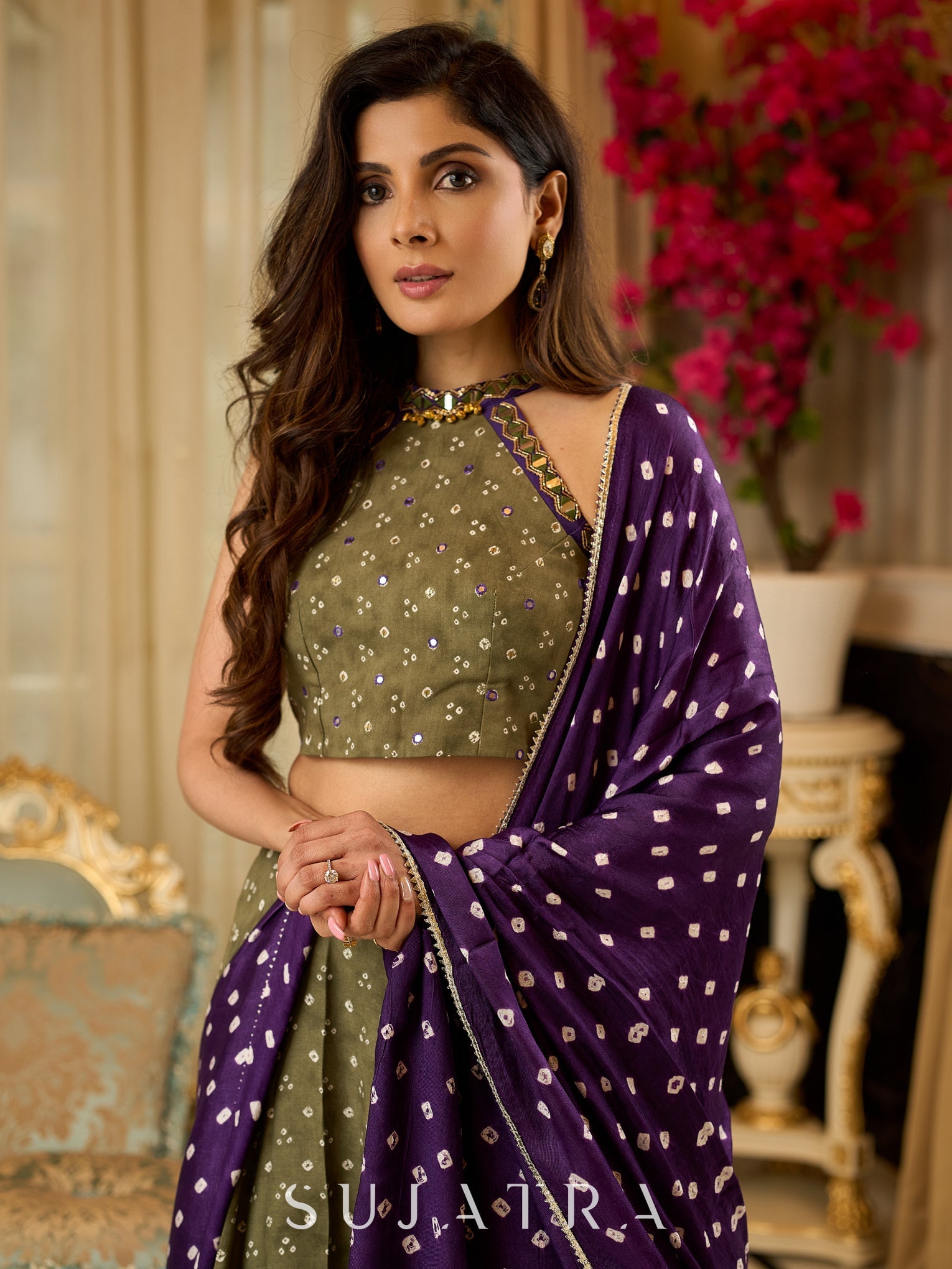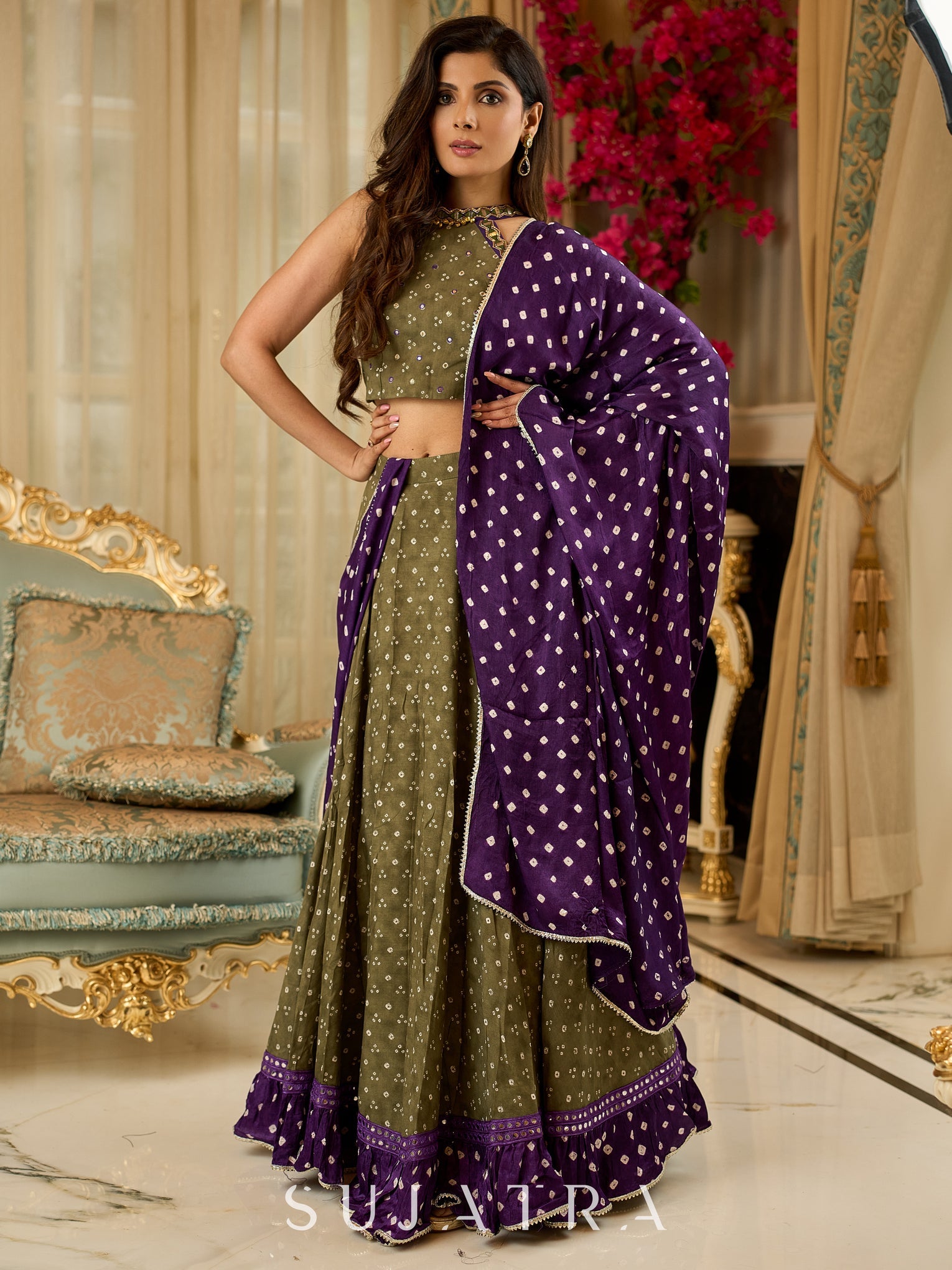 This Vibrant Mehendi green and purple bandhani lehenga is a beautiful and eye-catching piece. The mirrored halter neck choli adds a touch of elegance, while the matching dupatta completes the look. Perfect for any special occasion, this outfit will make you stand out in style.